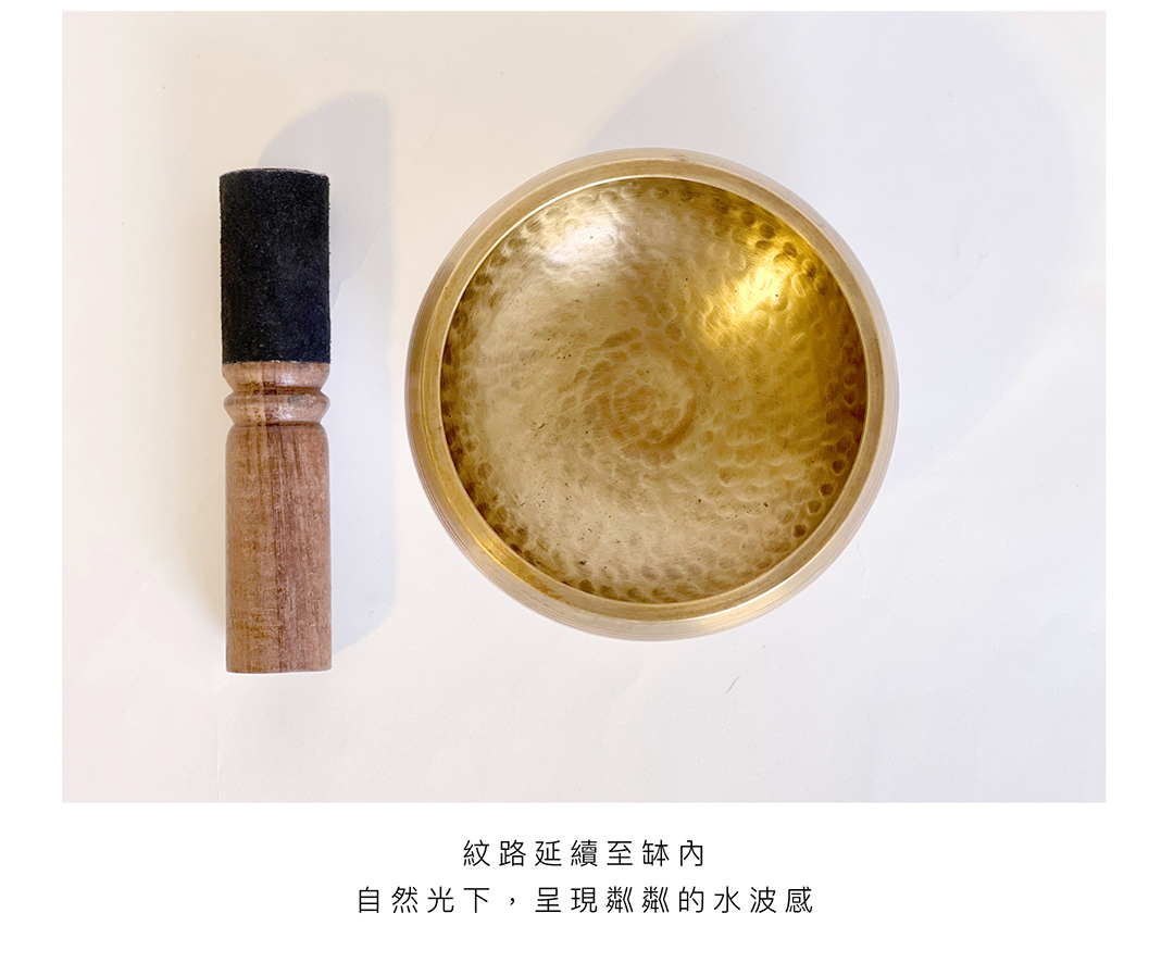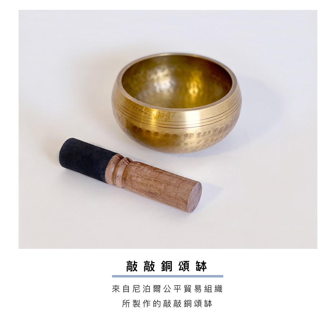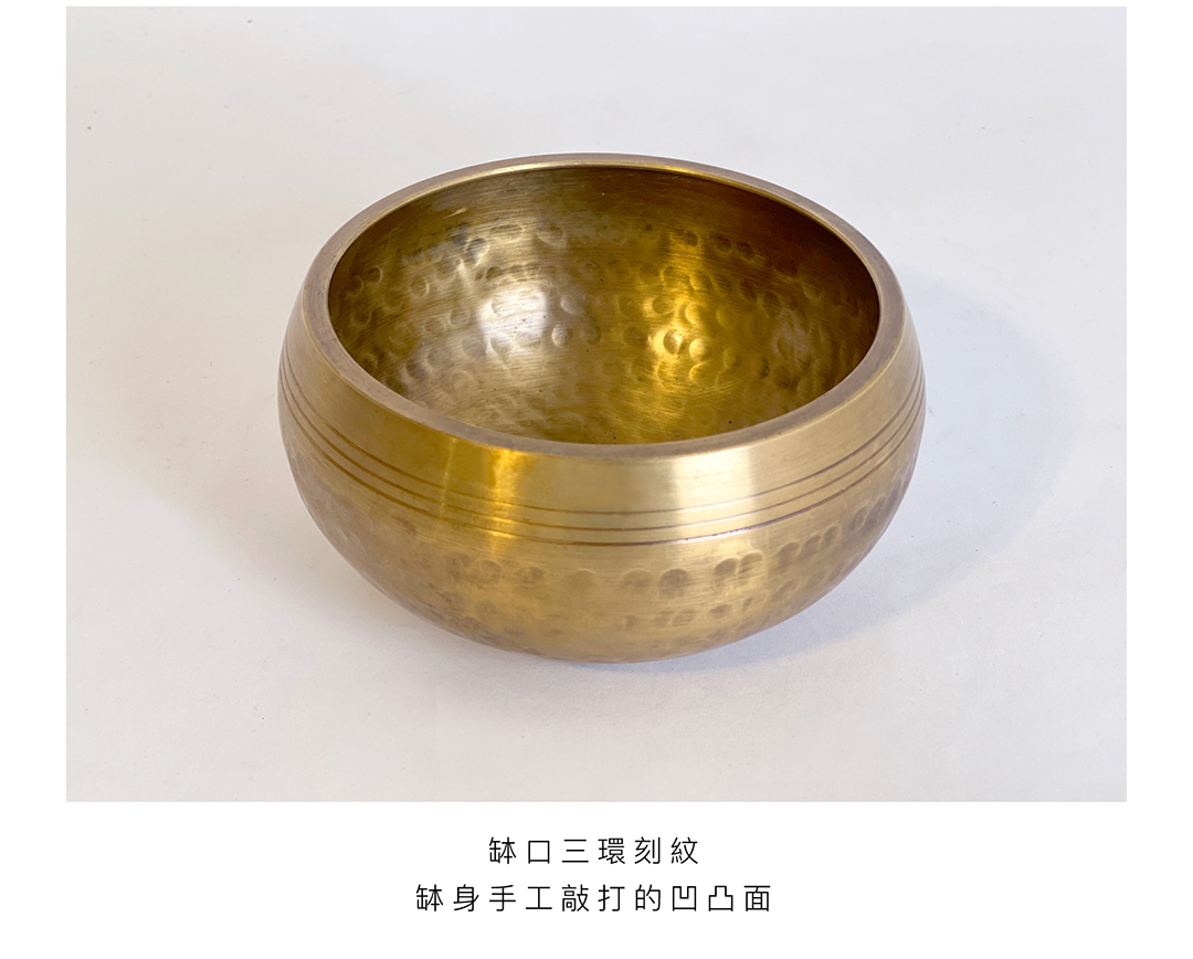 來自尼泊爾公平貿易組織 Mahaguthi 使用所製作的黃銅頌缽,缽身三環刻紋與手工敲打的痕跡,聲音與外觀的質地皆非常美麗,適用於瑜珈、冥想、聲音治療......等用途。