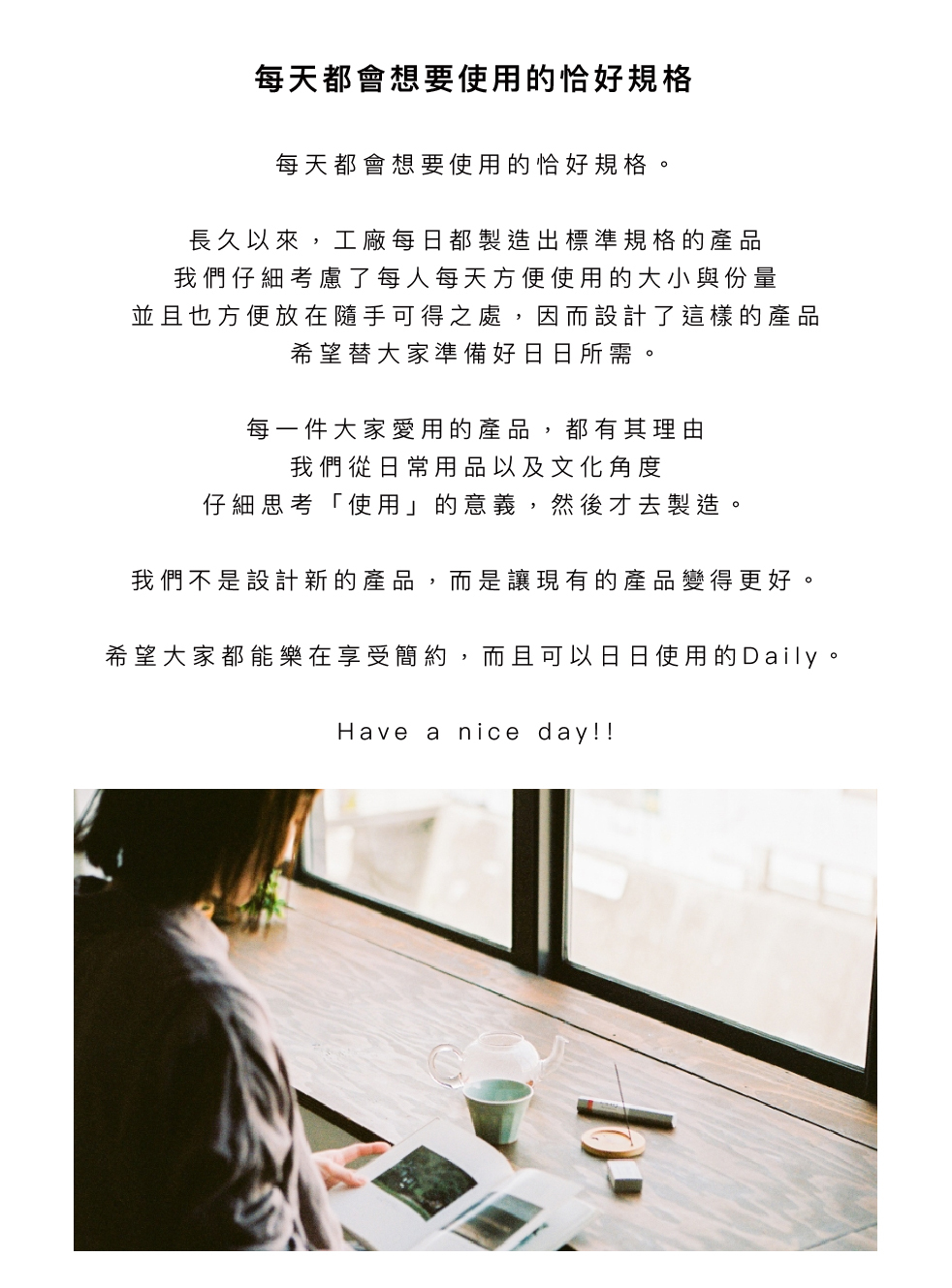 長久以來,工廠每日都製造出標準規格的產品。我們仔細考慮了每人每天方便使用的大小與份量,並且也方便放在隨手可得之處,因而設計了這樣的產品,希望替大家準備好日日所需。