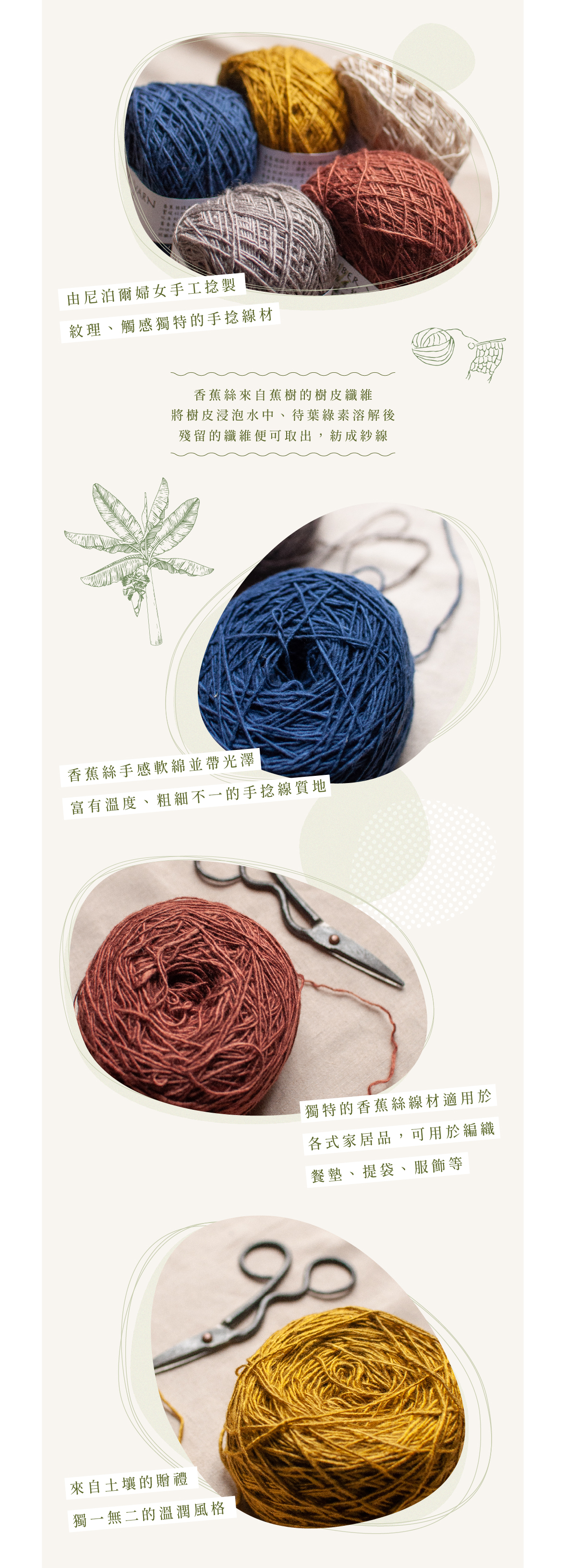 Eco-friendly banana bark cords, hand-twisted by Nepali women in fair trade groups, feature silky fibers with a subtle sheen. Versatile and beautiful, they are used in placemats, tote bags, and clothing.