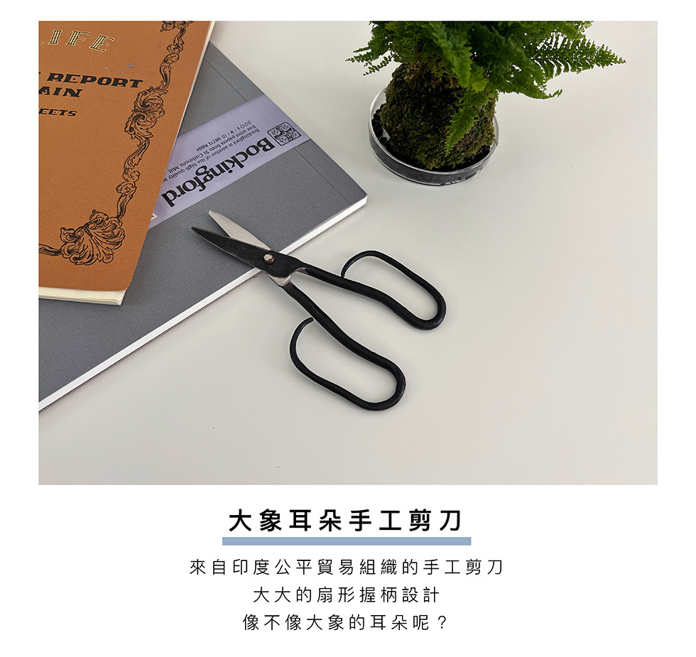 大大的扇形握柄設計,像不像大象的耳朵呢?來自印度公平貿易組織的手工剪刀。