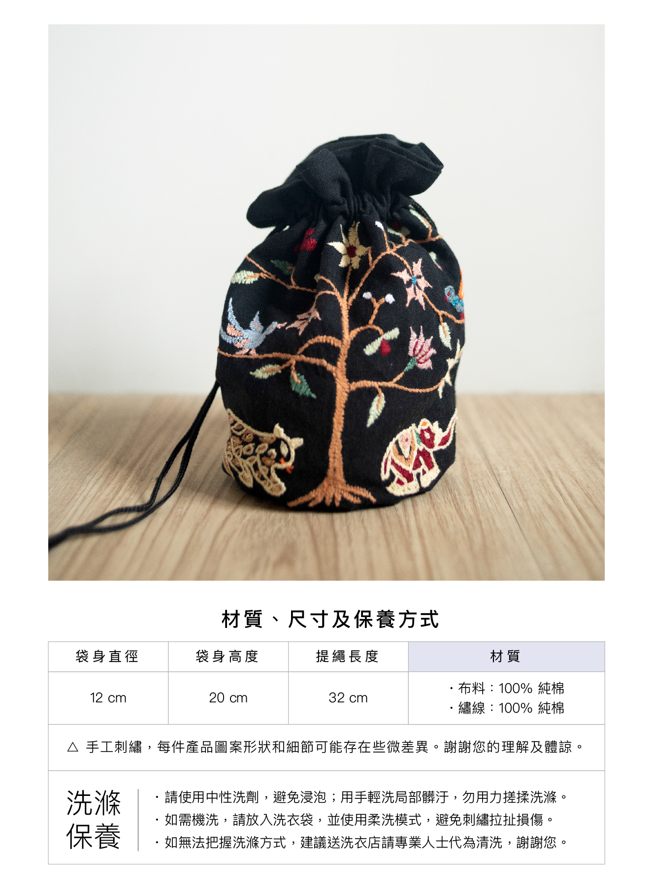 以刺繡掛布熱銷圖樣「生命之樹」製成的可愛束口小袋。