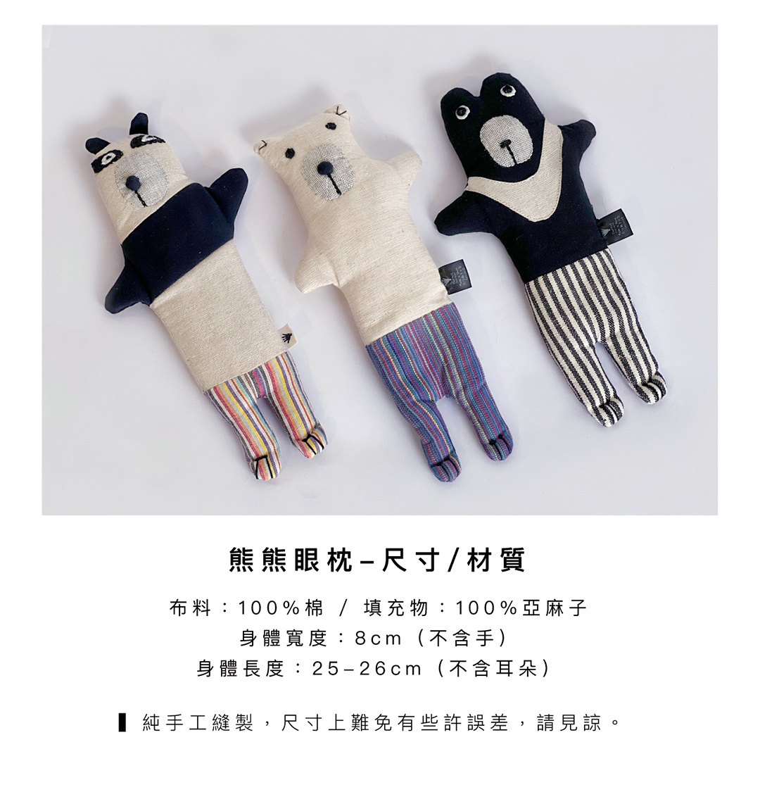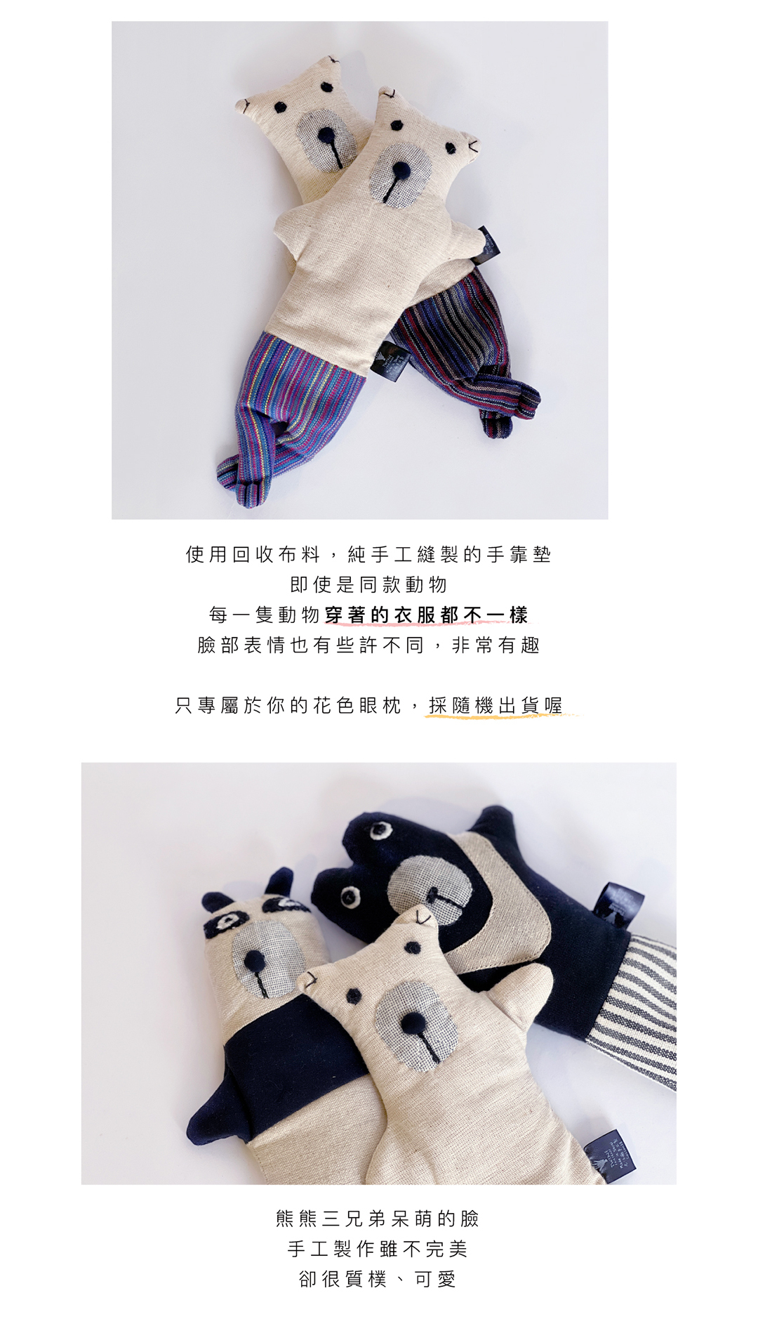 眼枕由公平貿易組織認證的生產者手工縫製,並使用回收布料製作,每一隻衣服的配色都不一樣喔!