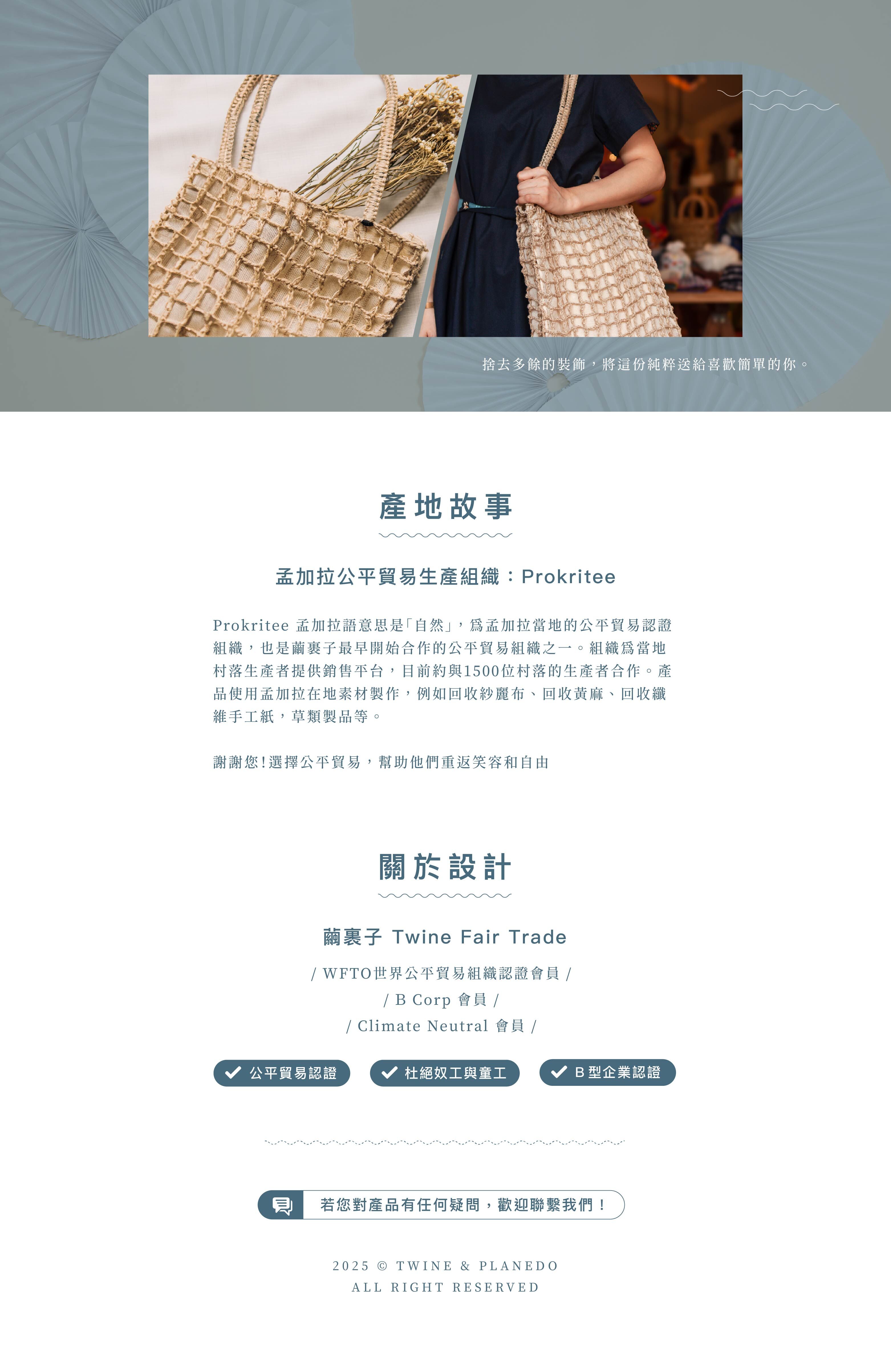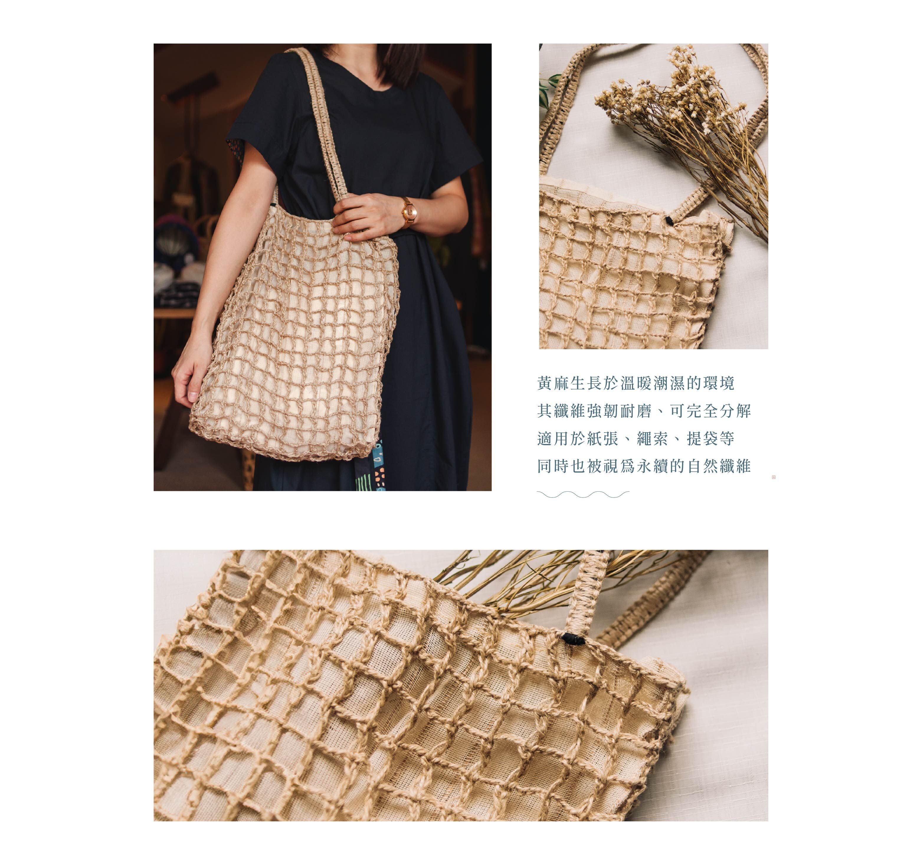 A tote made from hand-twisted jute yarns woven by Fair Trade Organization of Bangladesh. The sturdy jute and geometric aesthetics of the checkered pattern give a simple tote a unique posture.