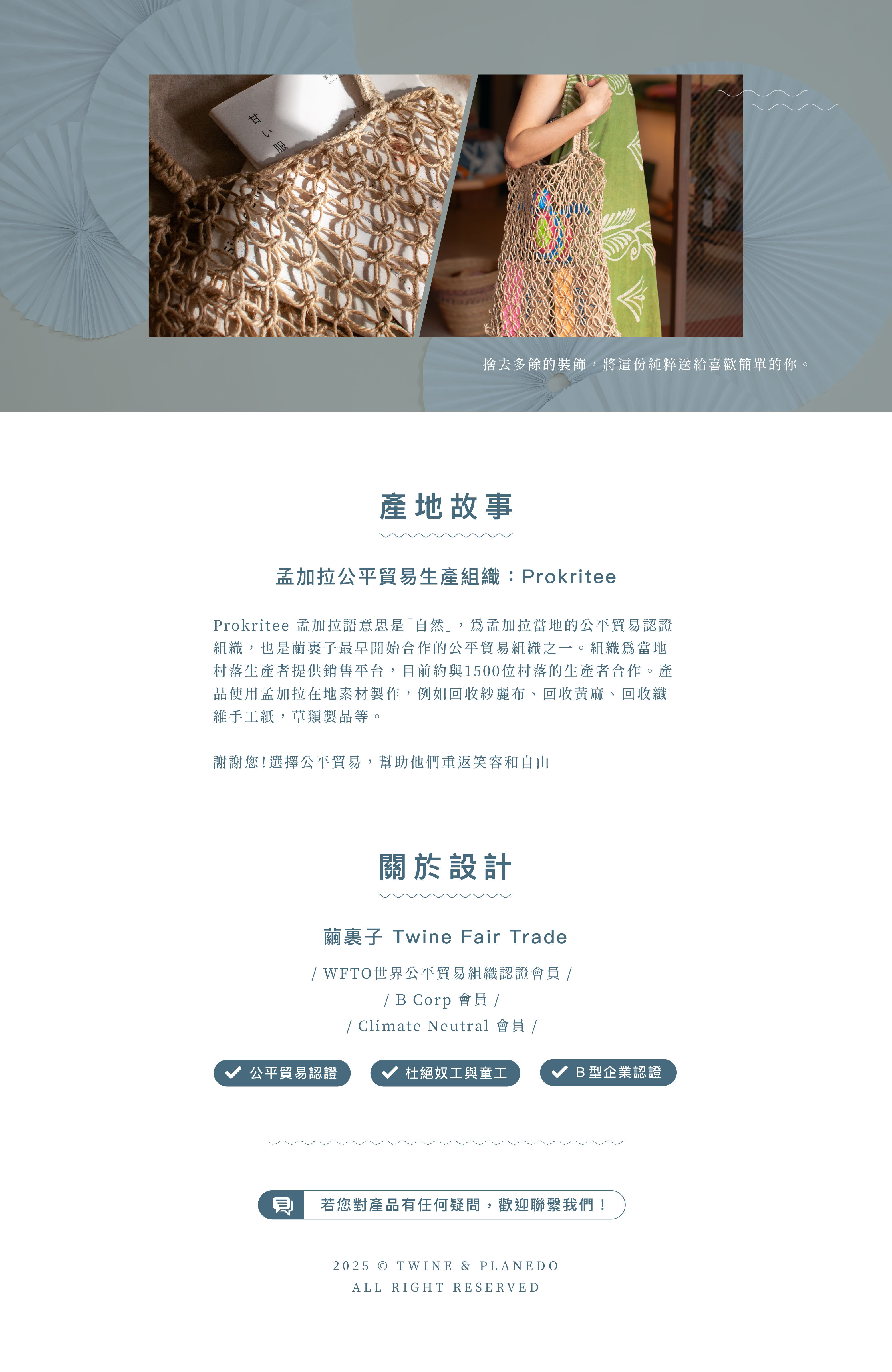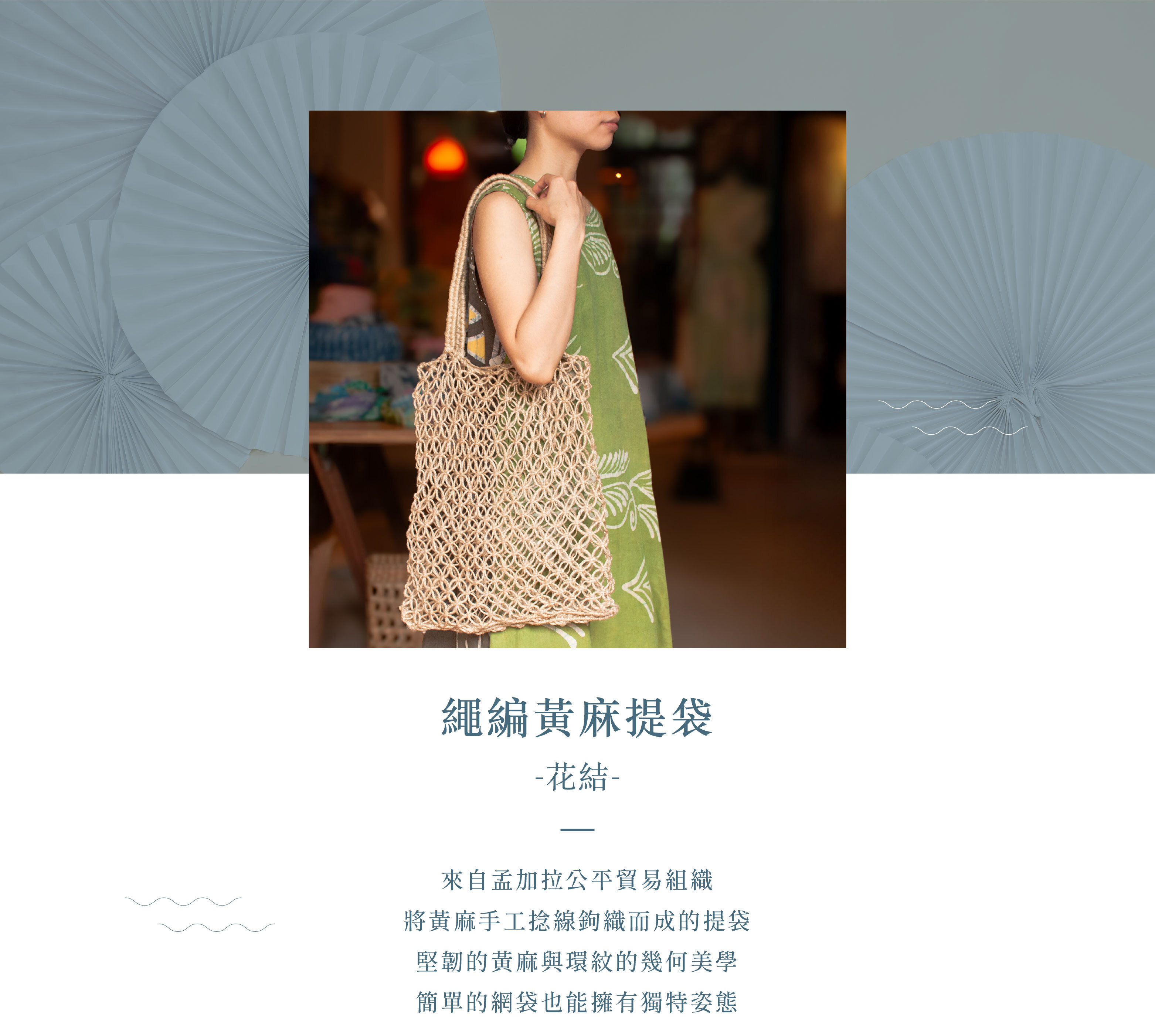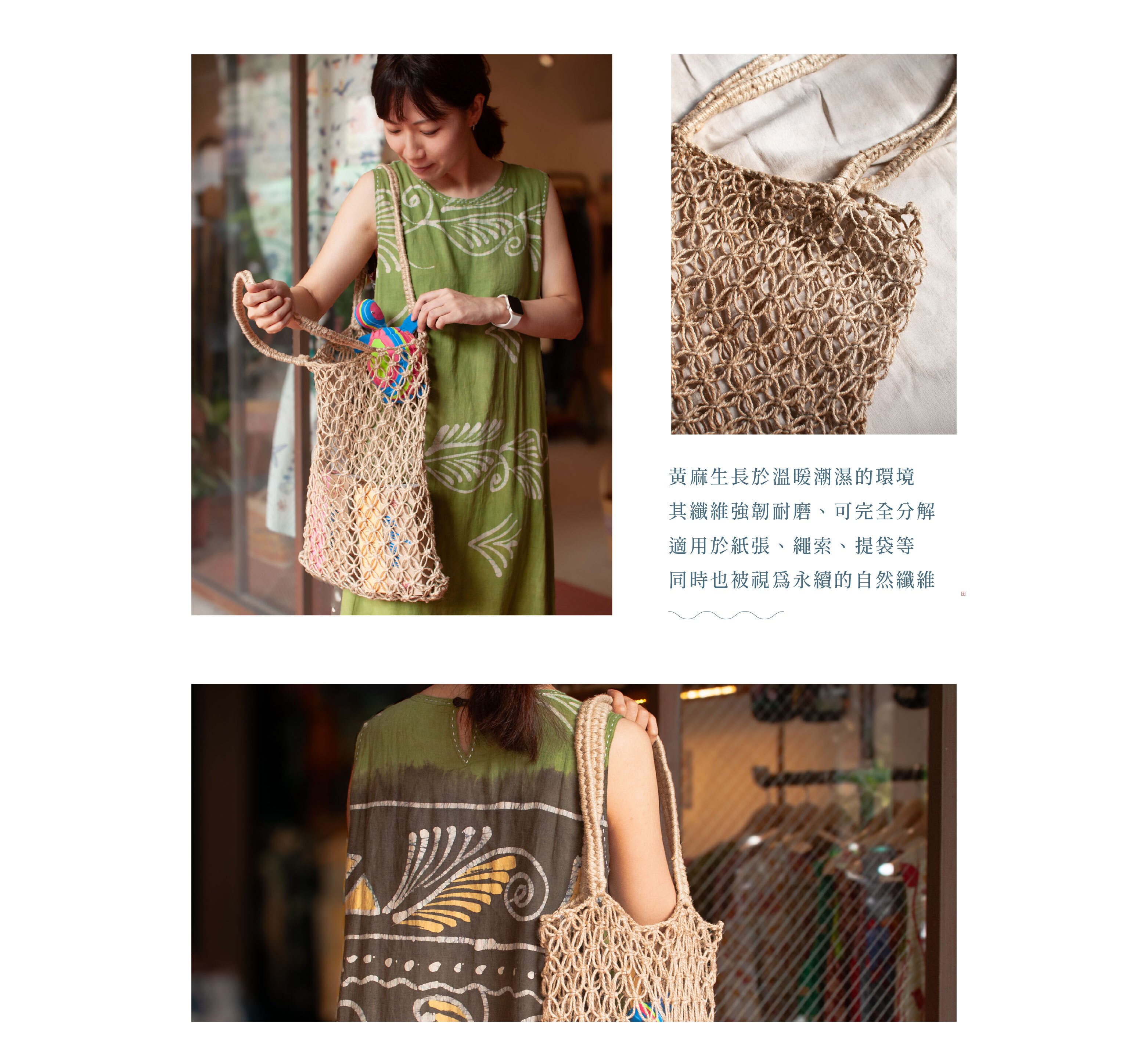 This net bag is handwoven using jute yarn from Bangladesh's fair trade organization. The durable jute combined with a geometric aesthetic of circular patterns gives this simple net bag a unique character.