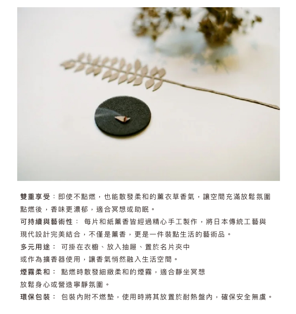 可以將它掛在牆上,為空間增添香氣與美感;也可以夾在信中,將香氣傳遞給重要的人;或是點燃後享受它徐徐飄散的香氣。薰香與和紙的結合,創造出一種貼近生活的新香氛形式。