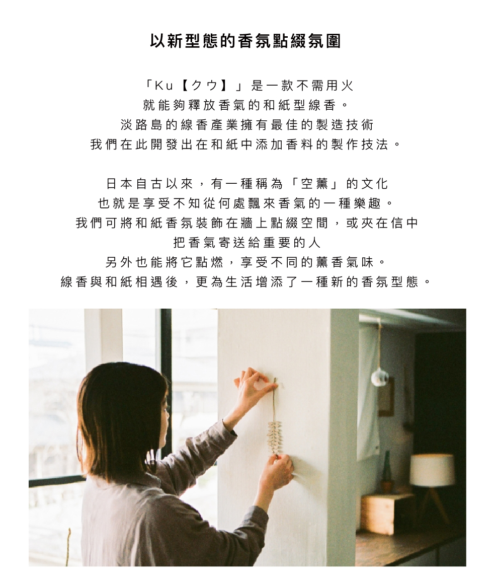 「Ku【クウ】」 是一款即使不點燃也能散發香氣的和紙薰香。它誕生於淡路島香品產業所擁有的高超技術,透過將香料融入和紙的漉紙工藝製作而成。