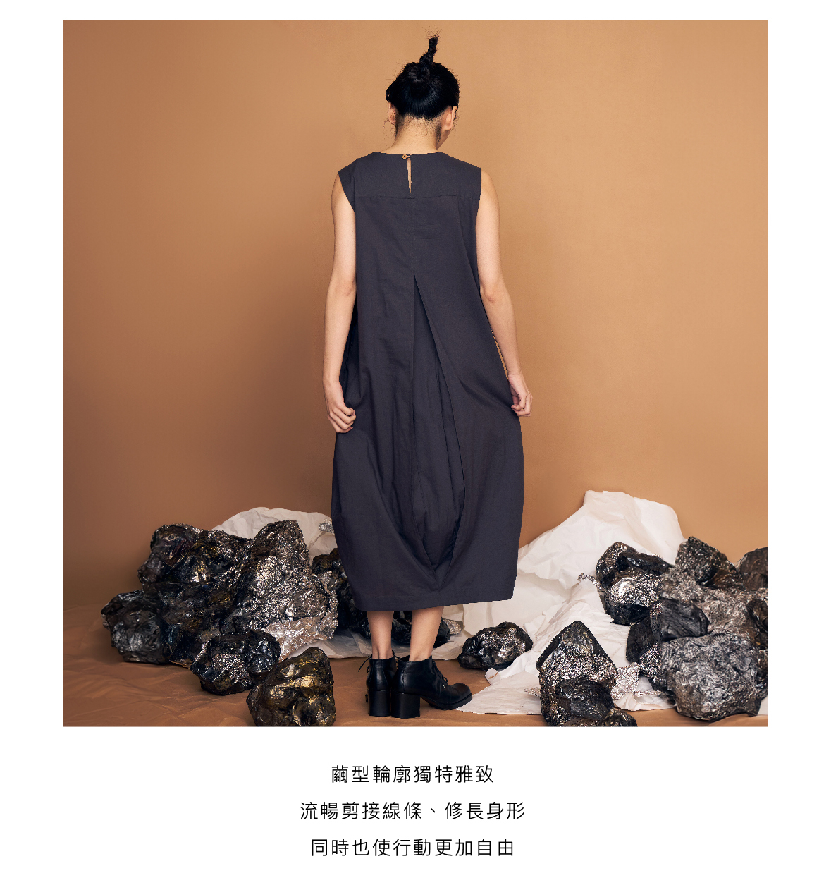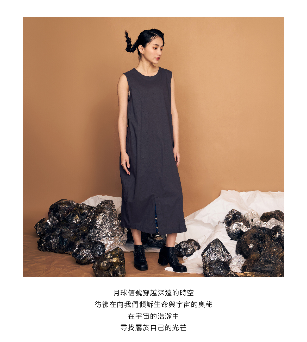 The elegant cocoon silhouette, like the smooth trajectory of a planet cruising through the universe. Wearing the Lunar Signal Sleeveless Dress, embark on your own magical journey.