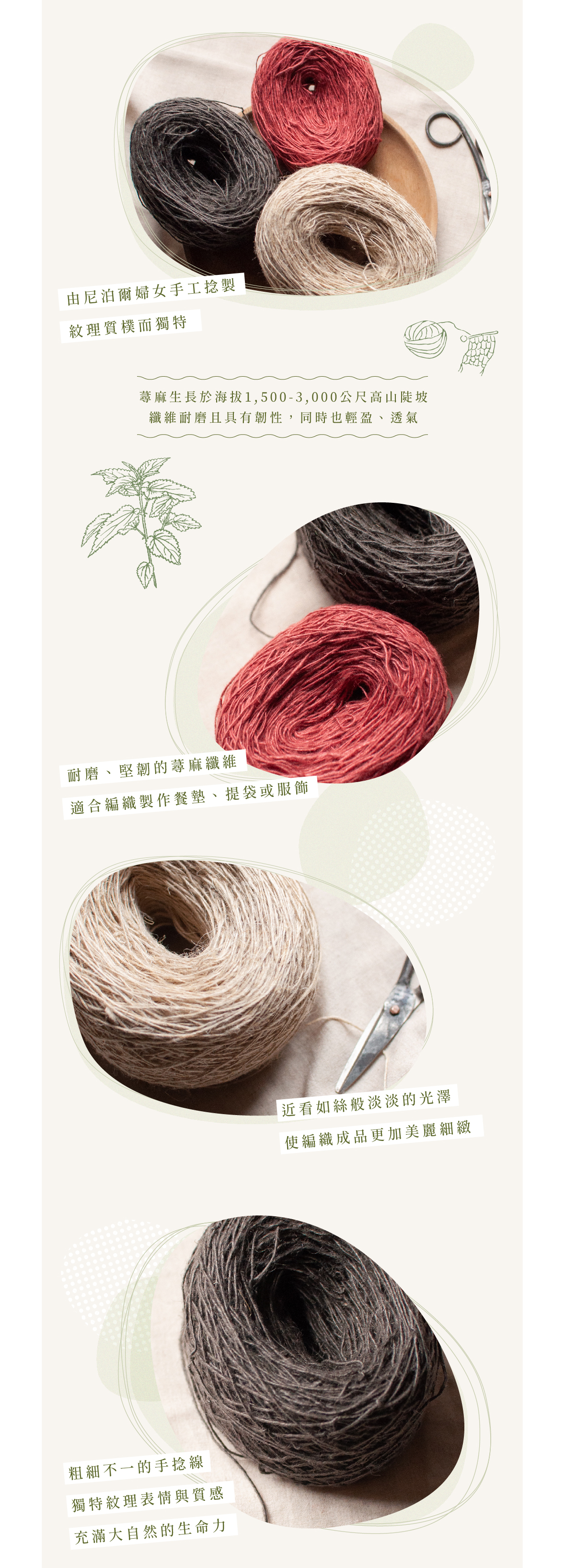Handcrafted by women from Nepal's Fair Trade Organization, this nettle fiber yarn is strong yet delicate, with a subtle silk-like sheen. It's used in placemats, tote bags, clothing, and more, offering both durability and beauty.