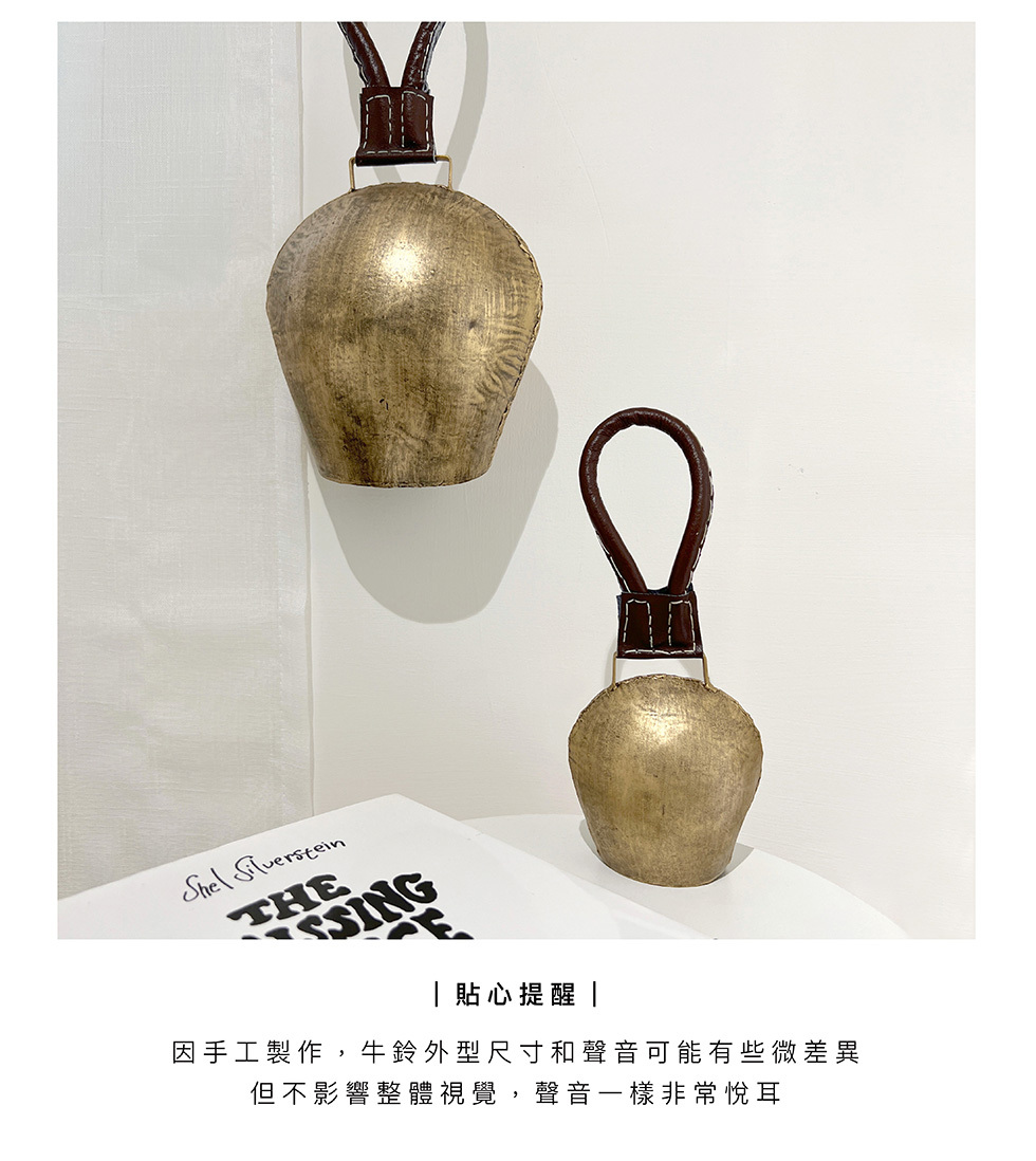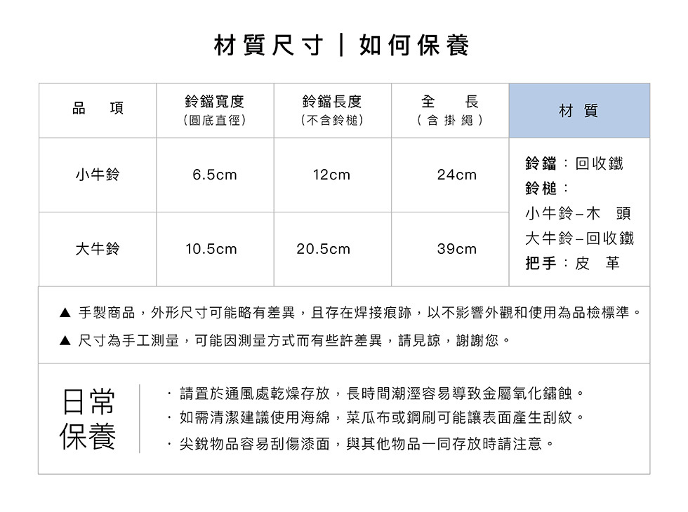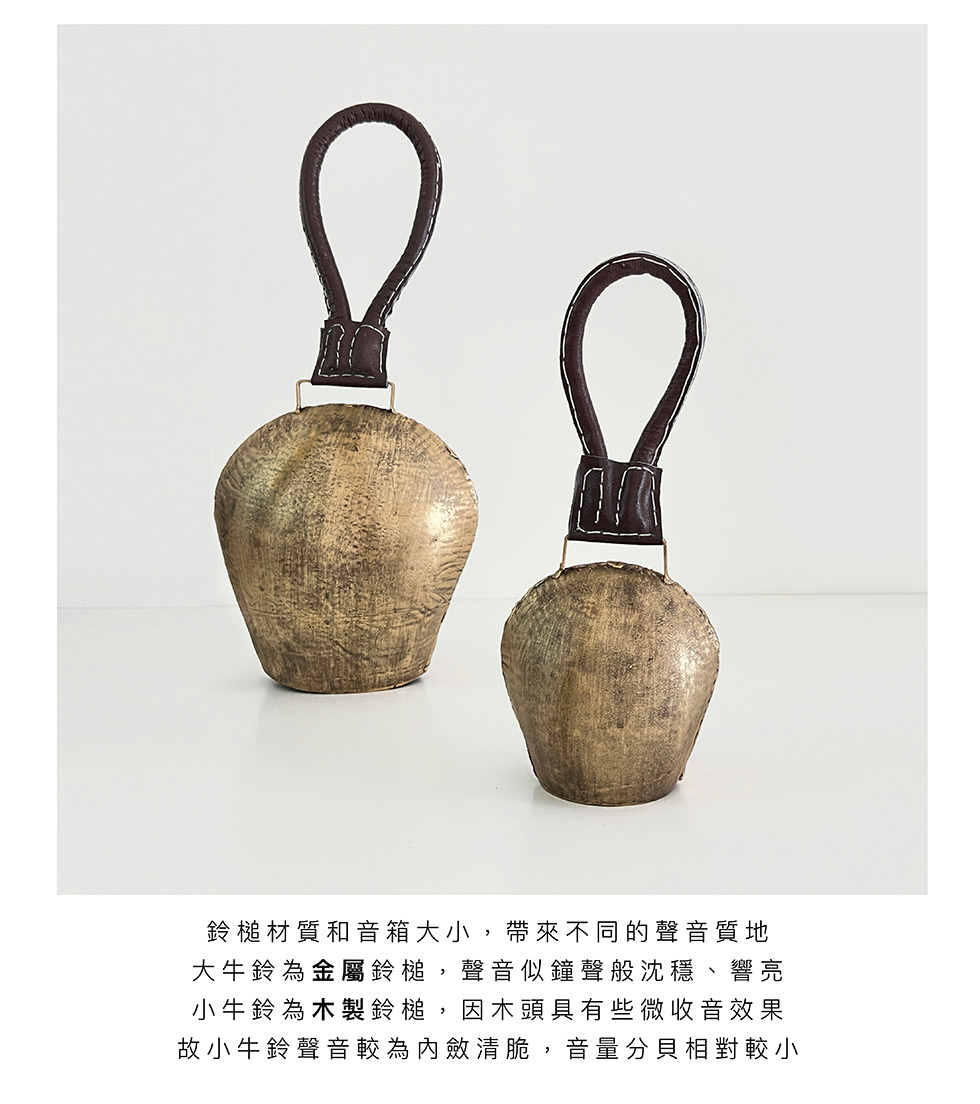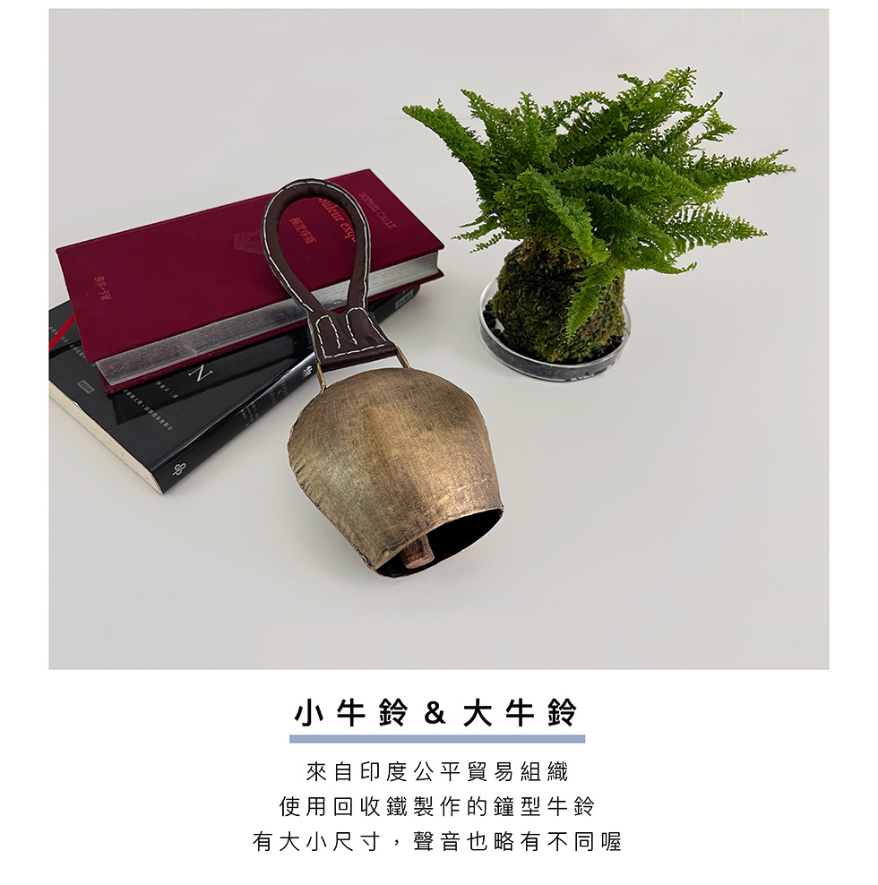 使用回收鐵製作的鐘型牛鈴,手工感的焊接面和顏色,質樸復古,有大小尺寸,聲音也略有不同喔,來自印度公平貿易組織手工製作。