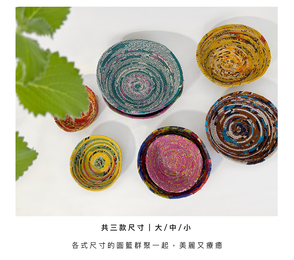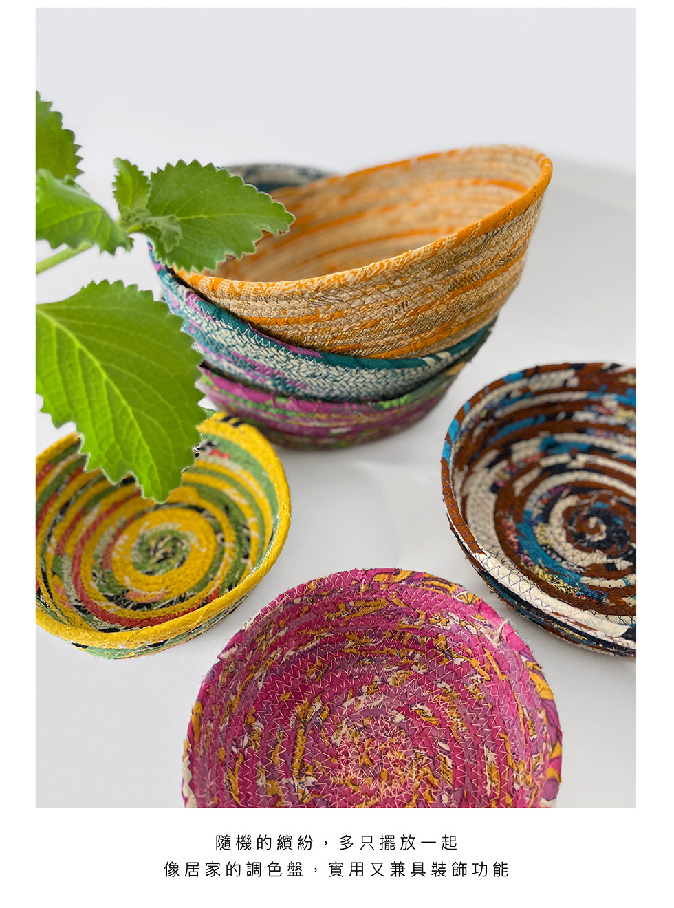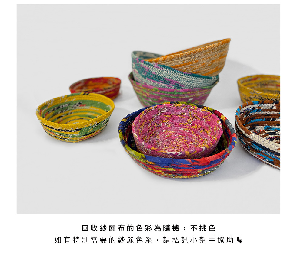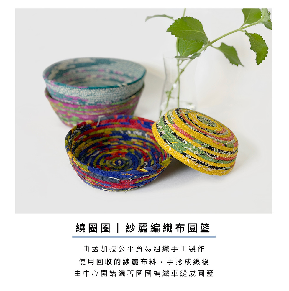 紗麗編織布圓籃,由孟加拉公平貿易組織使用回收紗麗布料製作,每一只色彩皆不相同,繽紛又獨特,軟軟的布材質也很好收納存放,美麗又實用的生活中好幫手。