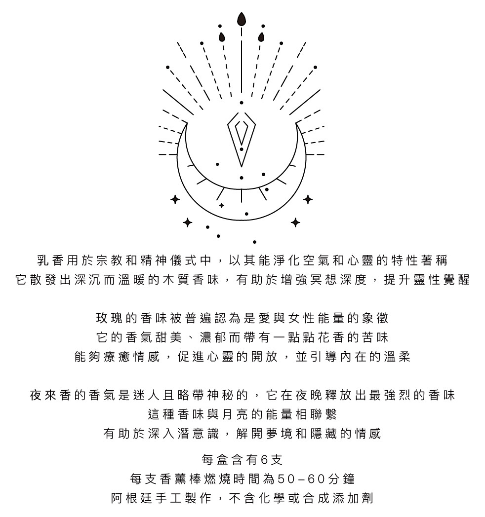 祈福、冥想或獨處時刻的神聖伴侶,營造充滿神秘、浪漫與靈性的氣氛。