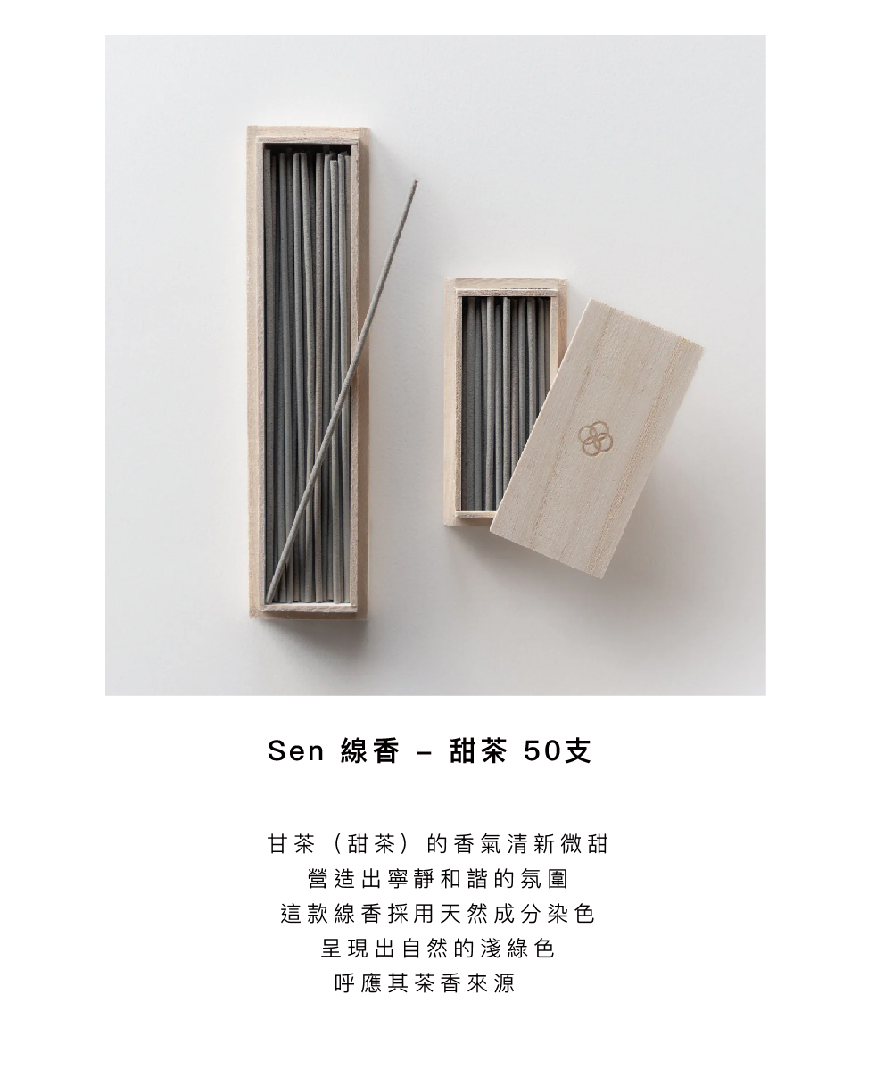 甘茶(甜茶)的香氣清新微甜,營造出寧靜和諧的氛圍。這款線香採用天然成分染色,呈現出自然的淺綠色,呼應其茶香來源。