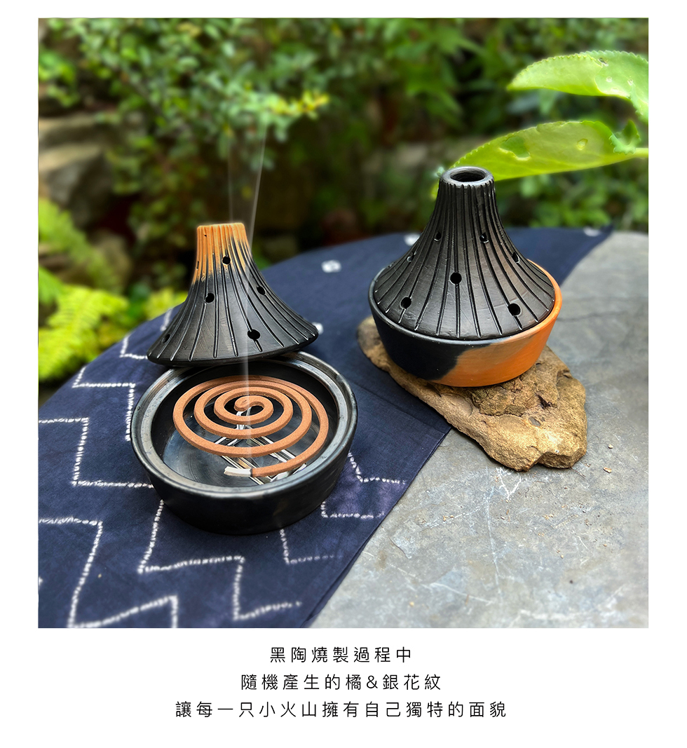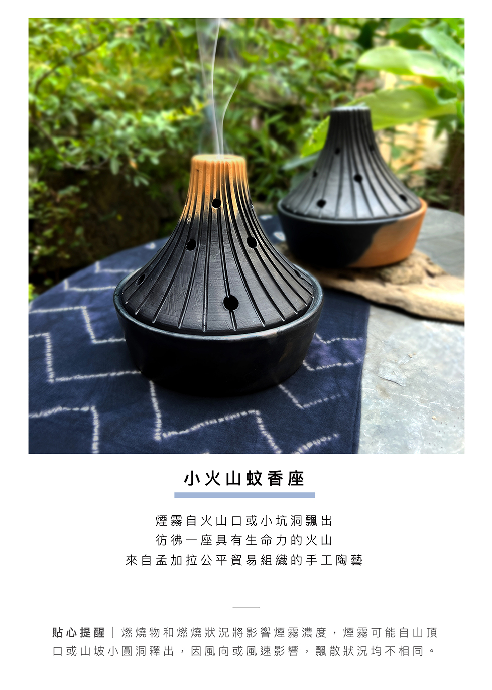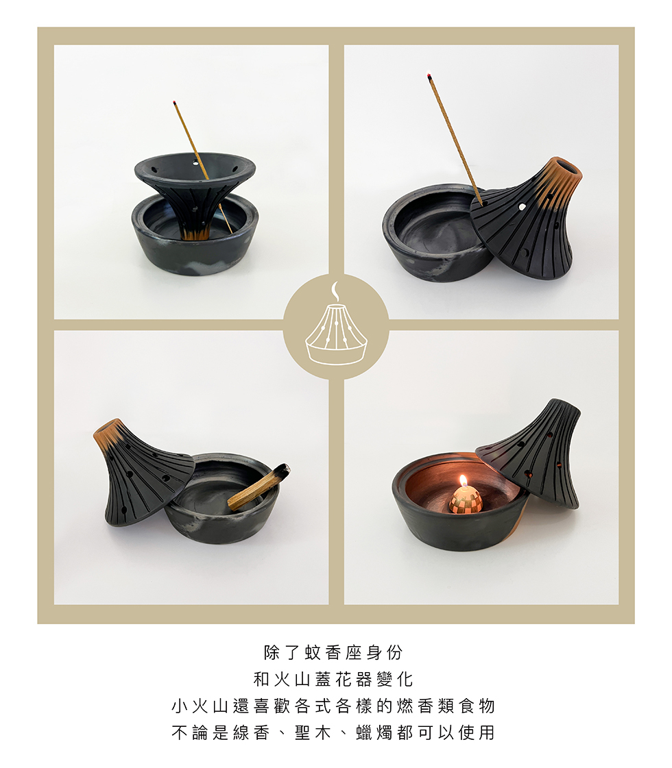 優雅可愛的小火山盤香座,煙霧自火山口或小坑洞飄出,彷彿一座具有生命力的火山,除了盤香,線香&聖木&蠟燭也適用,火山口蓋也可獨立作為乾燥花器,非常美麗, 來自孟加拉公平貿易組織的趣味想像之作。