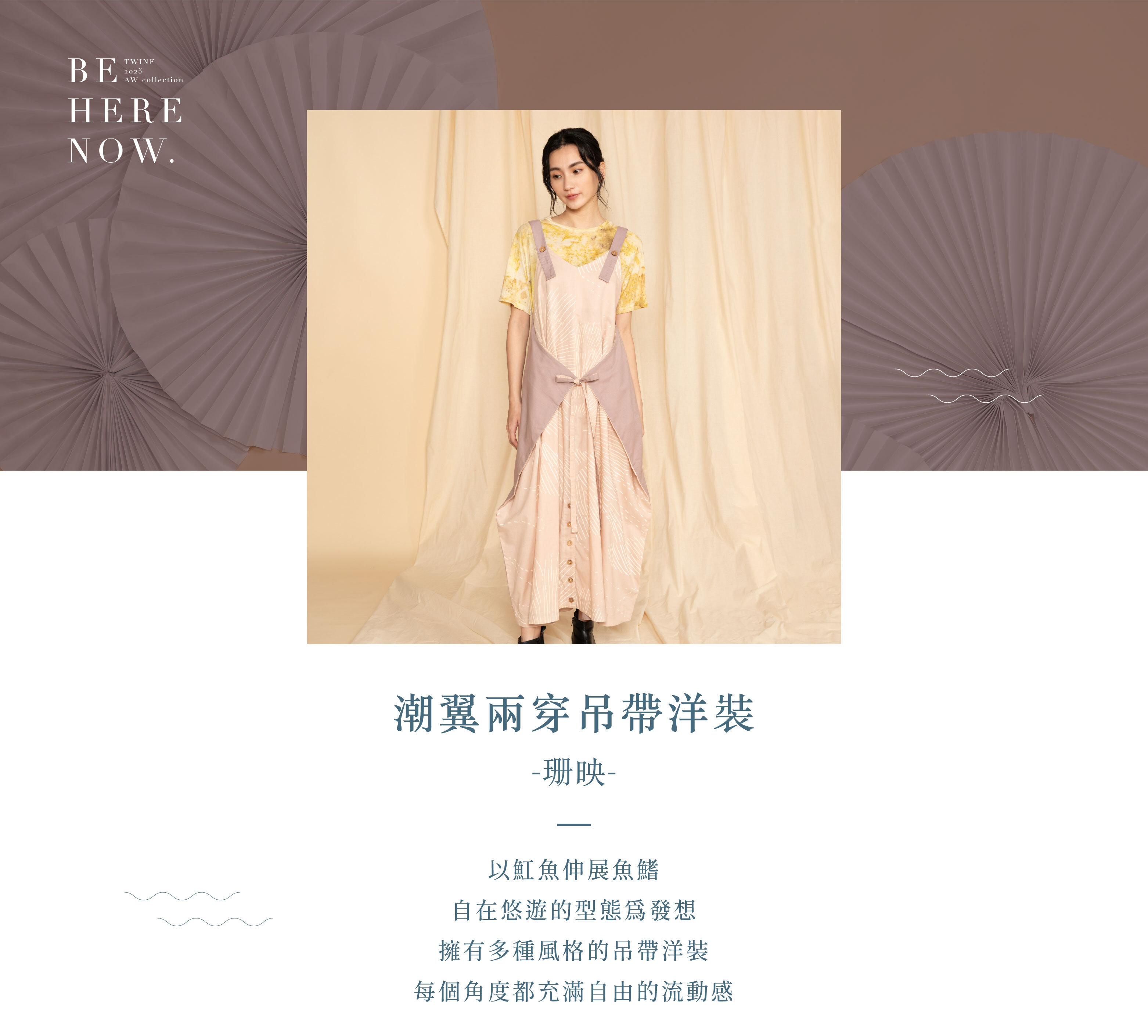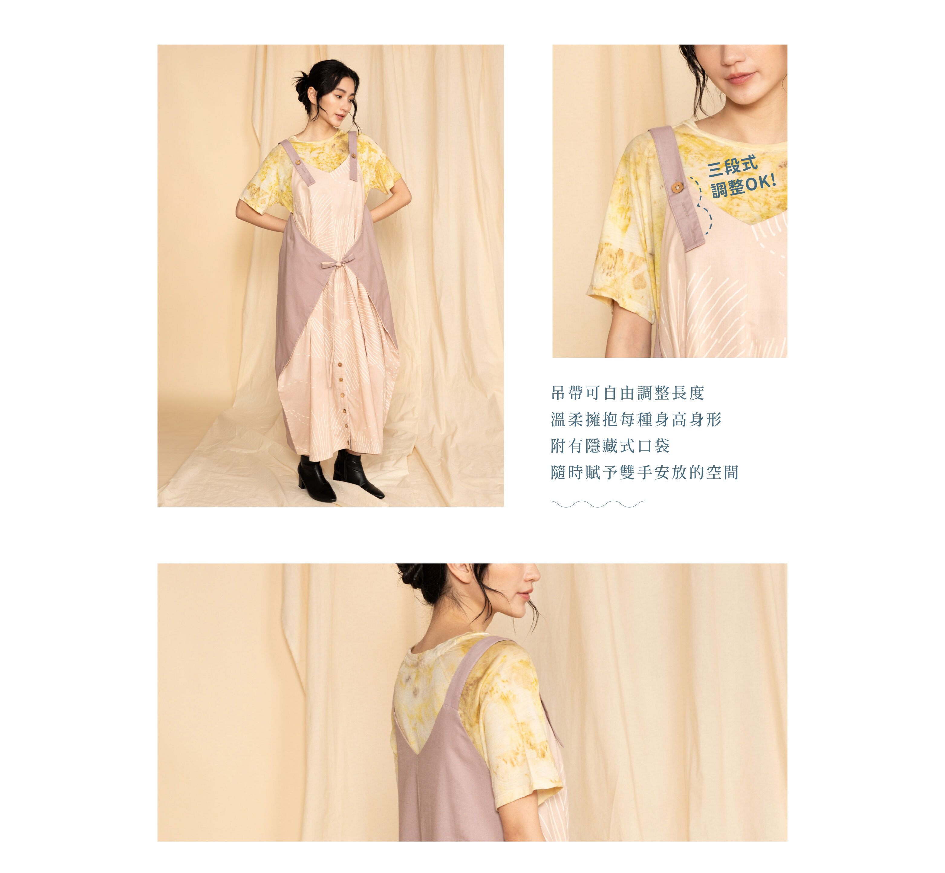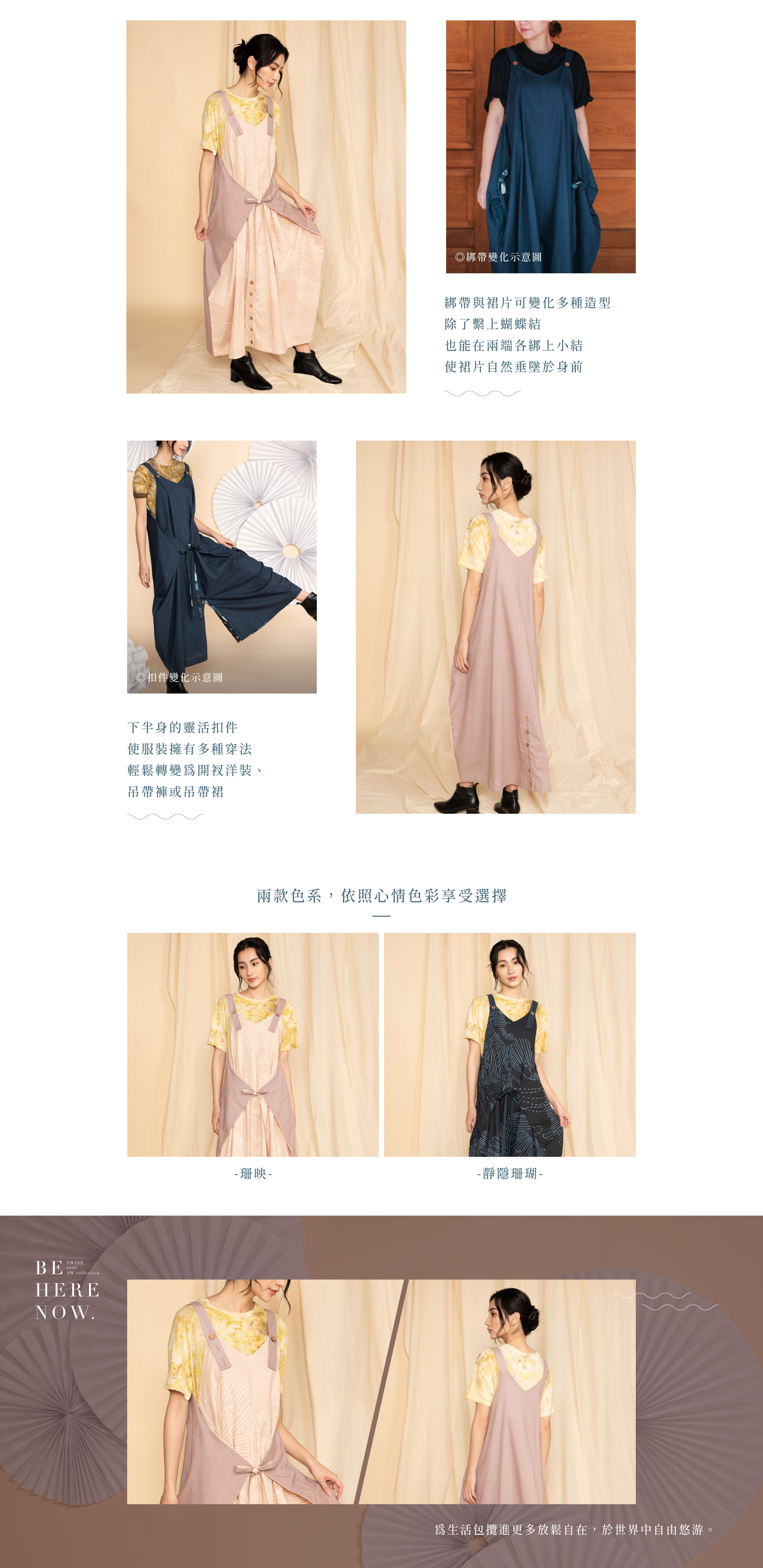 可調式吊帶設計,貼心適應不同身高。綁帶摺片隨身形靈活變化,宛如潮間優游的優雅魟魚,輕鬆展現多樣風格。附扣件設計更添巧思,可隨心轉換為裙裝或褲裝,讓日常穿搭自由舒展。