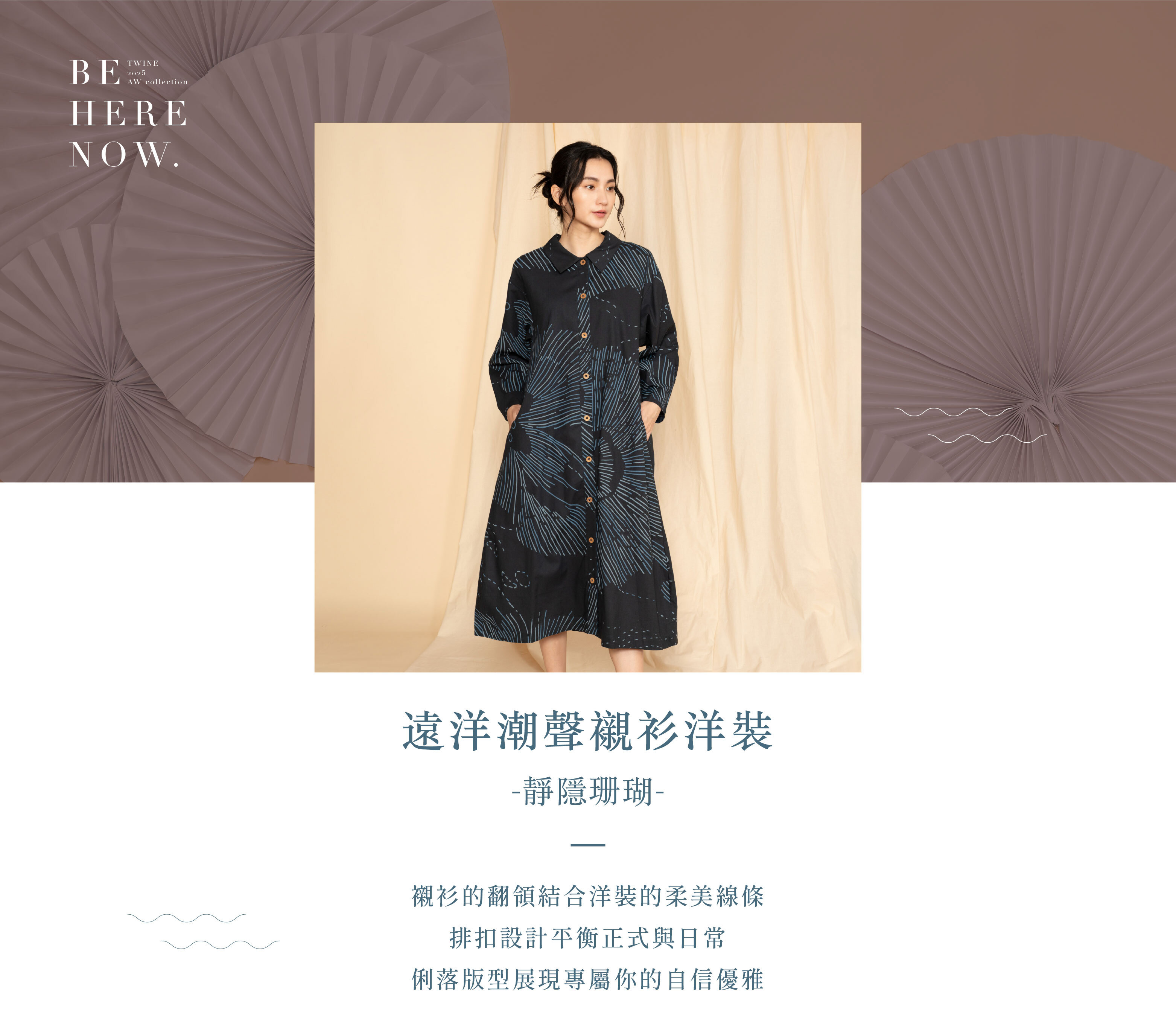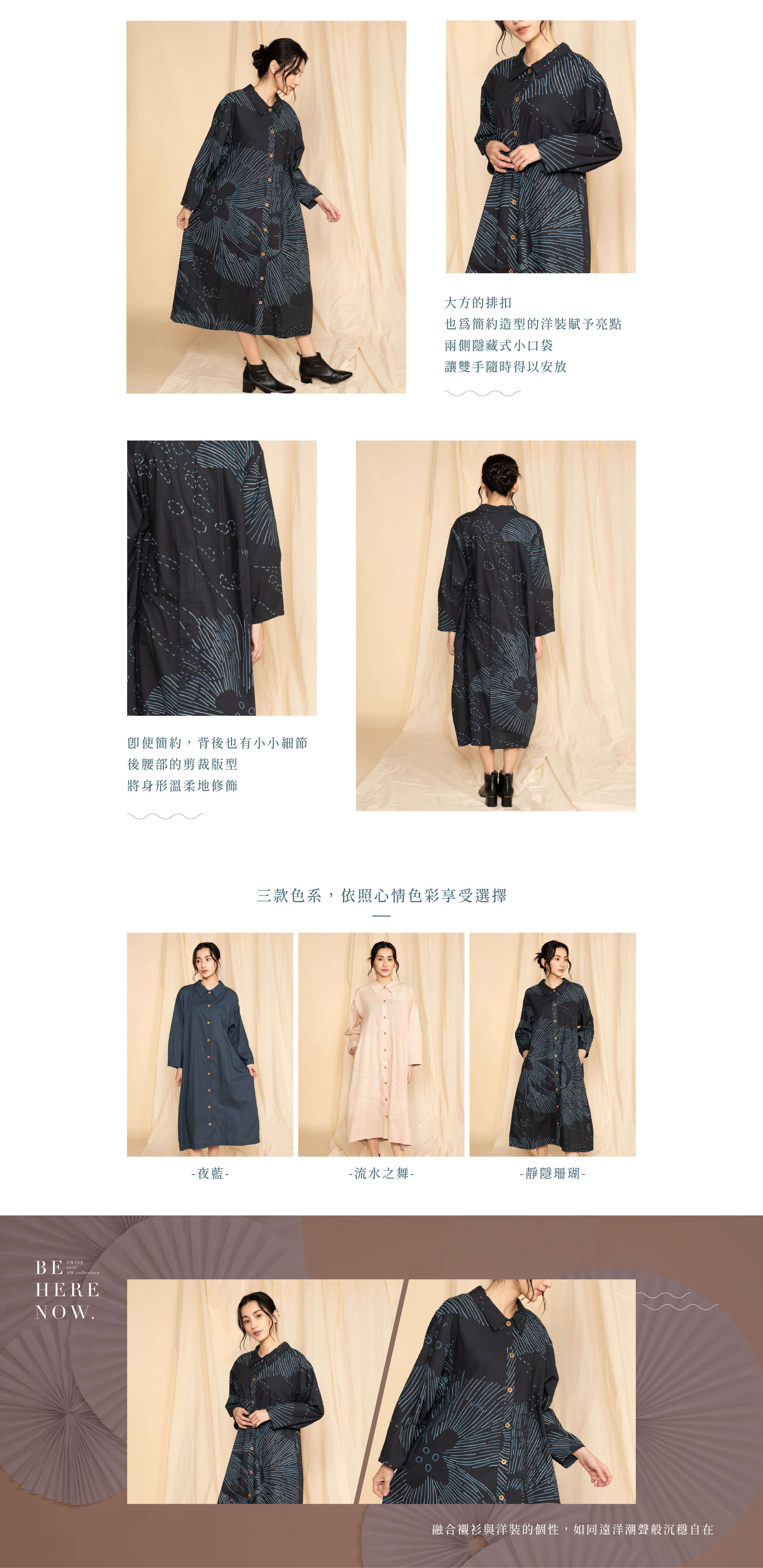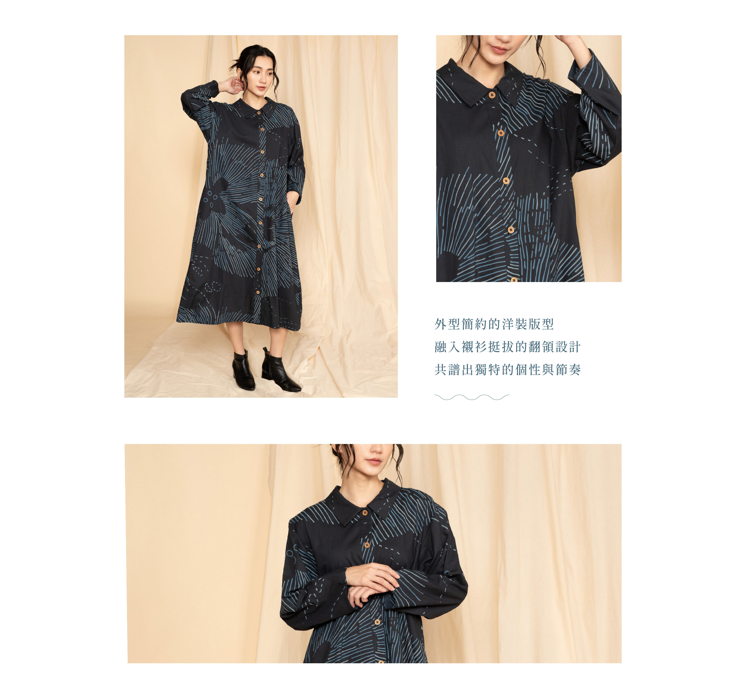 如同遠洋的潮聲般沉穩自在,將襯衫的挺拔翻領與洋裝的柔美線條結合,以排扣勾勒出正式與日常之間的平衡。版型俐落卻不失親和,無論身處何種場合,都能展現專屬自身的自信與優雅。