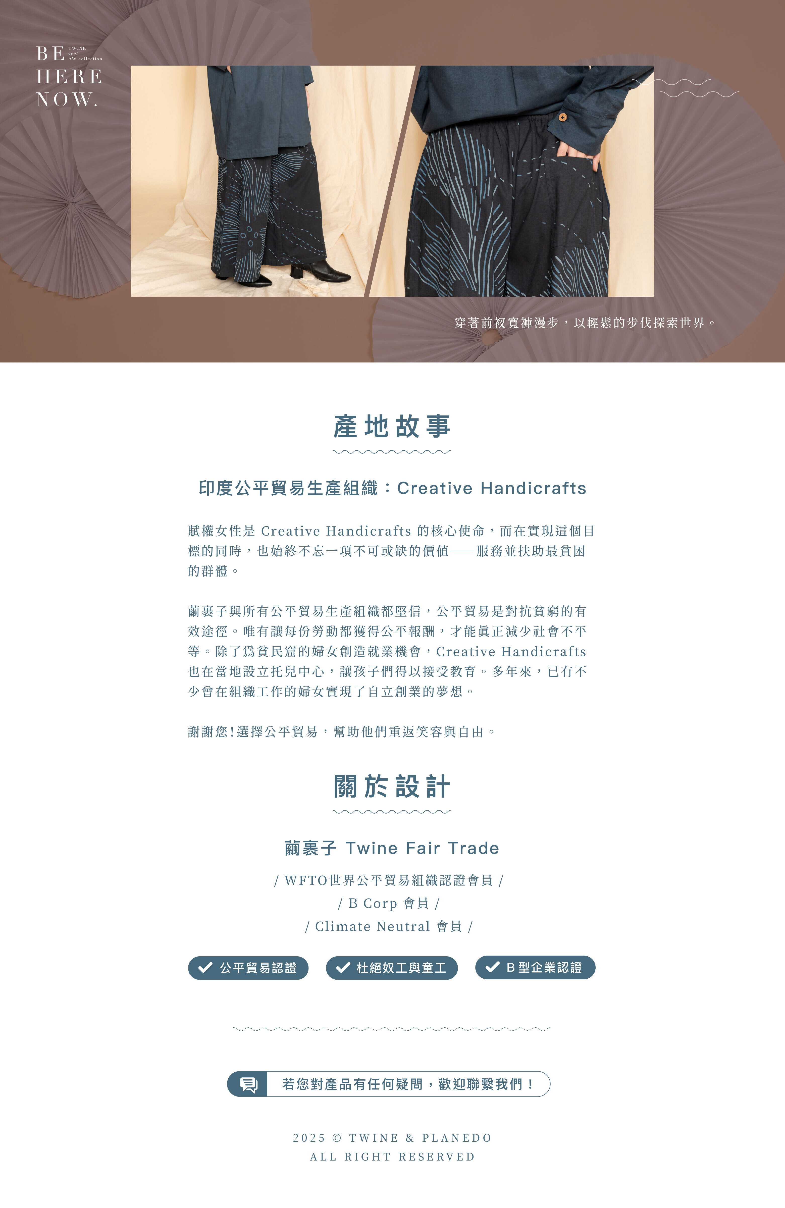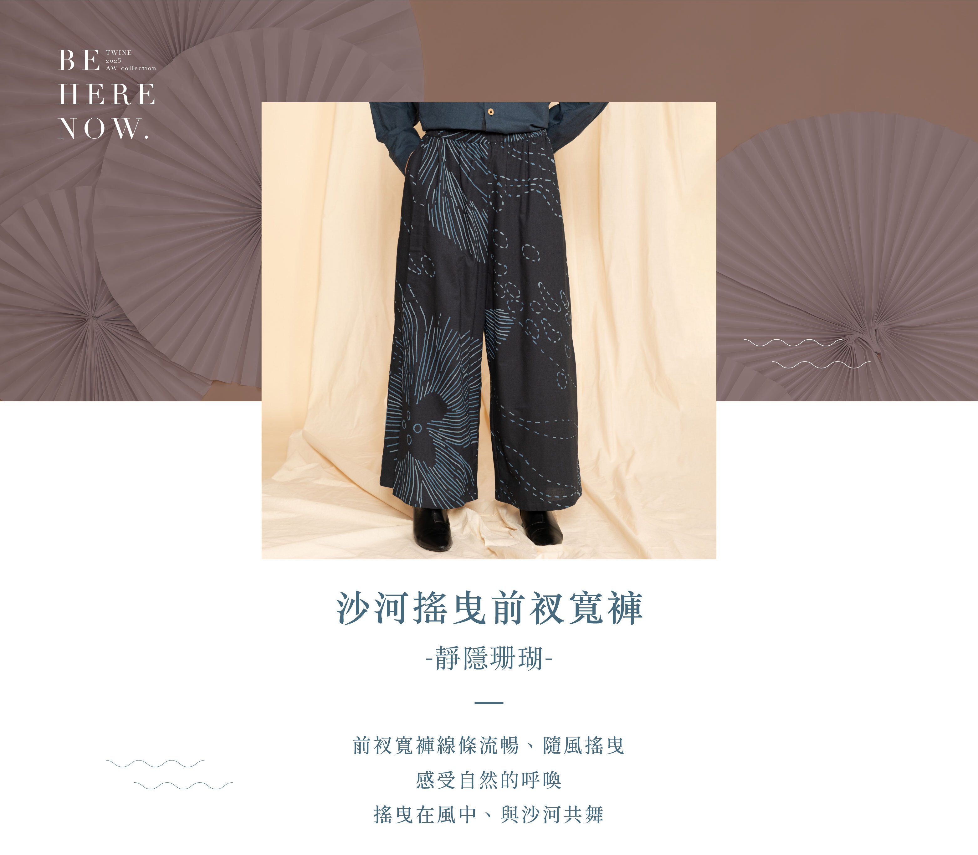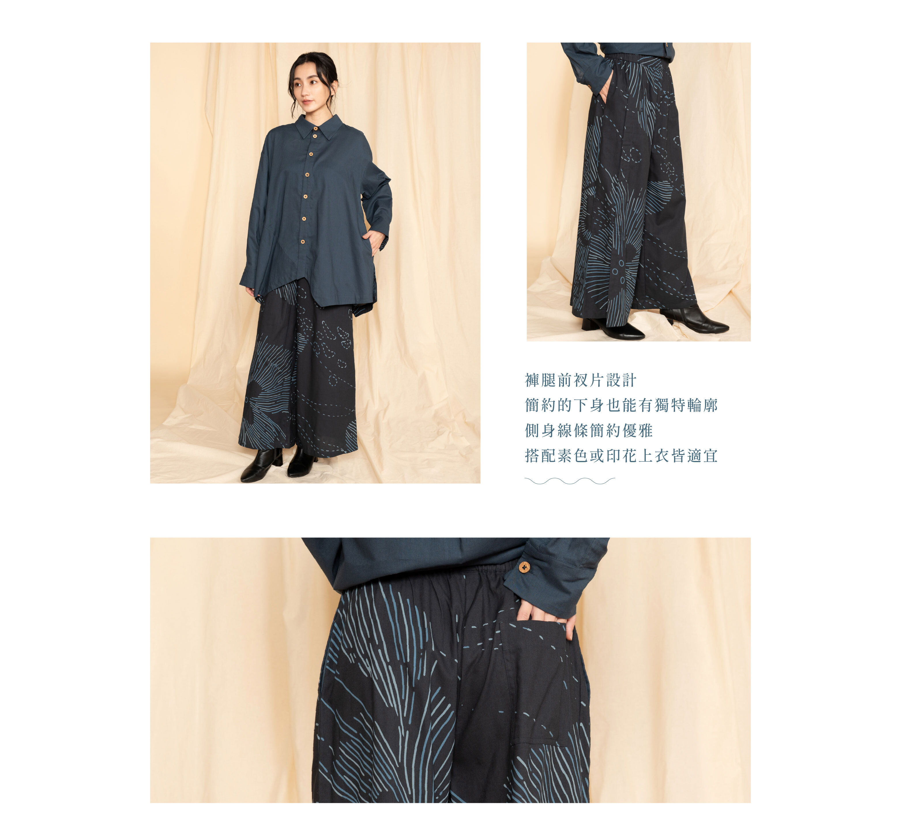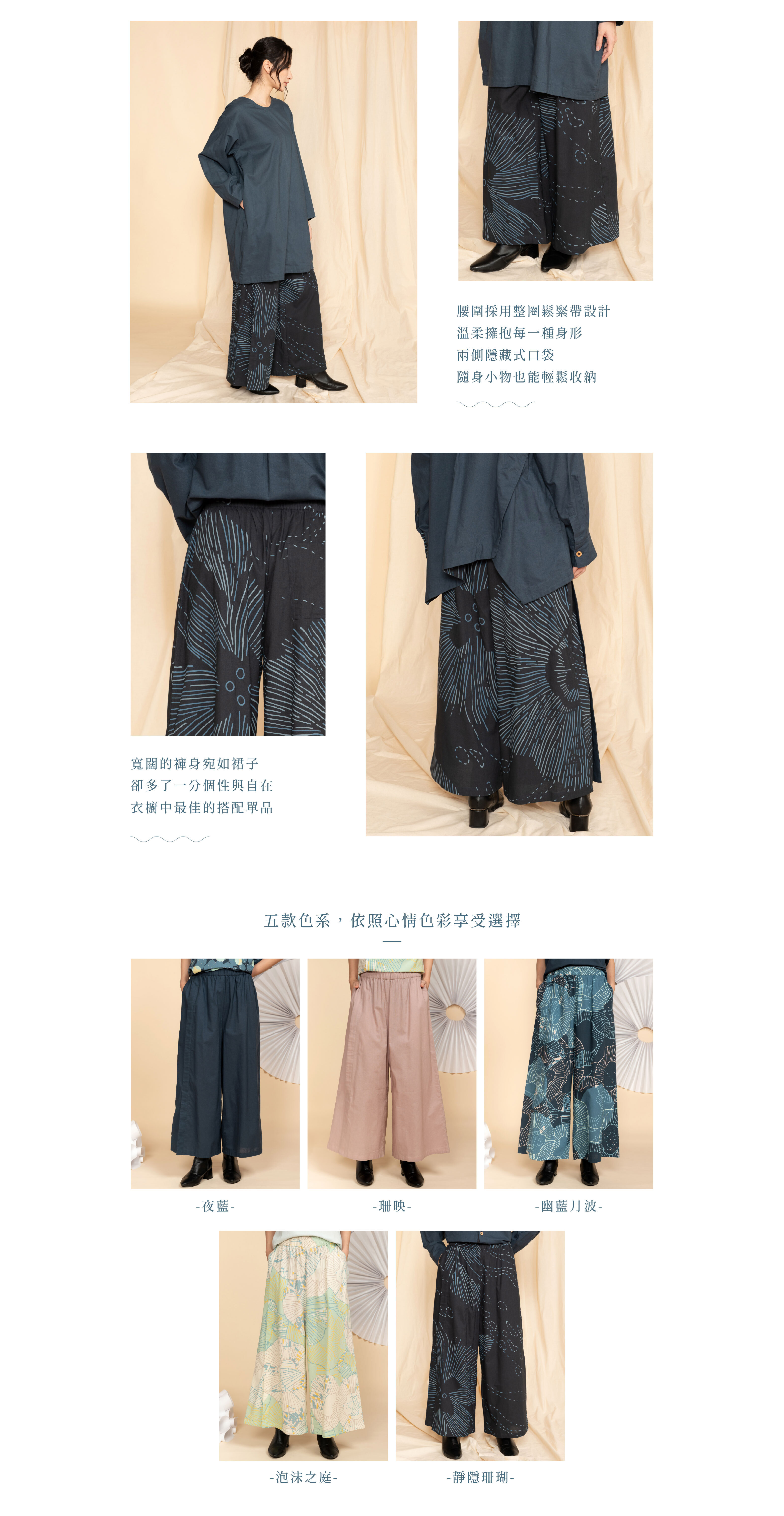 寬闊的褲身隨步伐輕搖,宛如河畔沙岸的律動,既似裙裝的飄逸,又多了一份率性自在。捨去繁複設計,只留下舒適流暢的線條,讓你在日常穿搭中,隨心展現輕盈與灑脫。