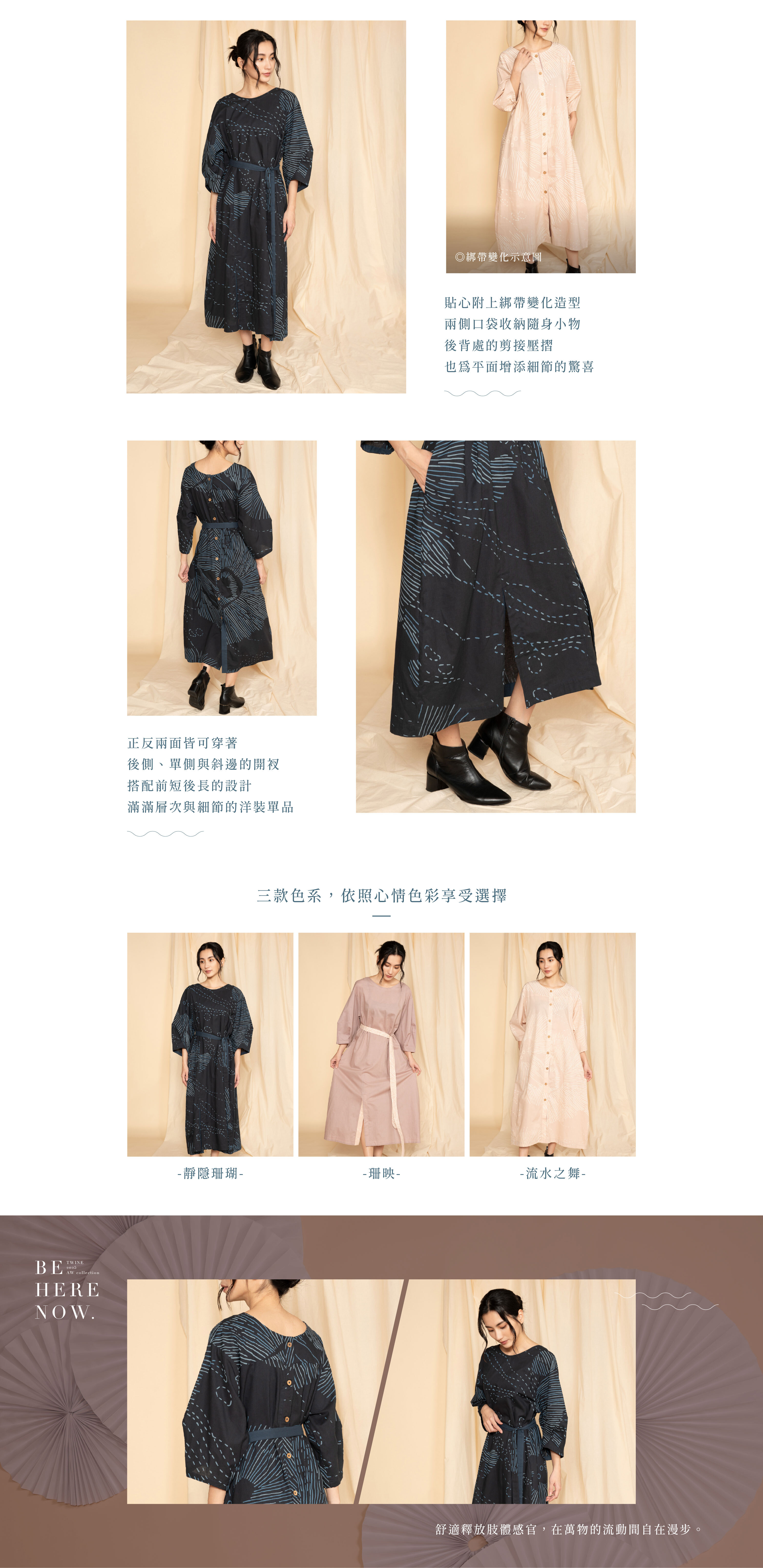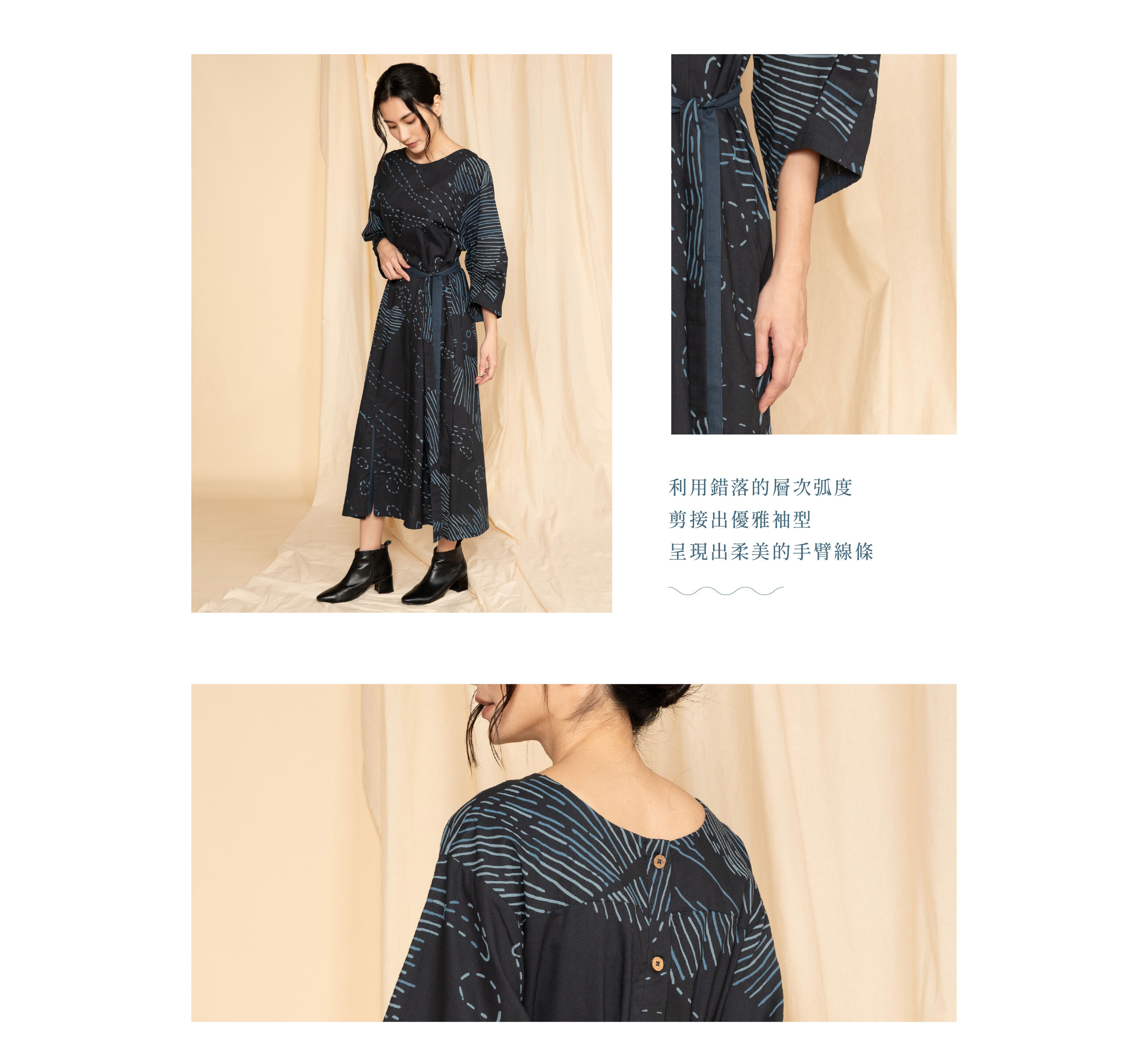 在原有獨特剪接與苞袖設計的基礎上,加入全新排扣細節,不僅能作為洋裝,也能當作長外套穿著。隨附綁帶輕繫腰間,勾勒出優雅輪廓,展現自在隨性的姿態。採用 100% 有機棉布料,觸感溫潤舒適,陪伴日常的每個時刻。