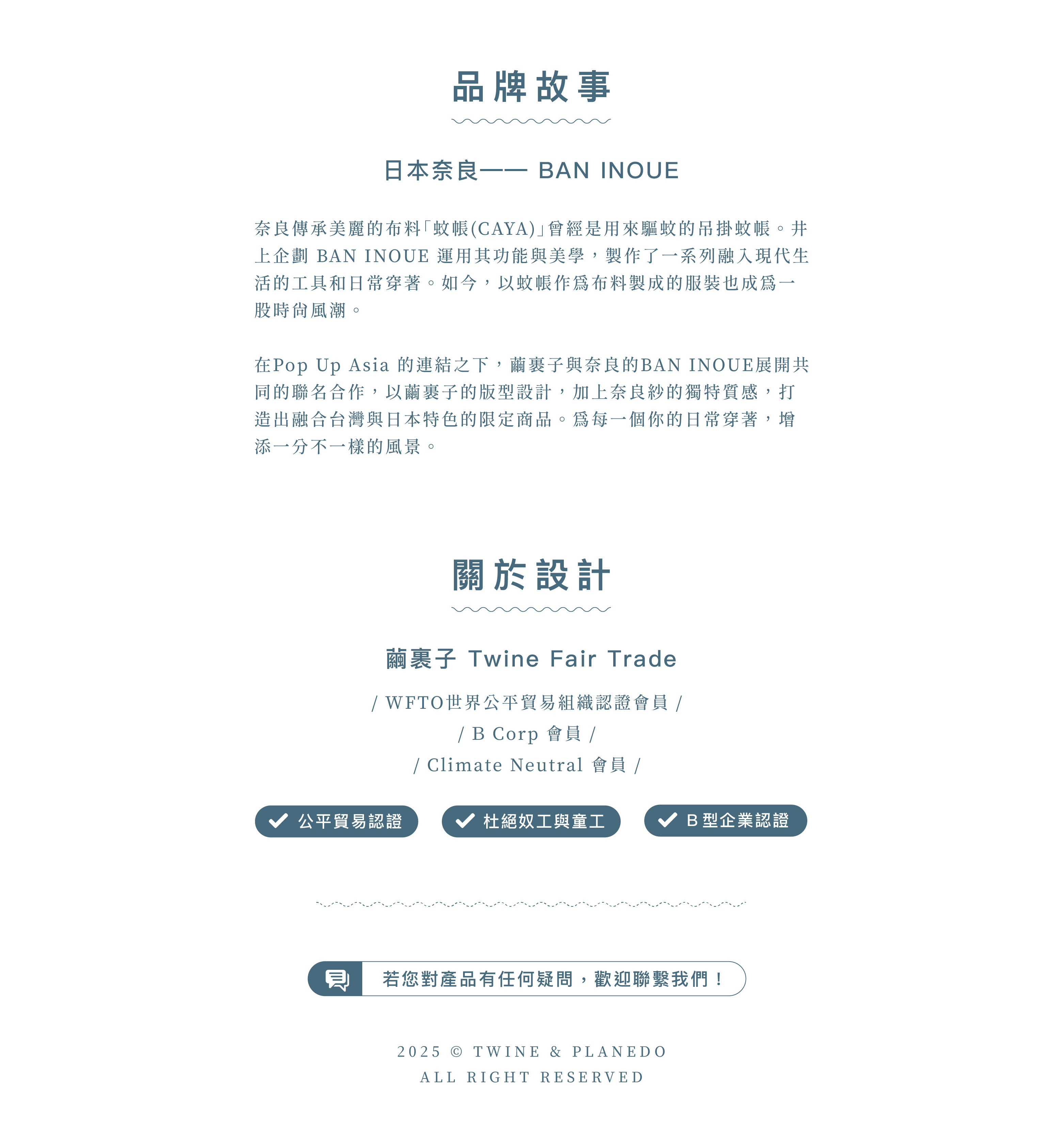布料選用奈良紗 Kaya 生地,洗後愈加柔軟親膚。