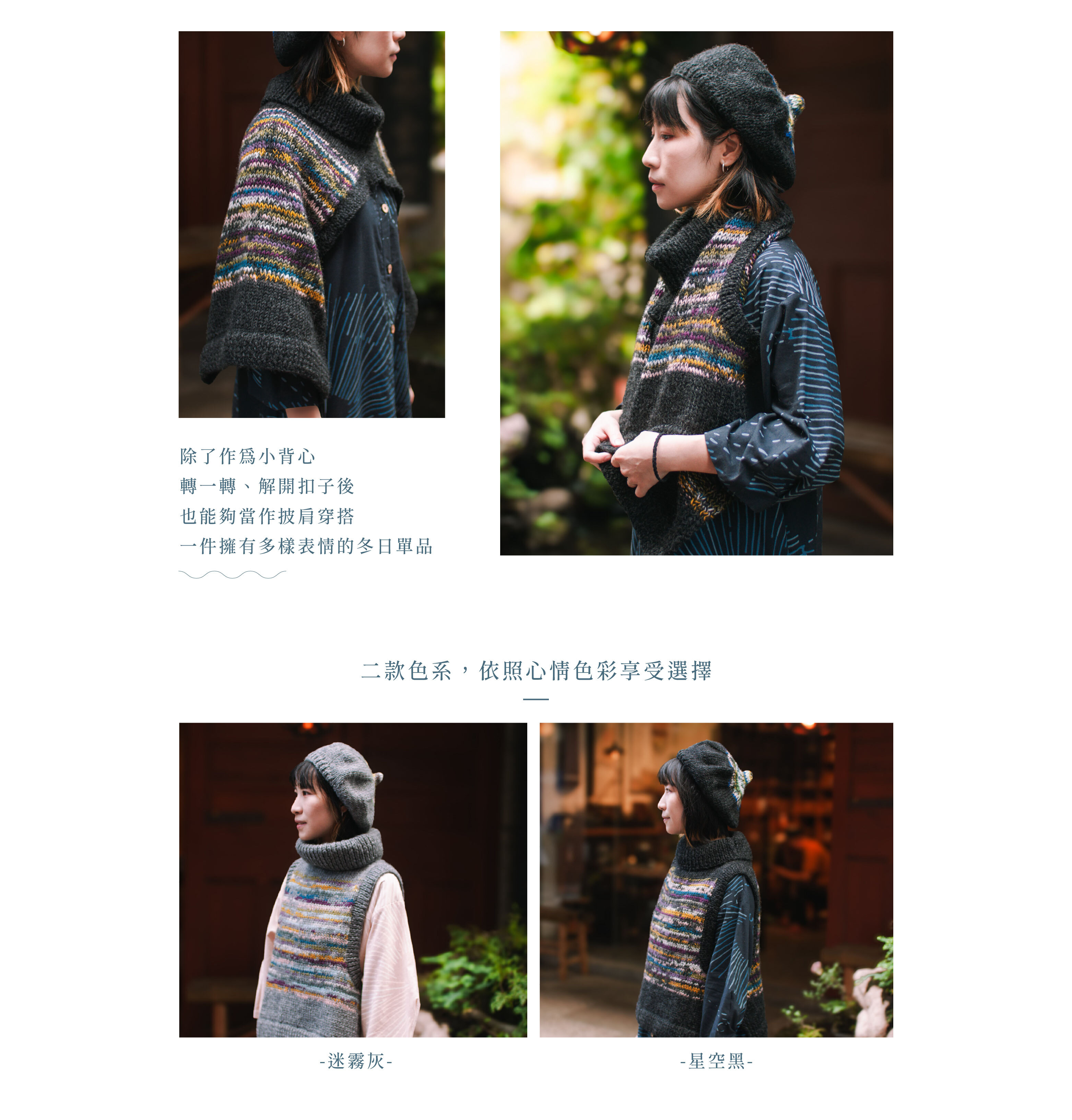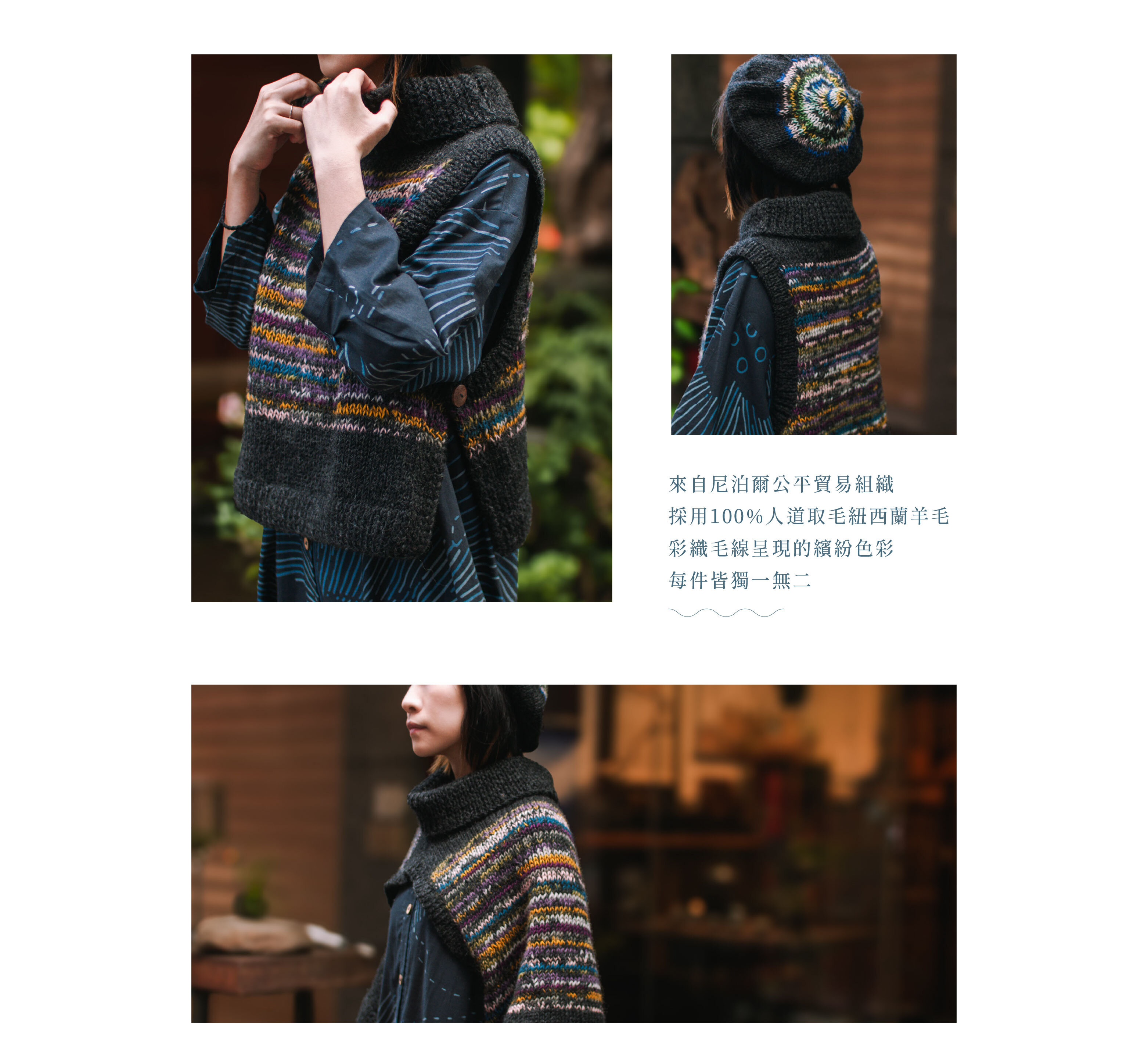 由尼泊爾公平貿易組織的婦女手工鉤織的羊毛小背心,解開扣子也能作為披肩穿著,搭配上隨機多彩的色線,於冬日綻放一抹溫暖的繽紛。
