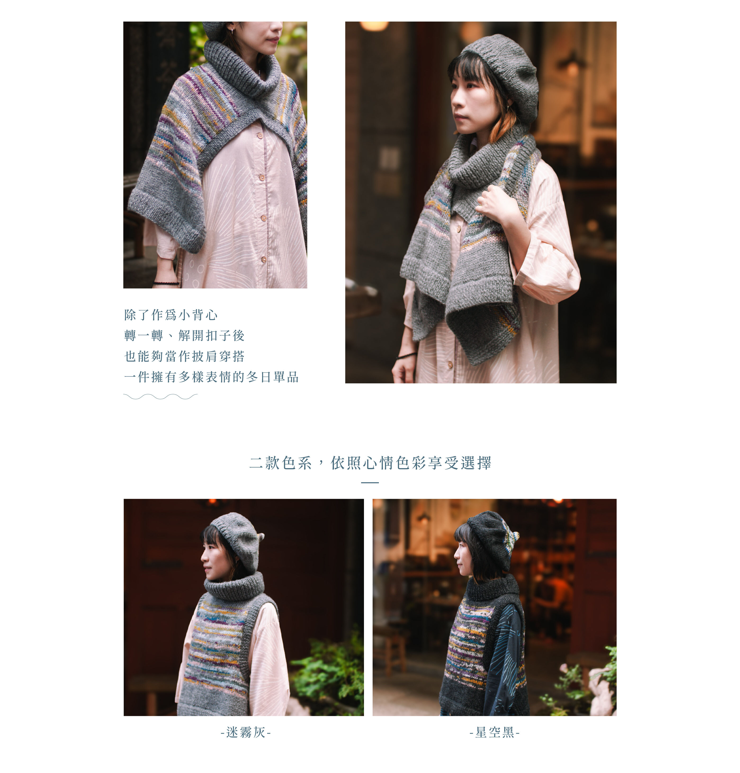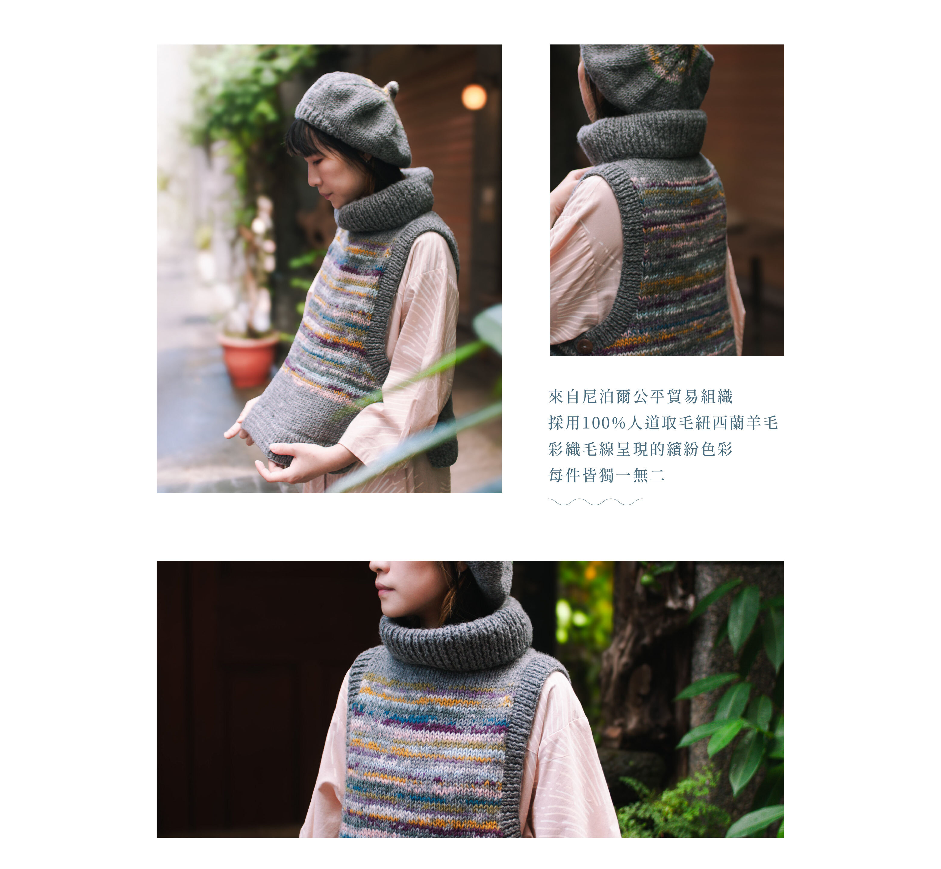由尼泊爾公平貿易組織的婦女手工鉤織的羊毛小背心,解開扣子也能作為披肩穿著,搭配上隨機多彩的色線,於冬日綻放一抹溫暖的繽紛。