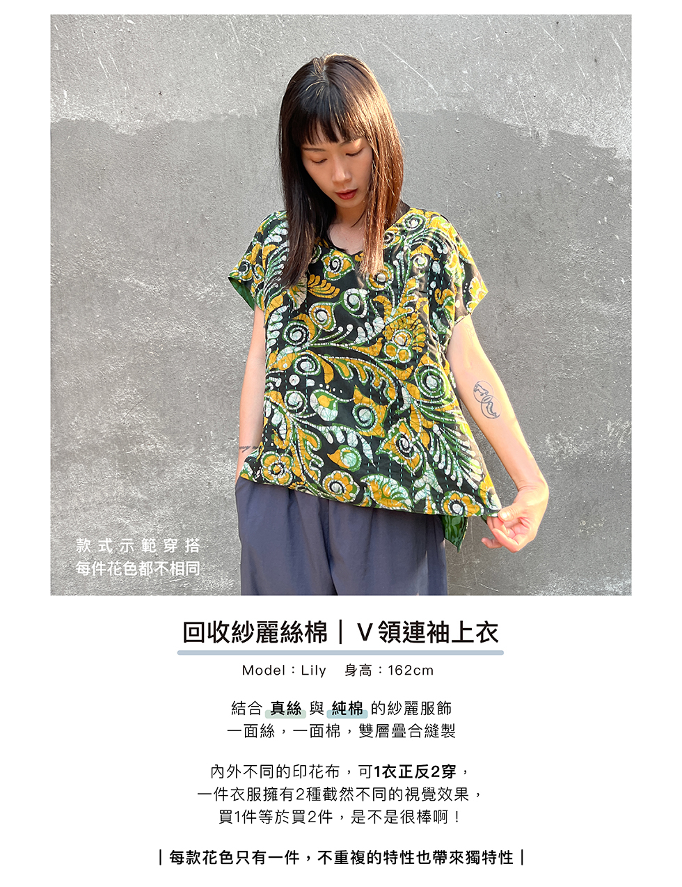 【回收紗麗再製服飾】結合『真絲』與『純棉』的紗麗服飾,一面絲+一面棉,雙層疊合縫製,內外不同印花布,可1衣正反2穿,一件衣服可擁有2種截然不同的視覺效果,每款花色只有一件,不重複的特性也帶來獨特性。