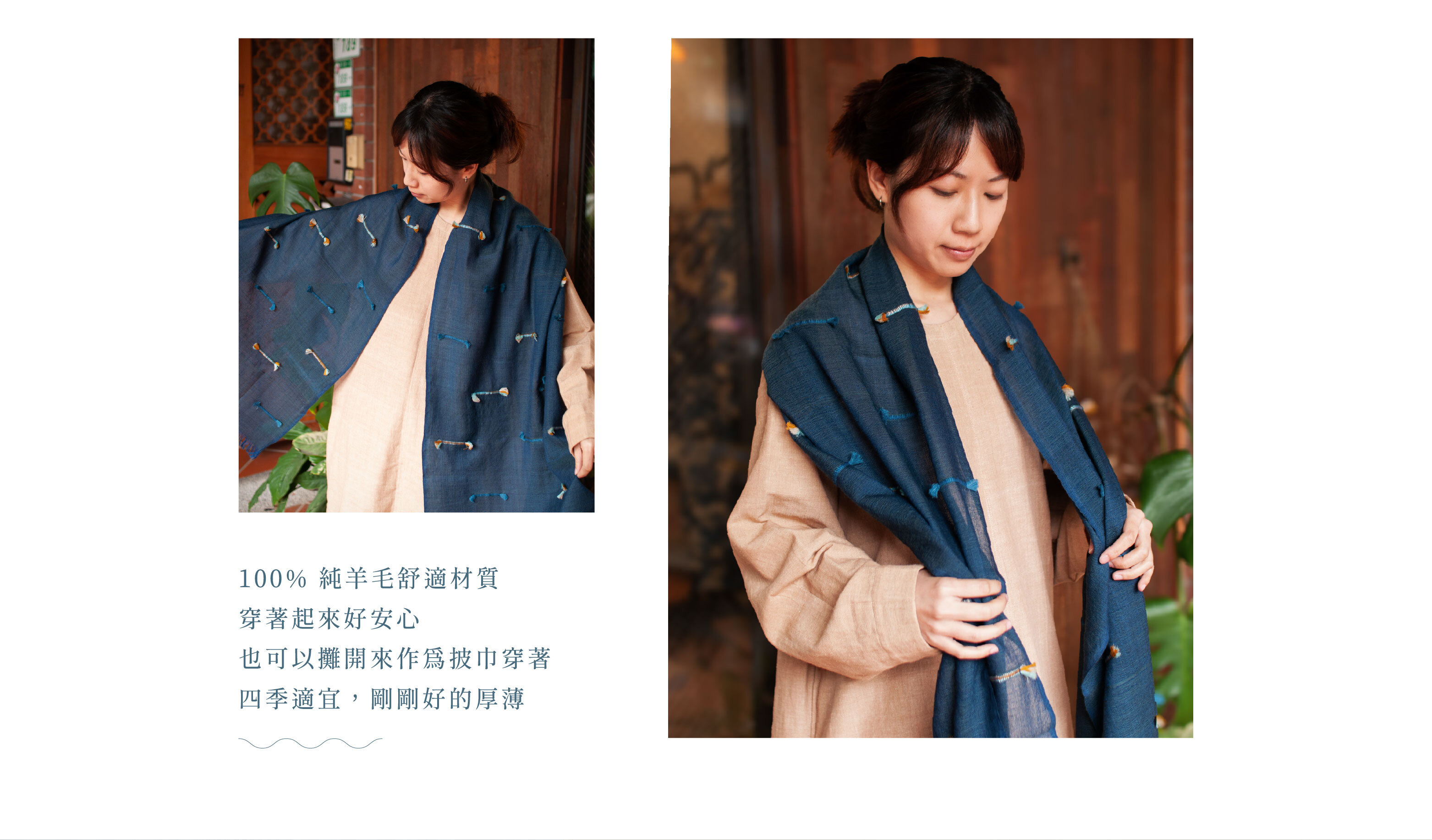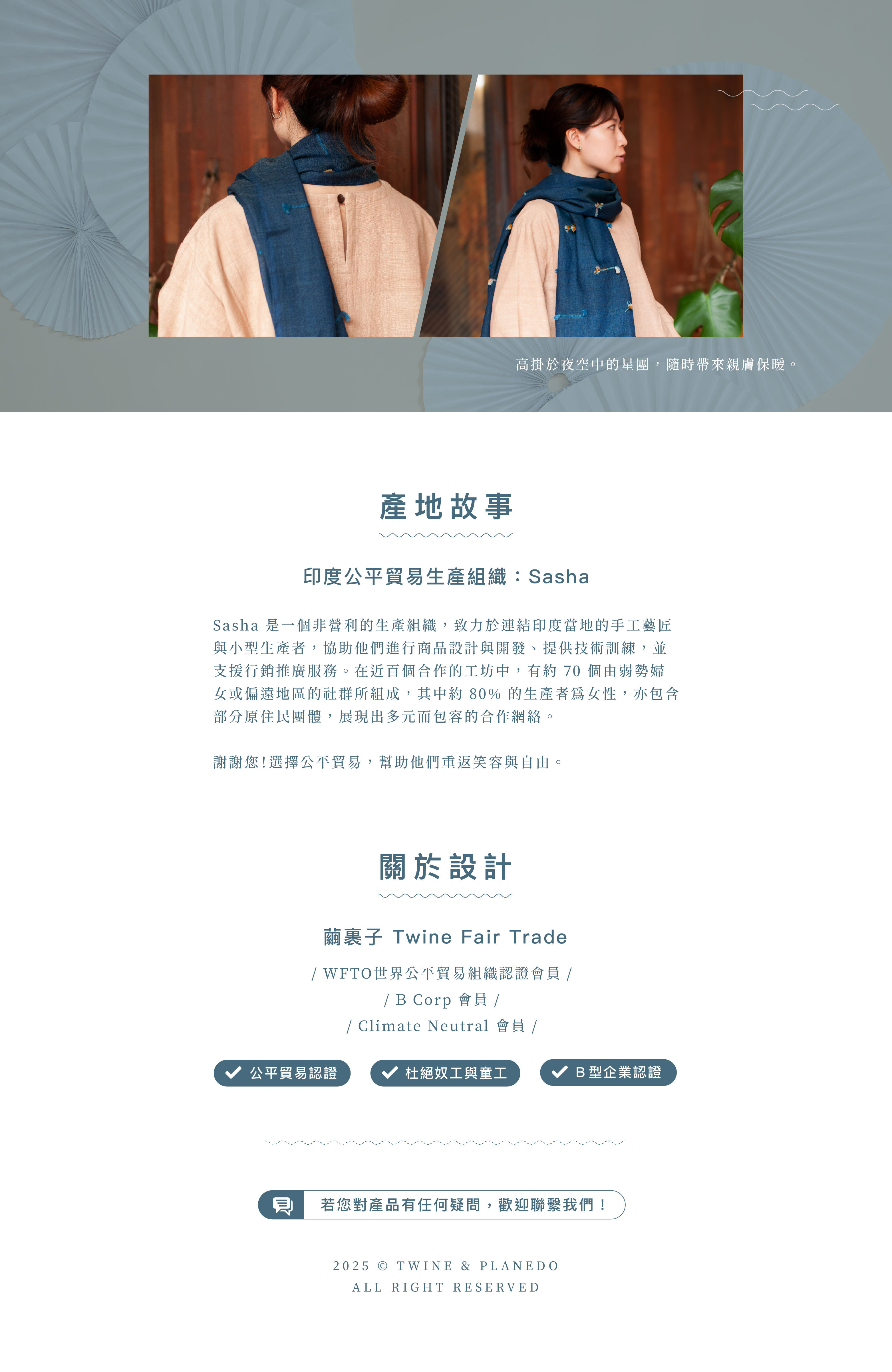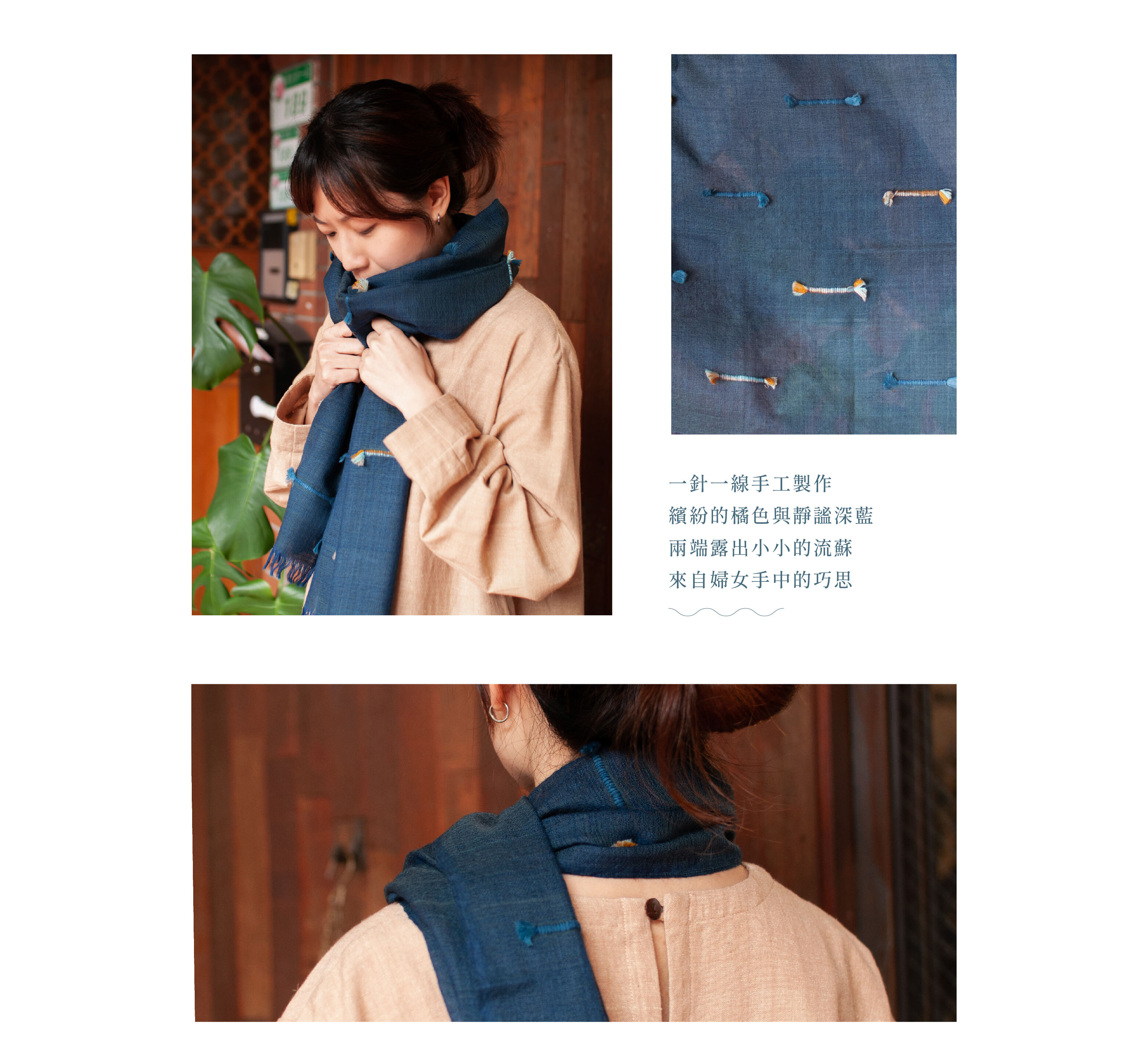 夜藍色的羊毛基底繫上回收紗麗製作的流蘇裝飾,宛如靜夜星空中的朵朵繽紛星團。紗麗的燦爛碰見靜謐深藍,賦予服裝第二生命的美麗之作。