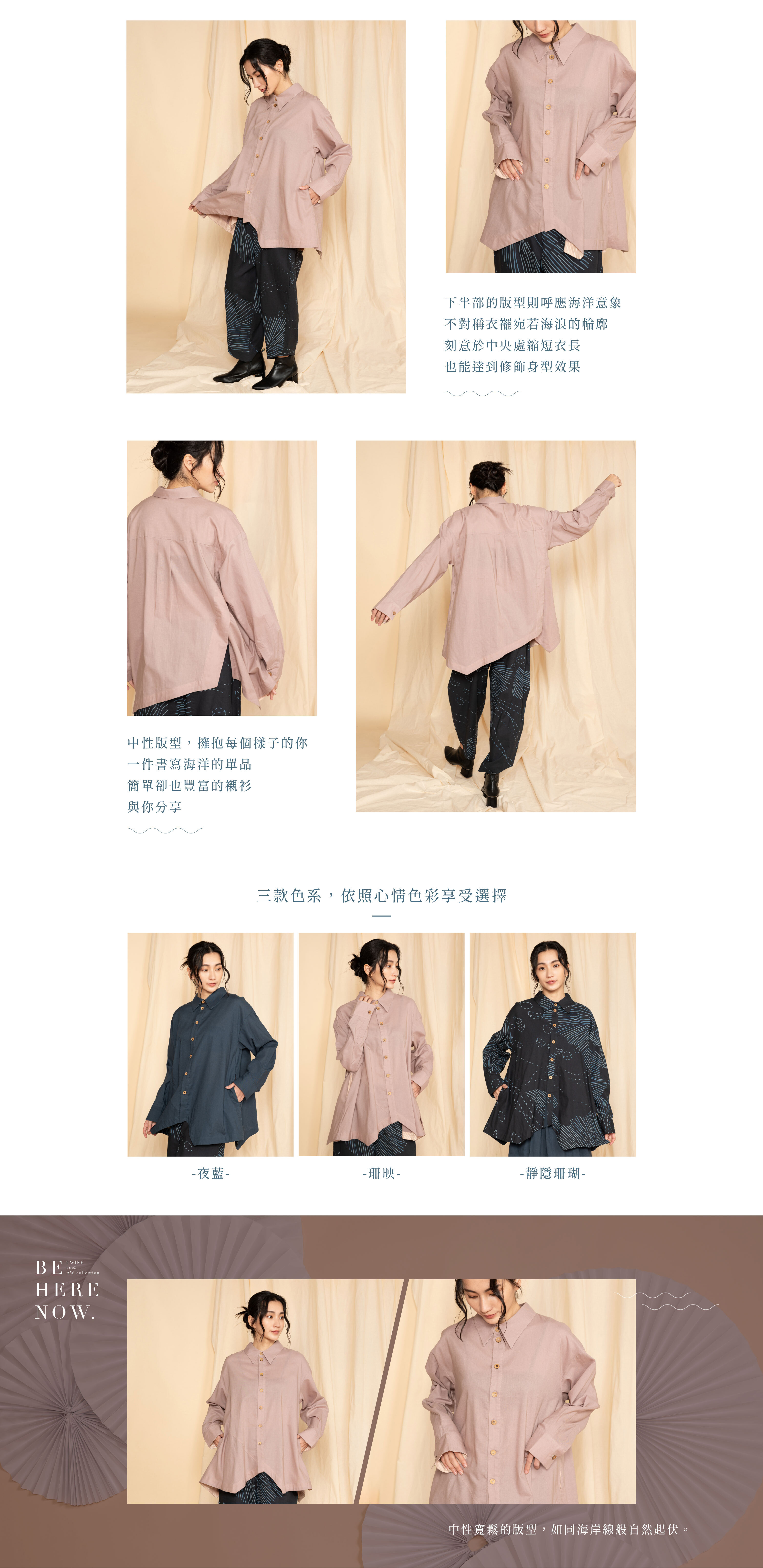 襯衫的衣襬以不規則剪裁呈現,如同海岸線般自然起伏。中性寬鬆的版型,帶來自在舒適的穿著體驗,既能單穿展現率性,也能作為層次搭配的一部分,展現更多可能。
