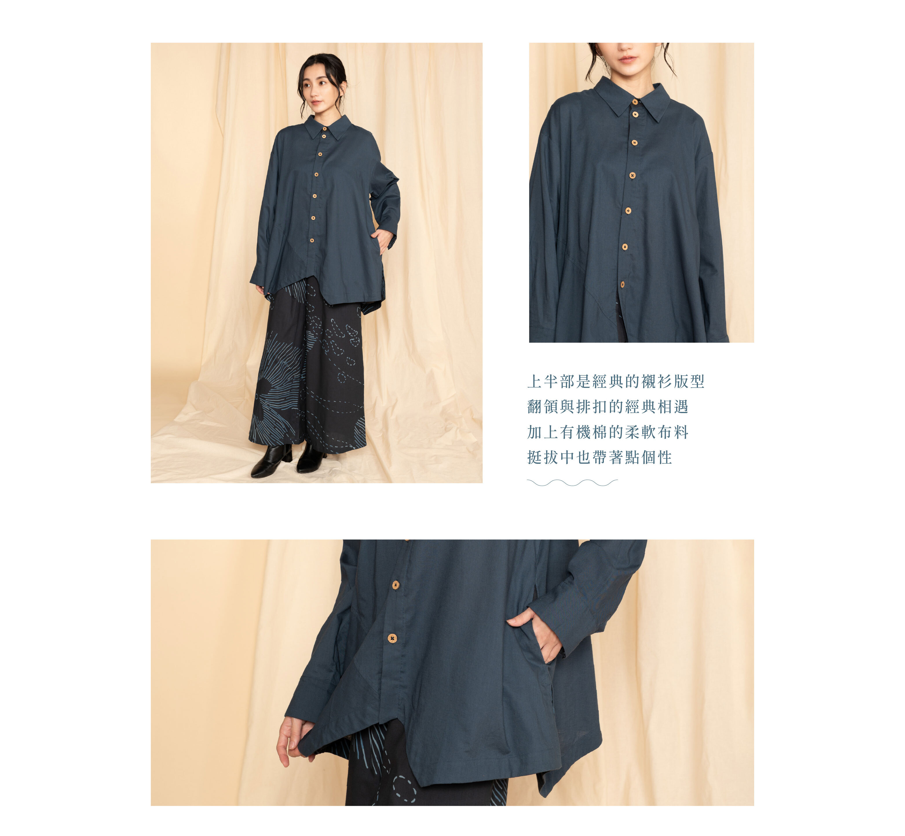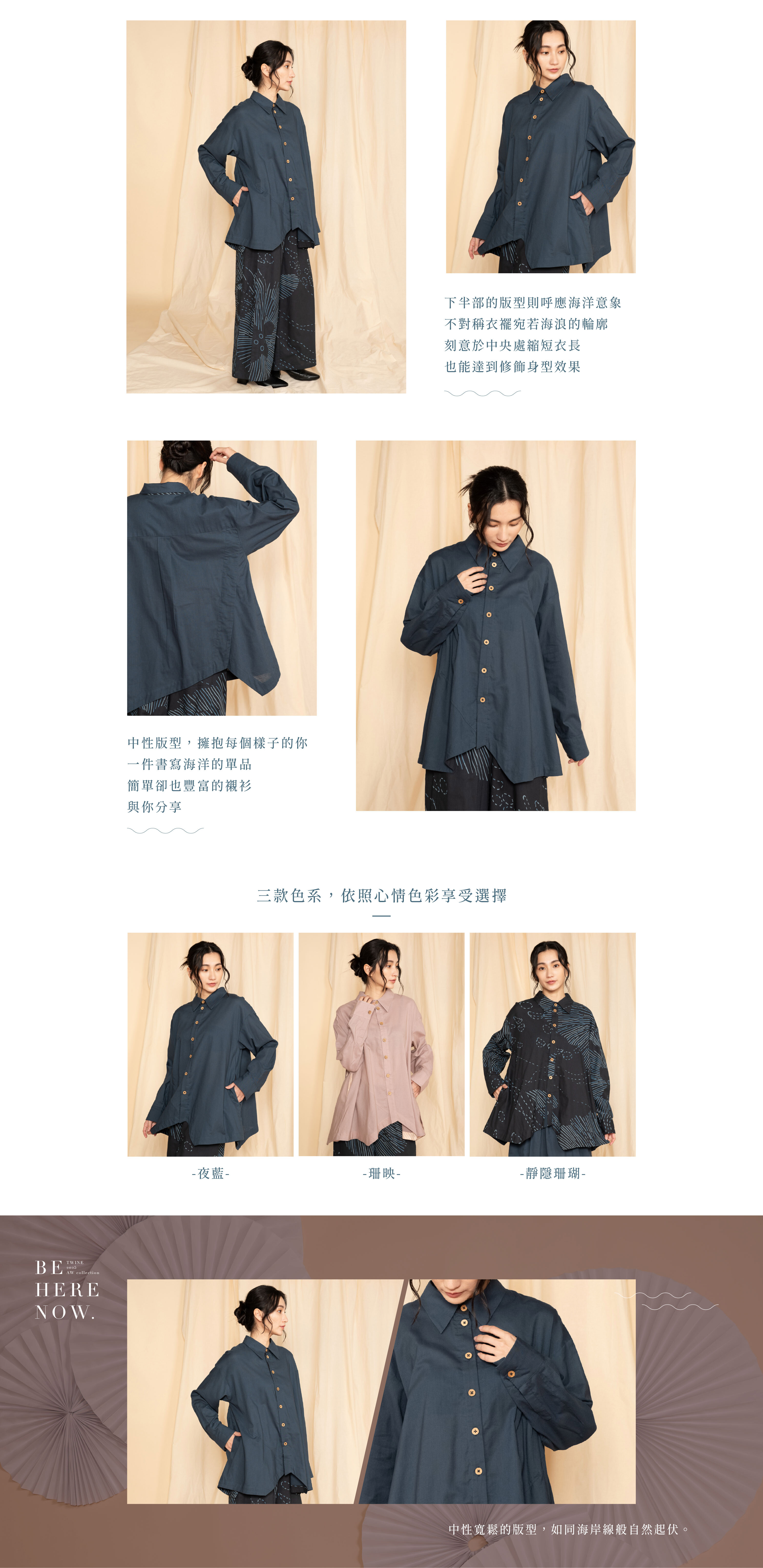 襯衫的衣襬以不規則剪裁呈現,如同海岸線般自然起伏。中性寬鬆的版型,帶來自在舒適的穿著體驗,既能單穿展現率性,也能作為層次搭配的一部分,展現更多可能。