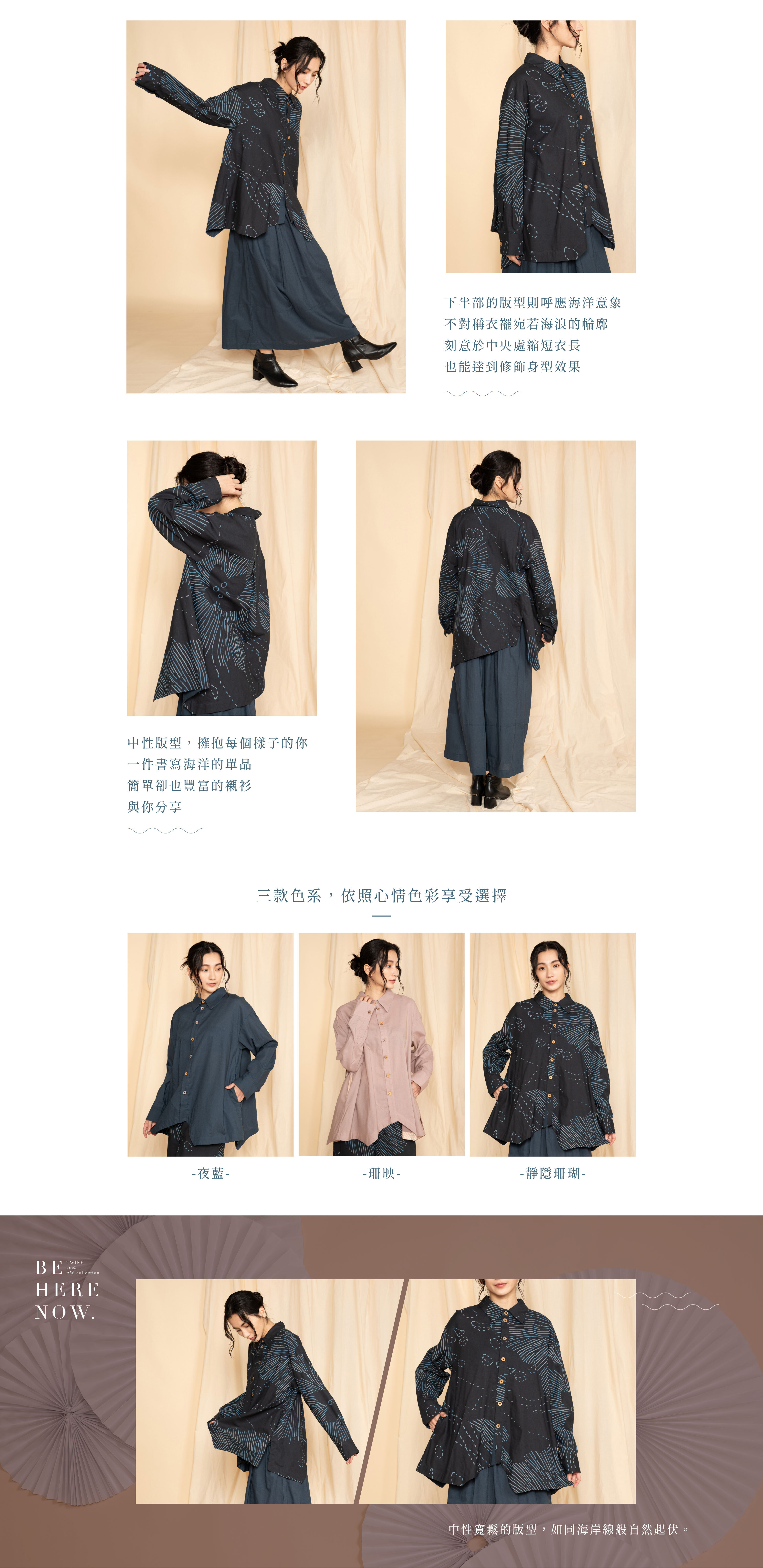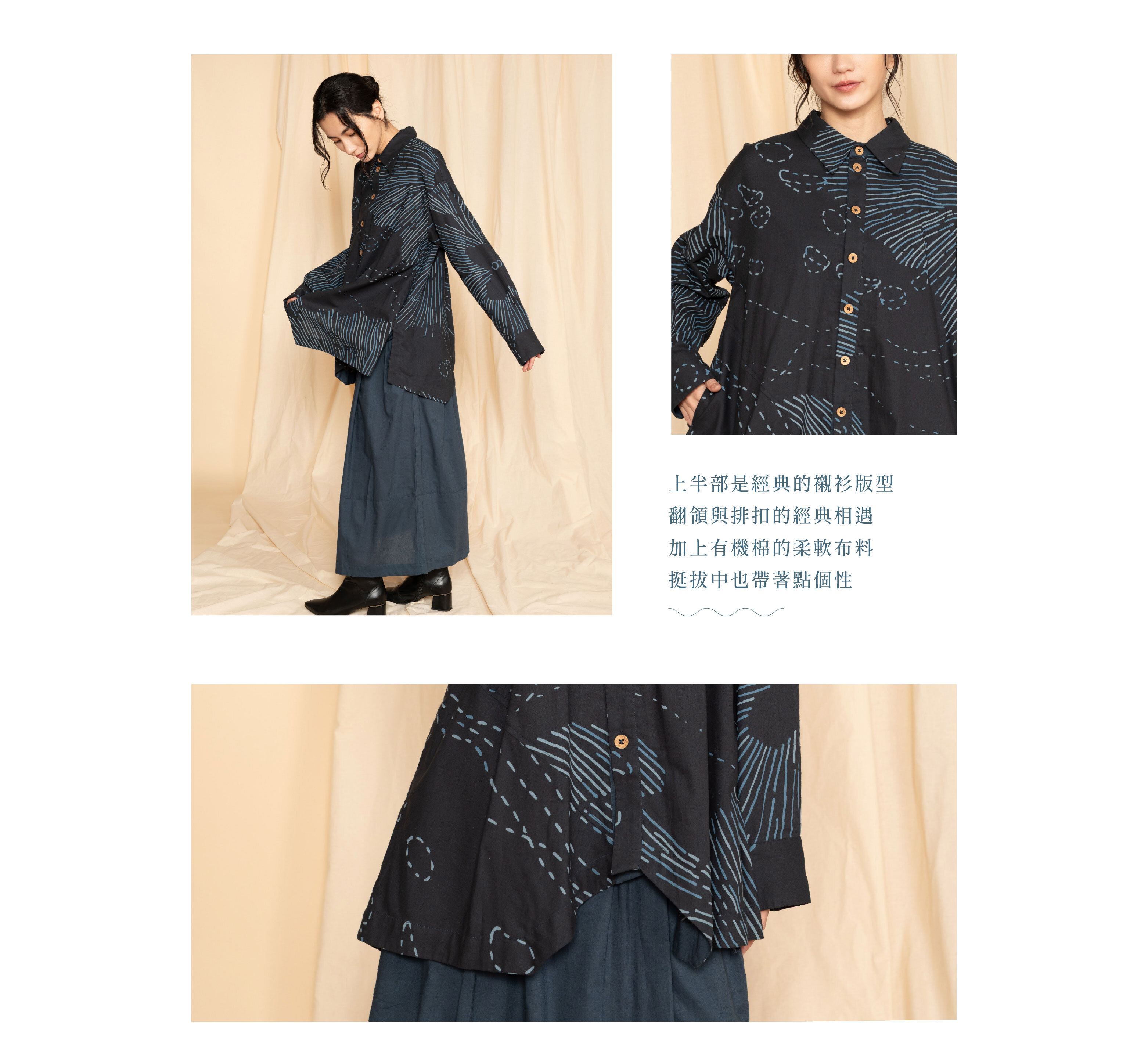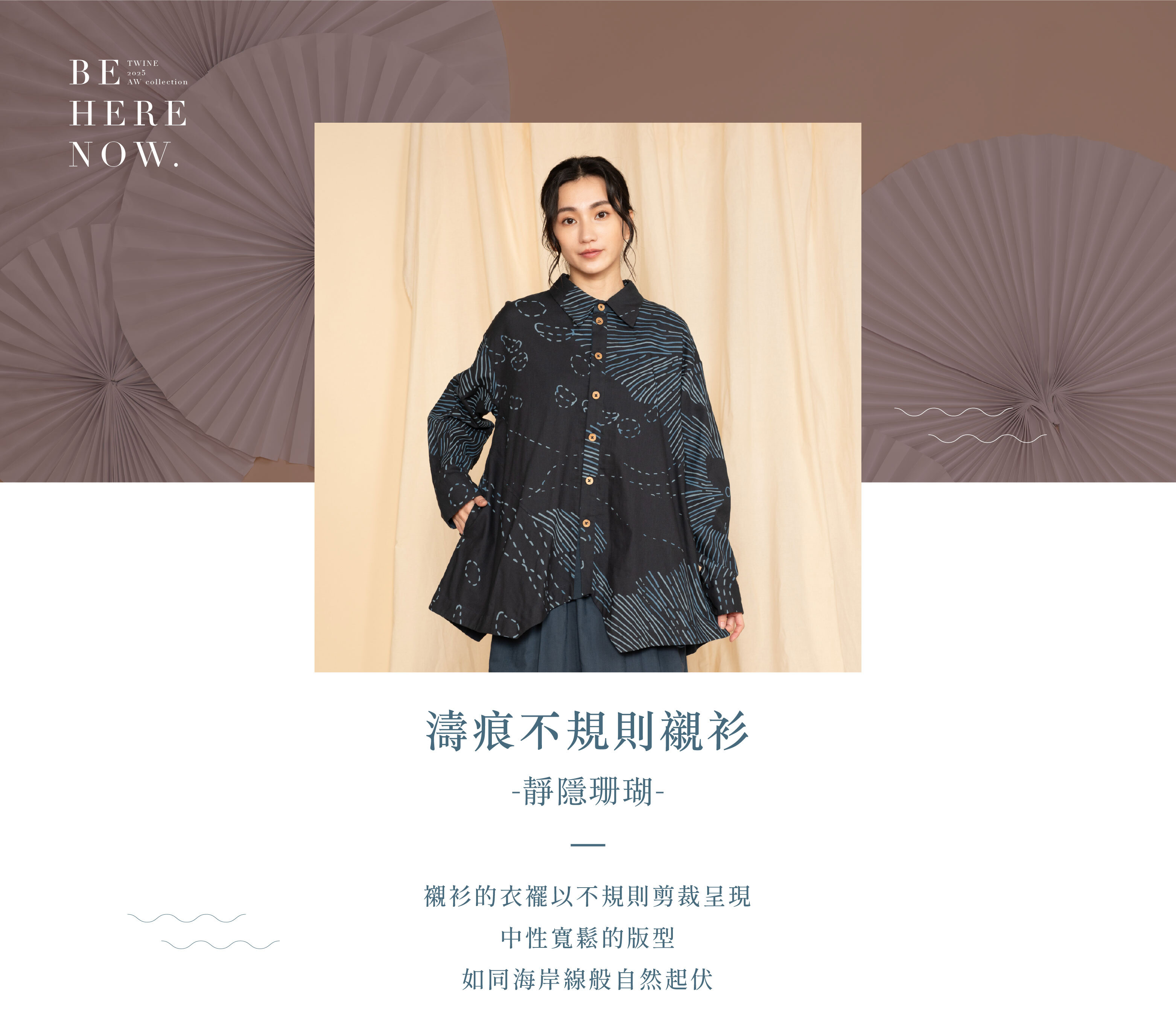 襯衫的衣襬以不規則剪裁呈現,如同海岸線般自然起伏。中性寬鬆的版型,帶來自在舒適的穿著體驗,既能單穿展現率性,也能作為層次搭配的一部分,展現更多可能。