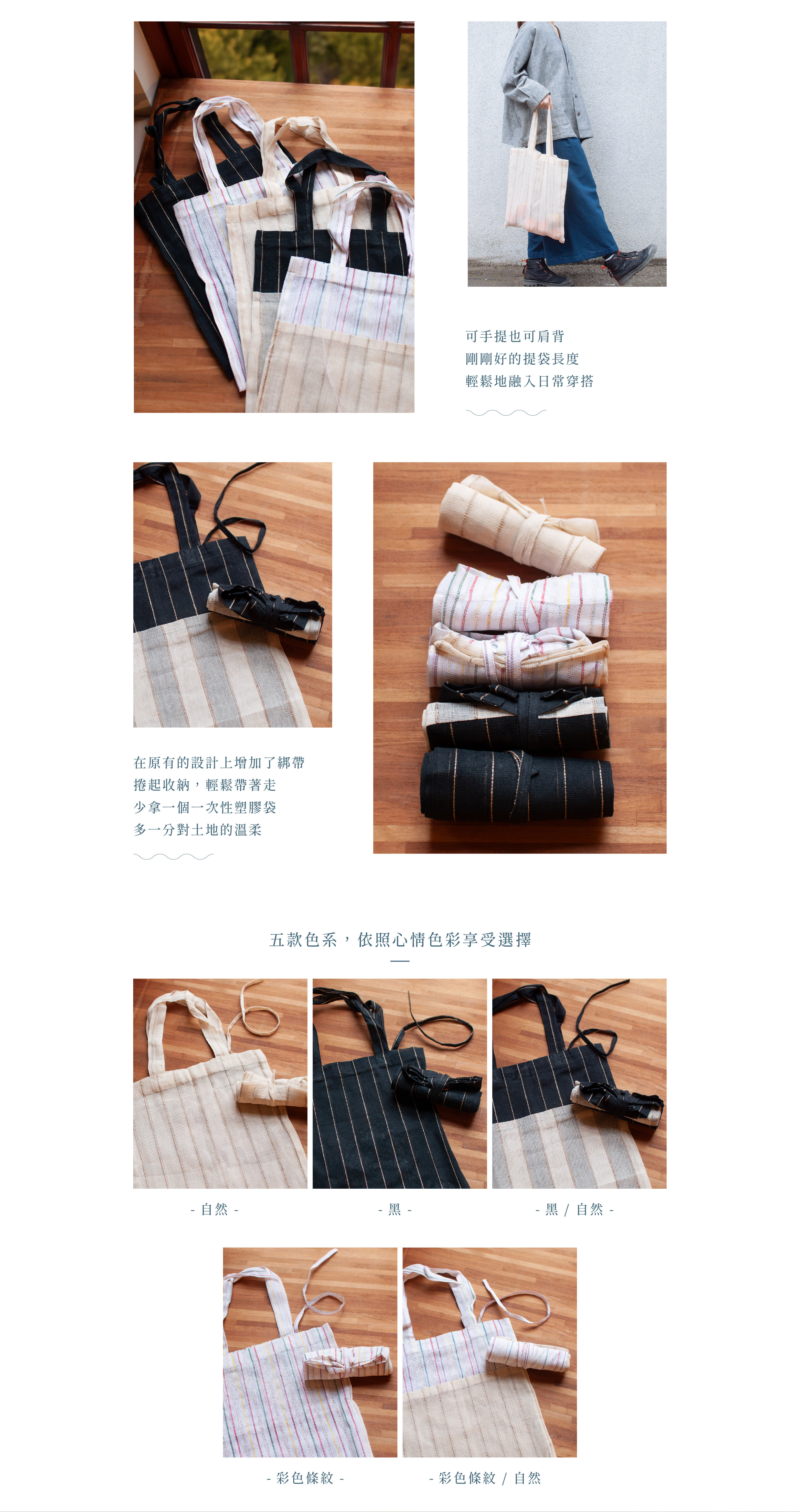 附加綁帶的貼心設計,能將提袋輕鬆捲起收納。共有五色款式可供選擇。