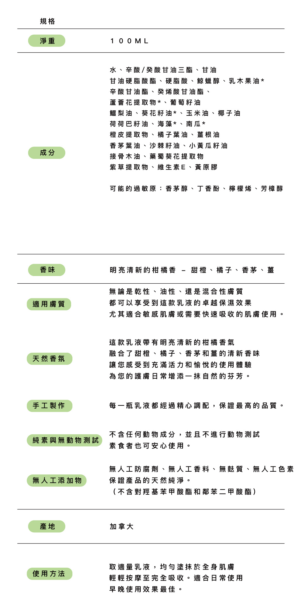 香味: 明亮清新的柑橘香 - 甜橙、橘子、香茅、薑