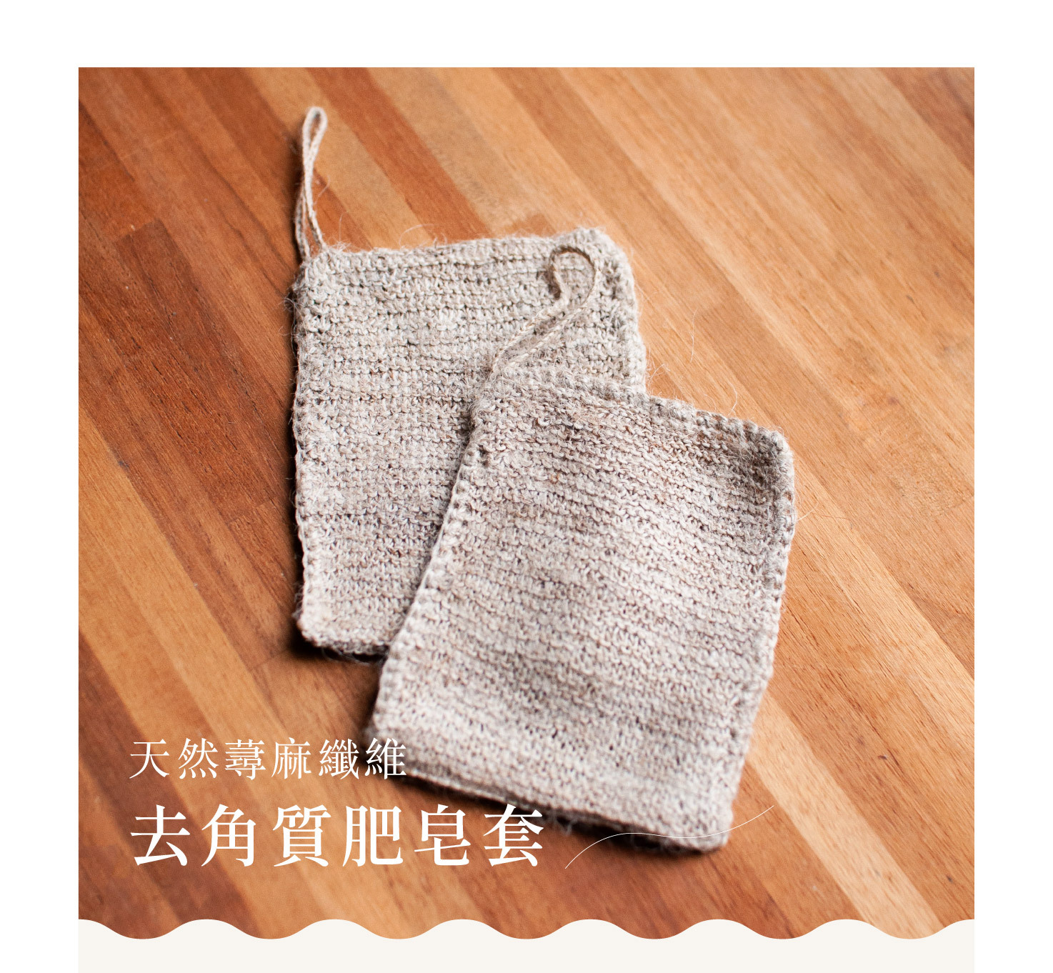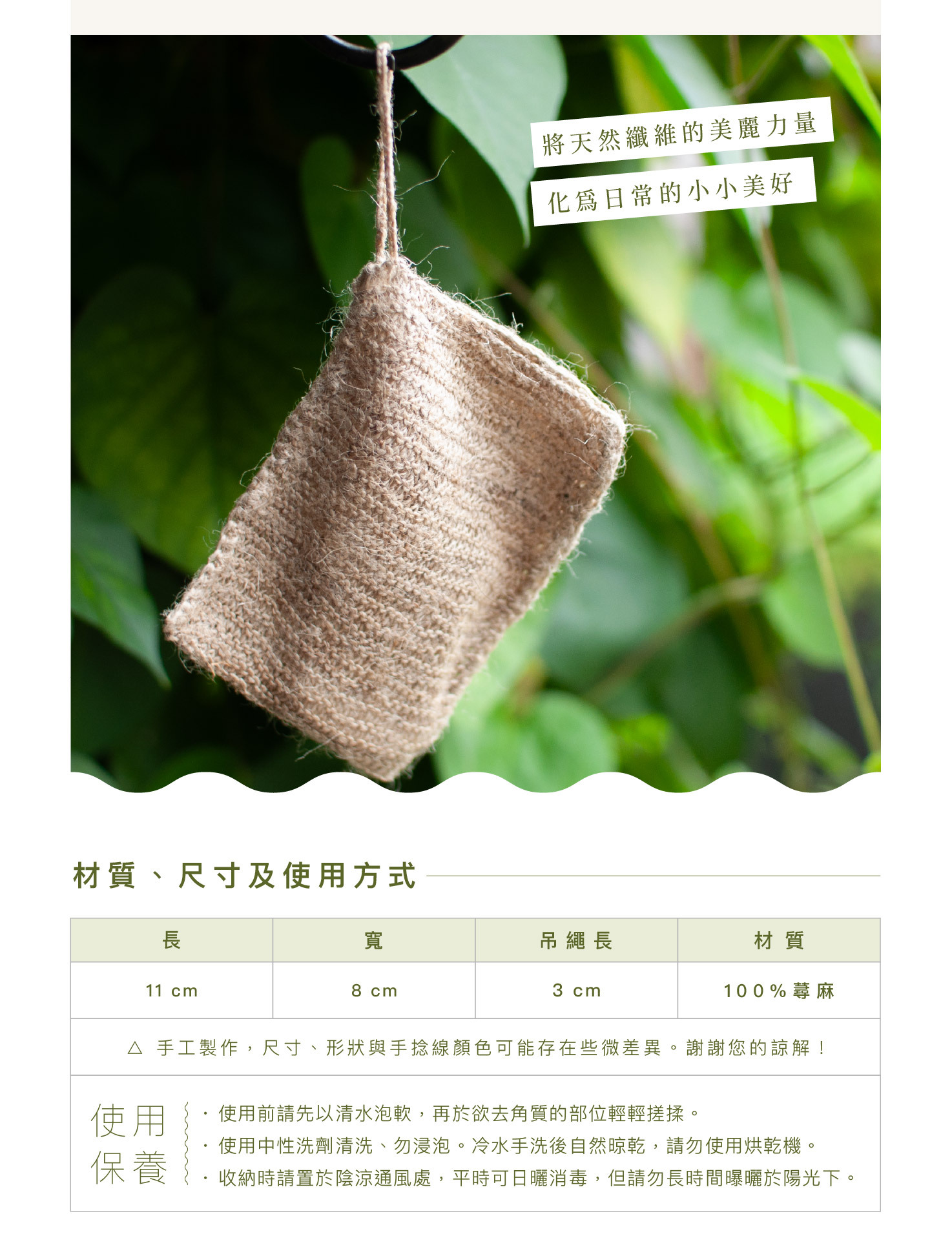 由尼泊爾婦女手工捻線編織,利用蕁麻纖維強韌、輕盈的特性成為去角質保養幫手。袋子狀的設計可放入肥皂,洗手時更容易起泡,沐浴時也可用於去角質。