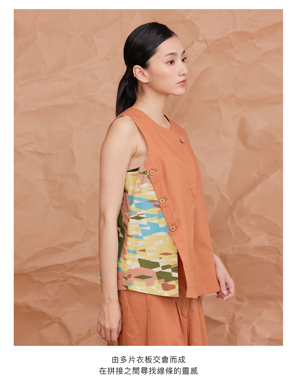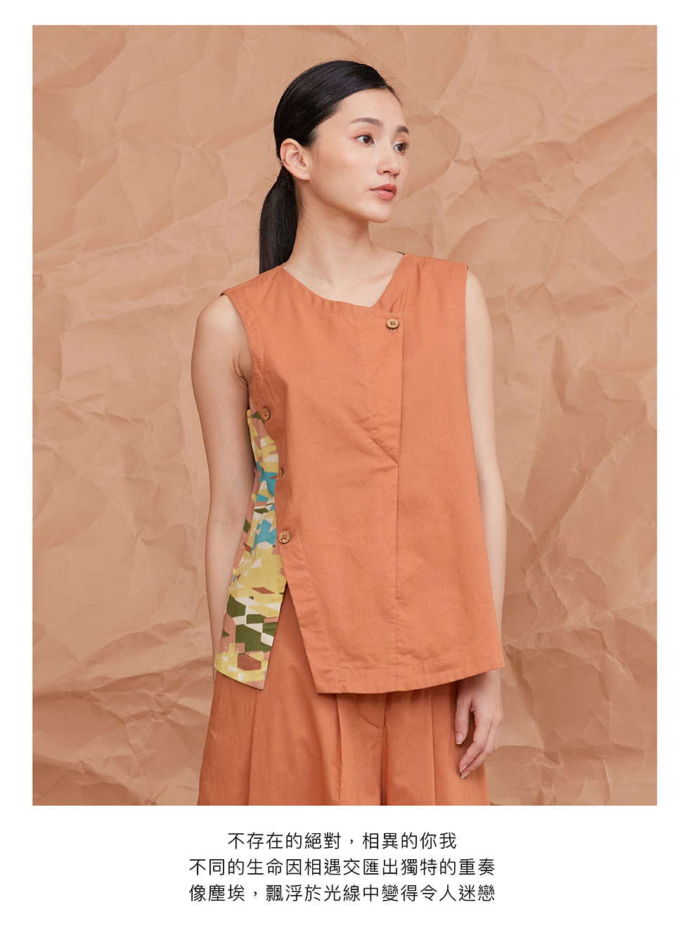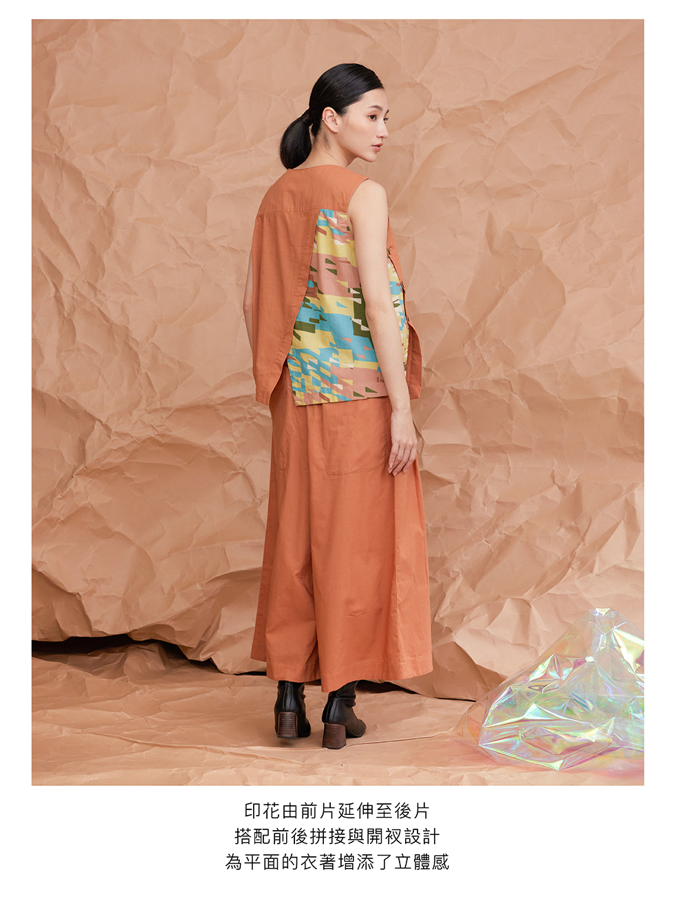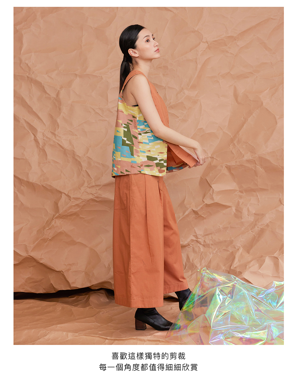 100%有機棉,獨特的拼接剪裁背心,前後斜衩與活褶設計為平面增添了空間感,單色和印花之間的轉換,為視覺帶來不同角度的驚喜。