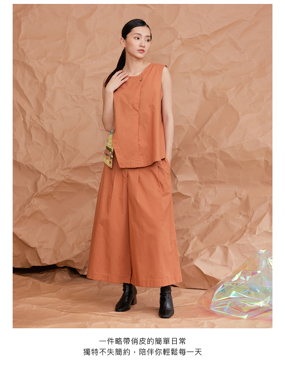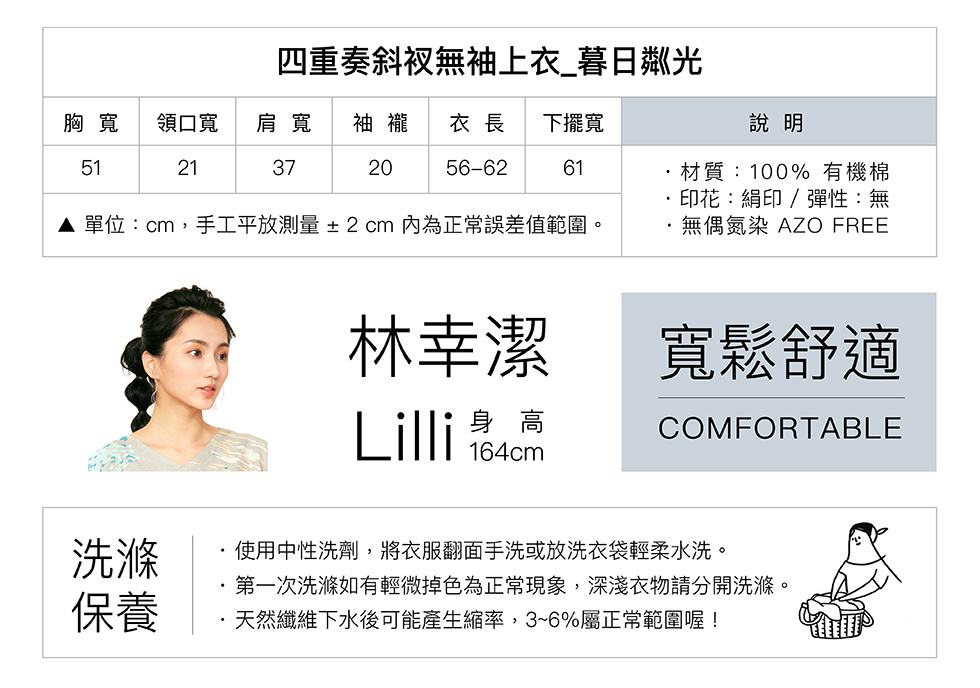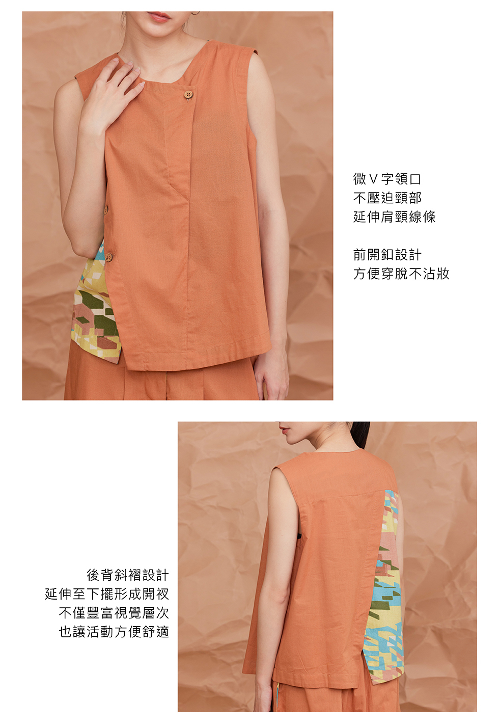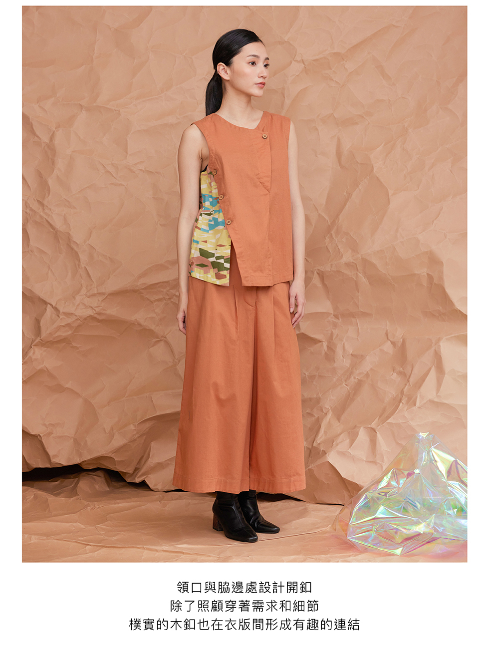 100%有機棉,獨特的拼接剪裁背心,前後斜衩與活褶設計為平面增添了空間感,單色和印花之間的轉換,為視覺帶來不同角度的驚喜。