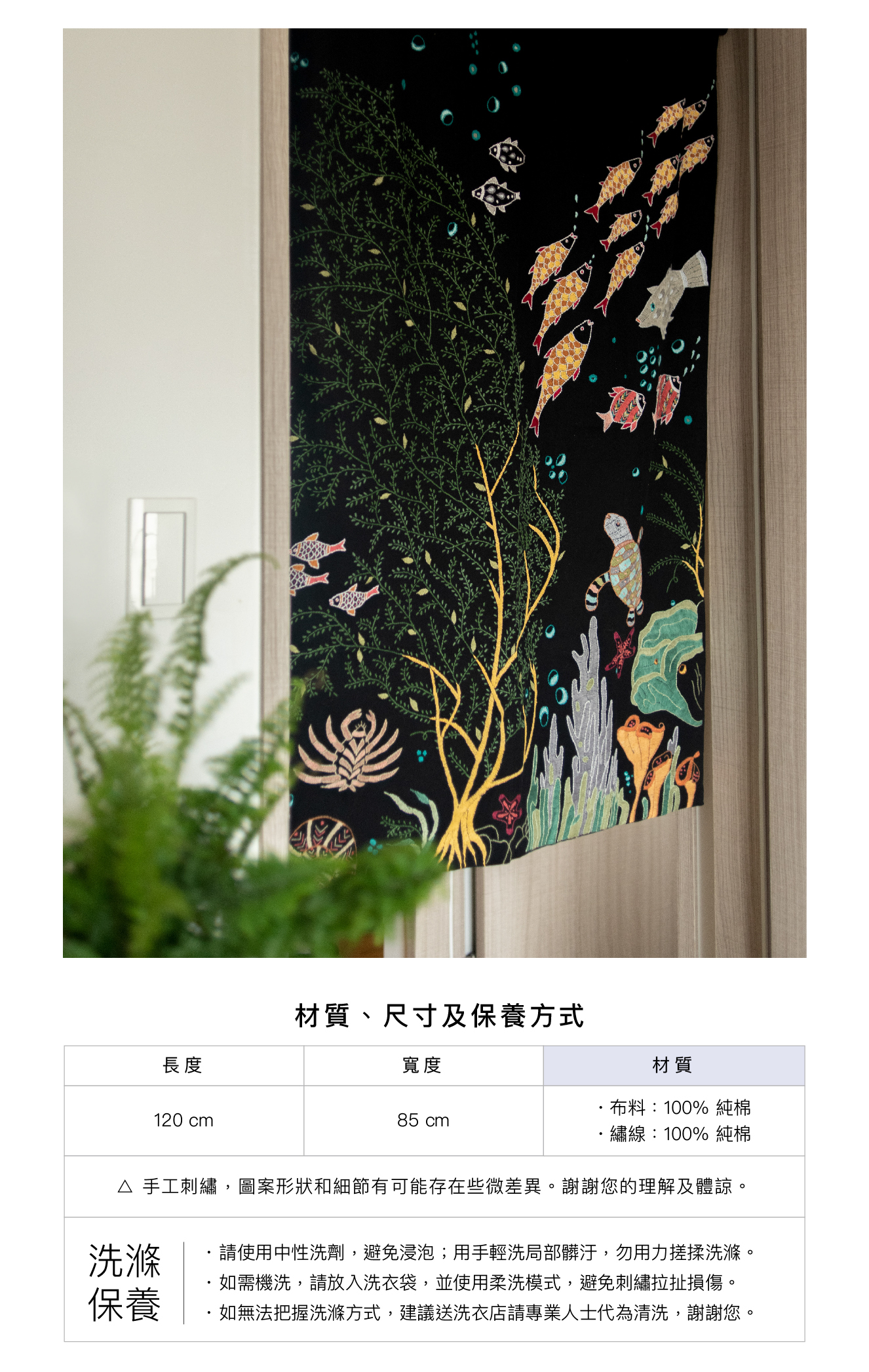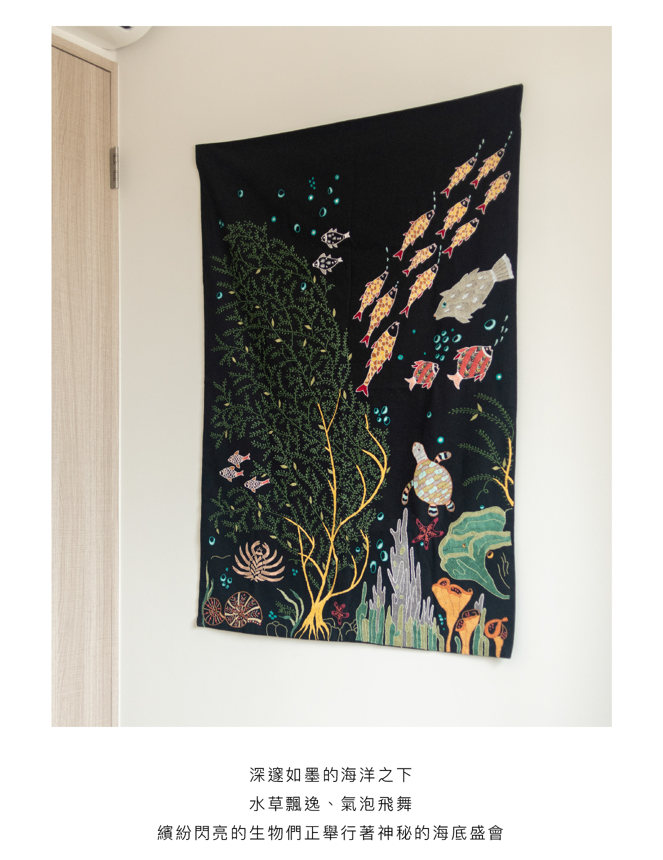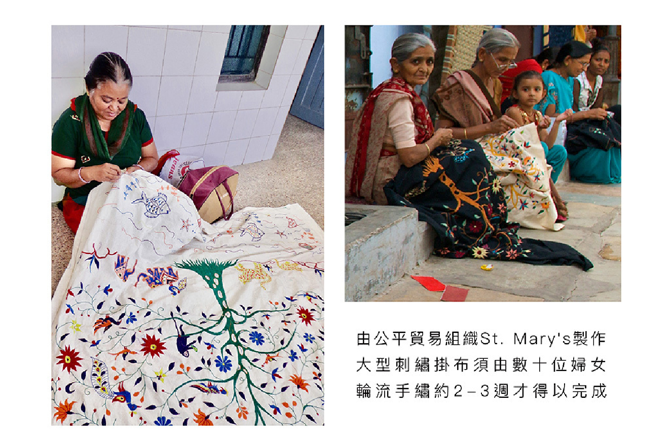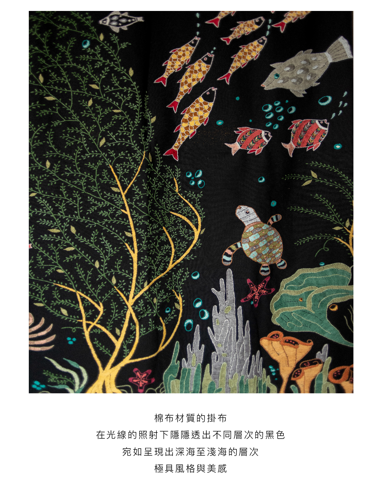 深邃不見光的海洋,水草飄逸,生命吞吐著泡泡,自帶繽紛和閃亮的生物們正在舉行一場神秘的海底派對。來自印度公平貿易組織婦女一針一線的手繡之作,時間是最美的禮物。