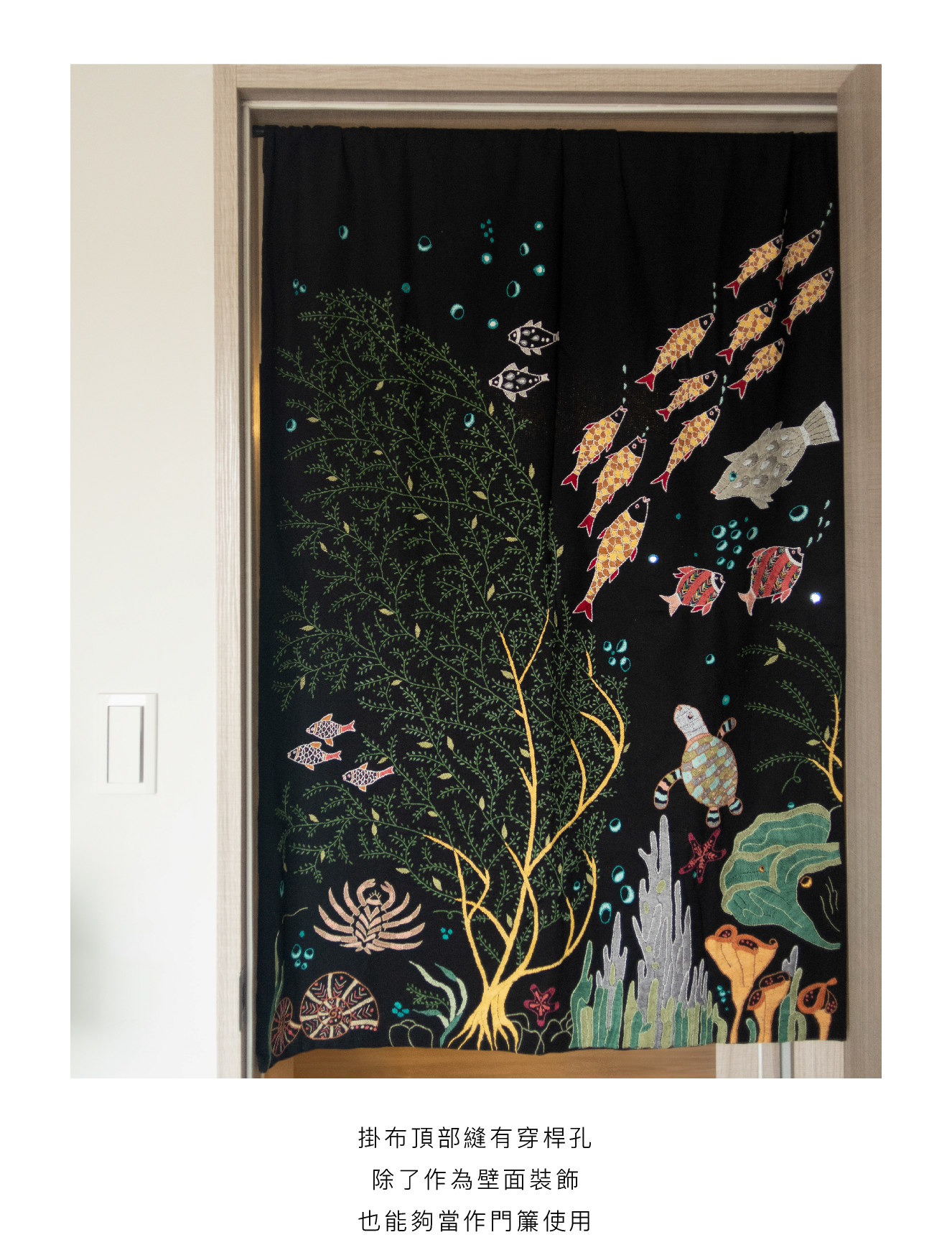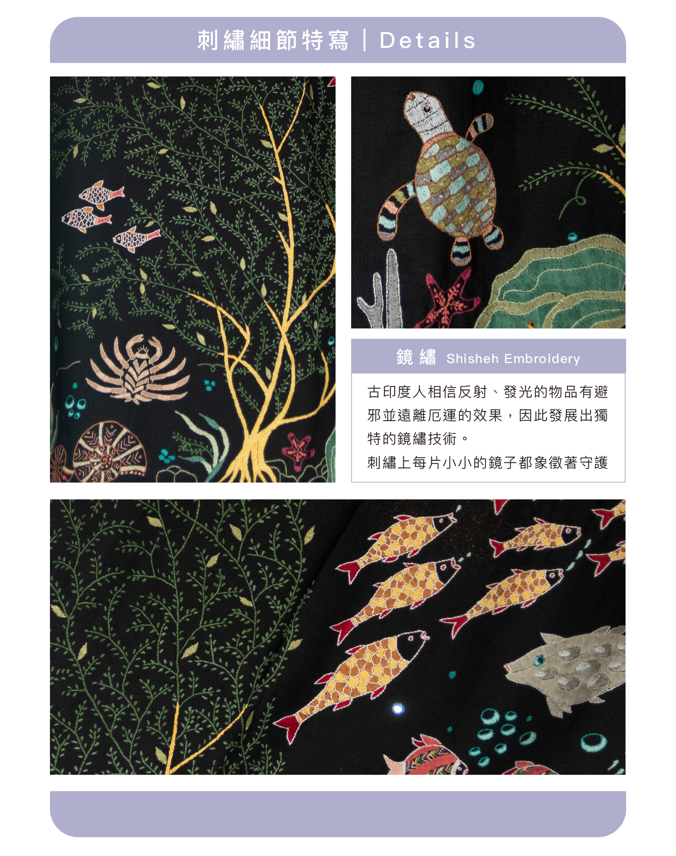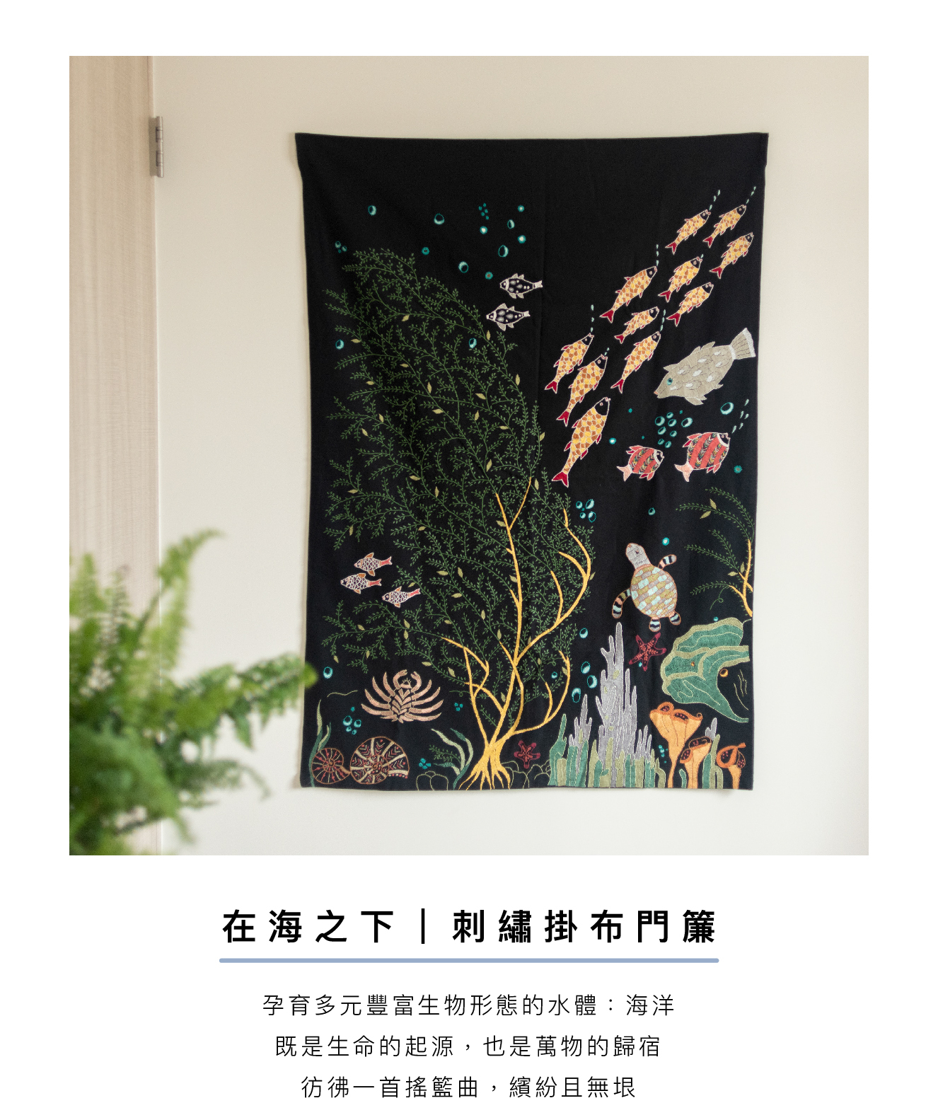 深邃不見光的海洋,水草飄逸,生命吞吐著泡泡,自帶繽紛和閃亮的生物們正在舉行一場神秘的海底派對。來自印度公平貿易組織婦女一針一線的手繡之作,時間是最美的禮物。