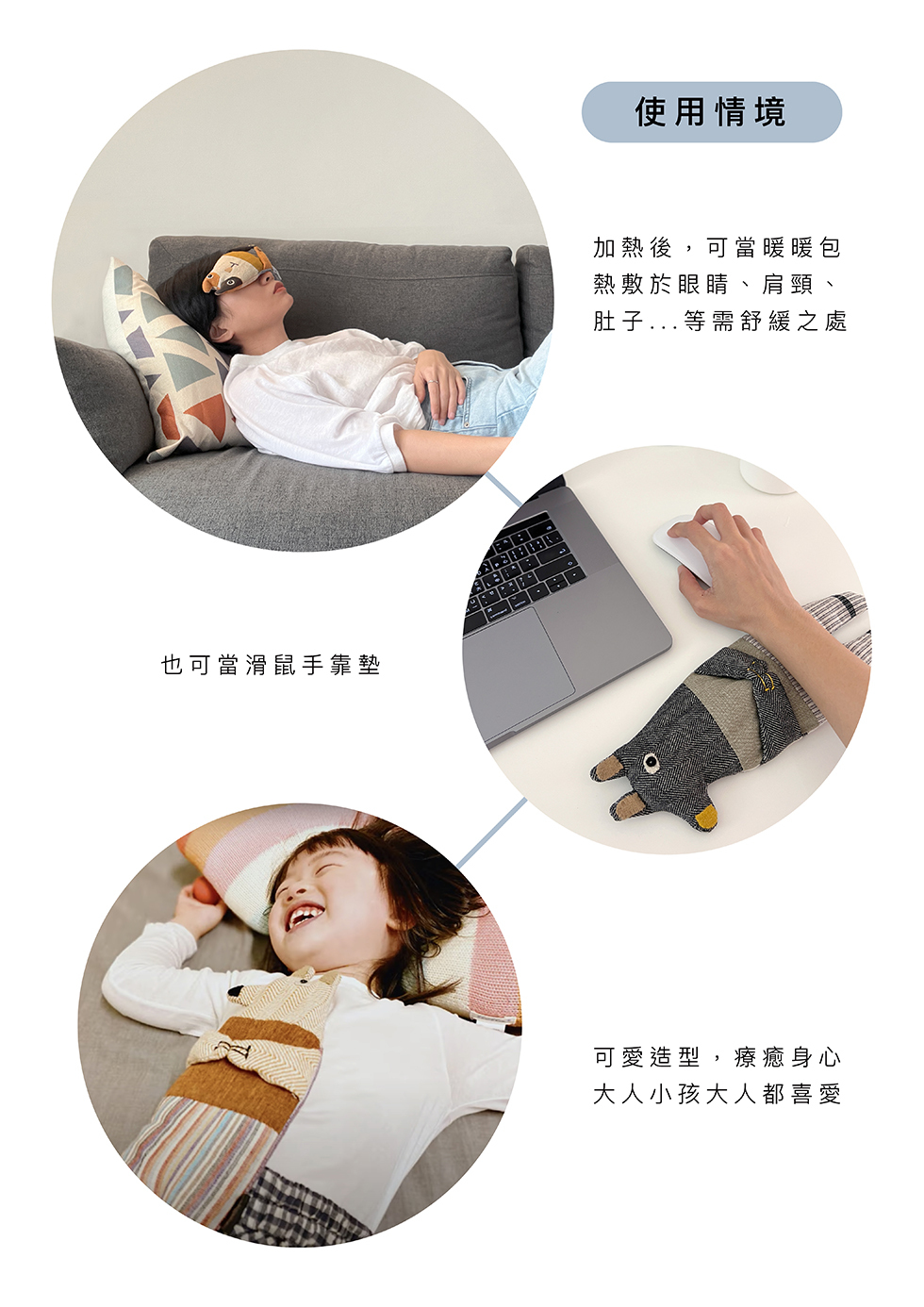 可愛的動物眼枕,除了是一只療癒玩偶,還可加熱作為舒壓眼枕,或熱敷肚子、肩頸...等,平時也可用來當滑鼠手靠墊,用途多多,既療癒又實用。