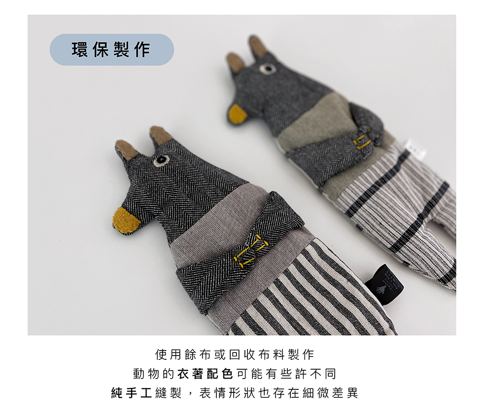 眼枕由公平貿易組織認證的生產者手工縫製,並使用回收布料製作,每一隻衣服的配色都不一樣喔!