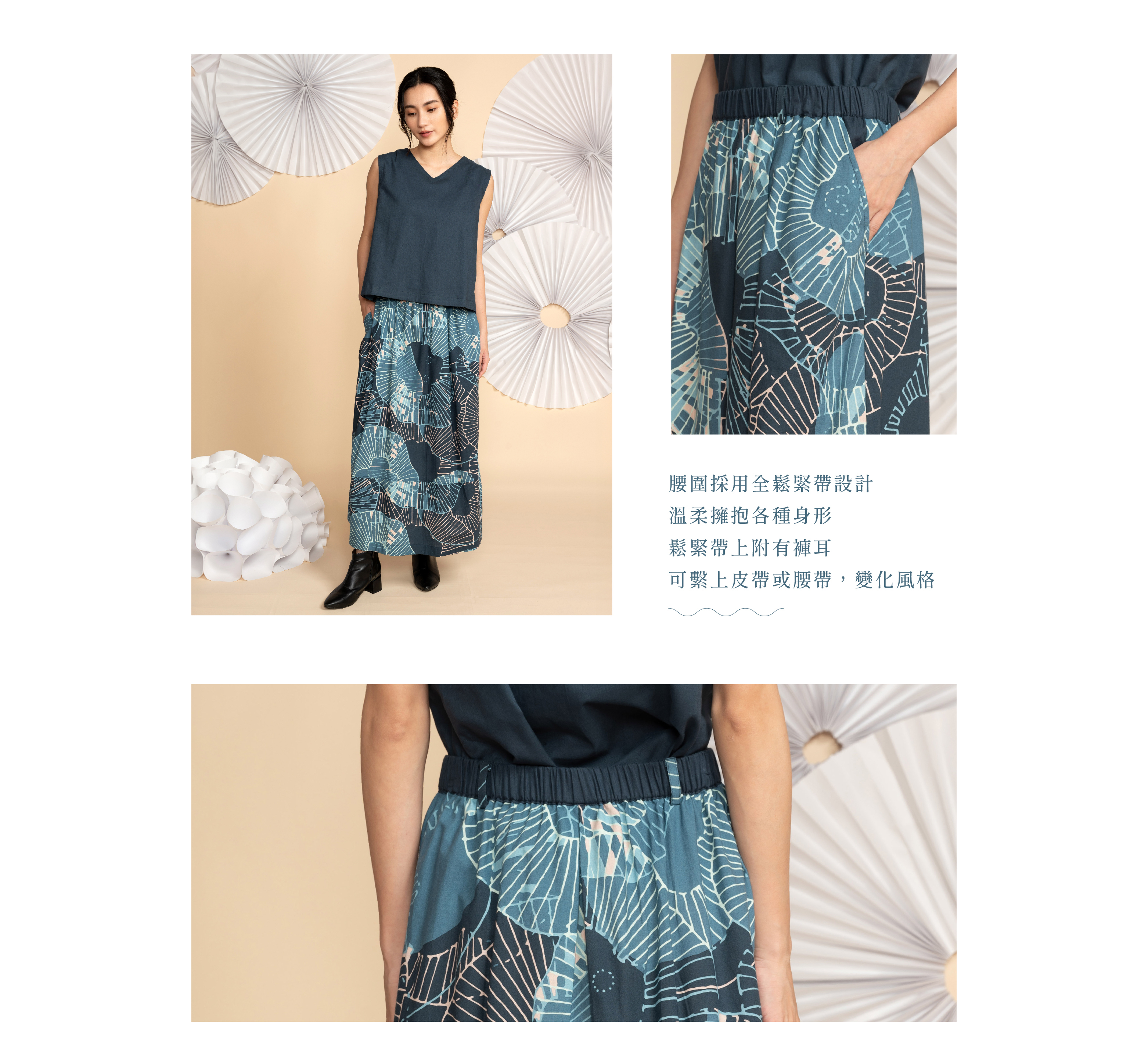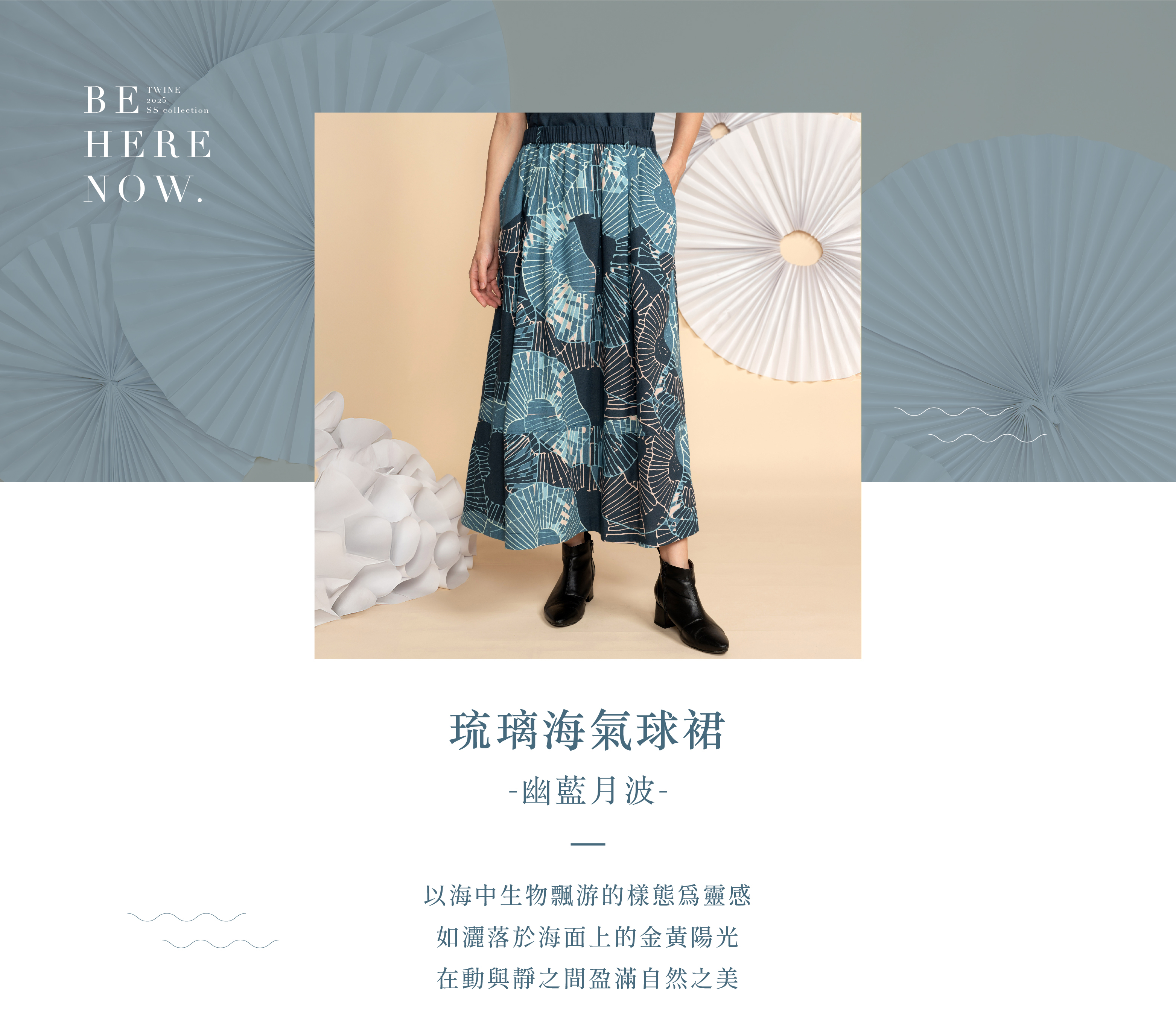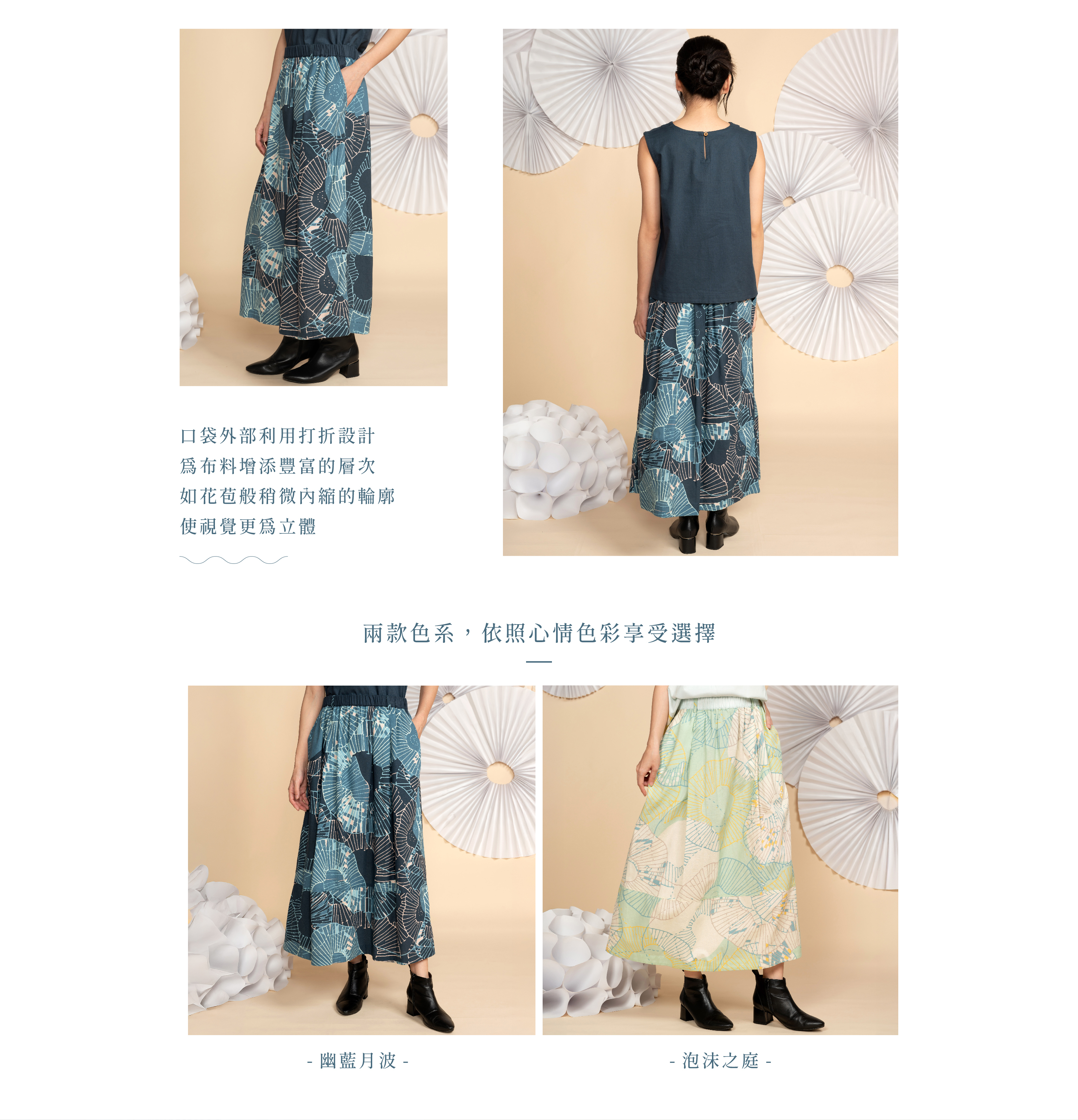 弧形剪接下擺,突破傳統圓裙的印象。內縮的輪廓使摺紋自然流動,如海中生物般、優雅且富有深度。