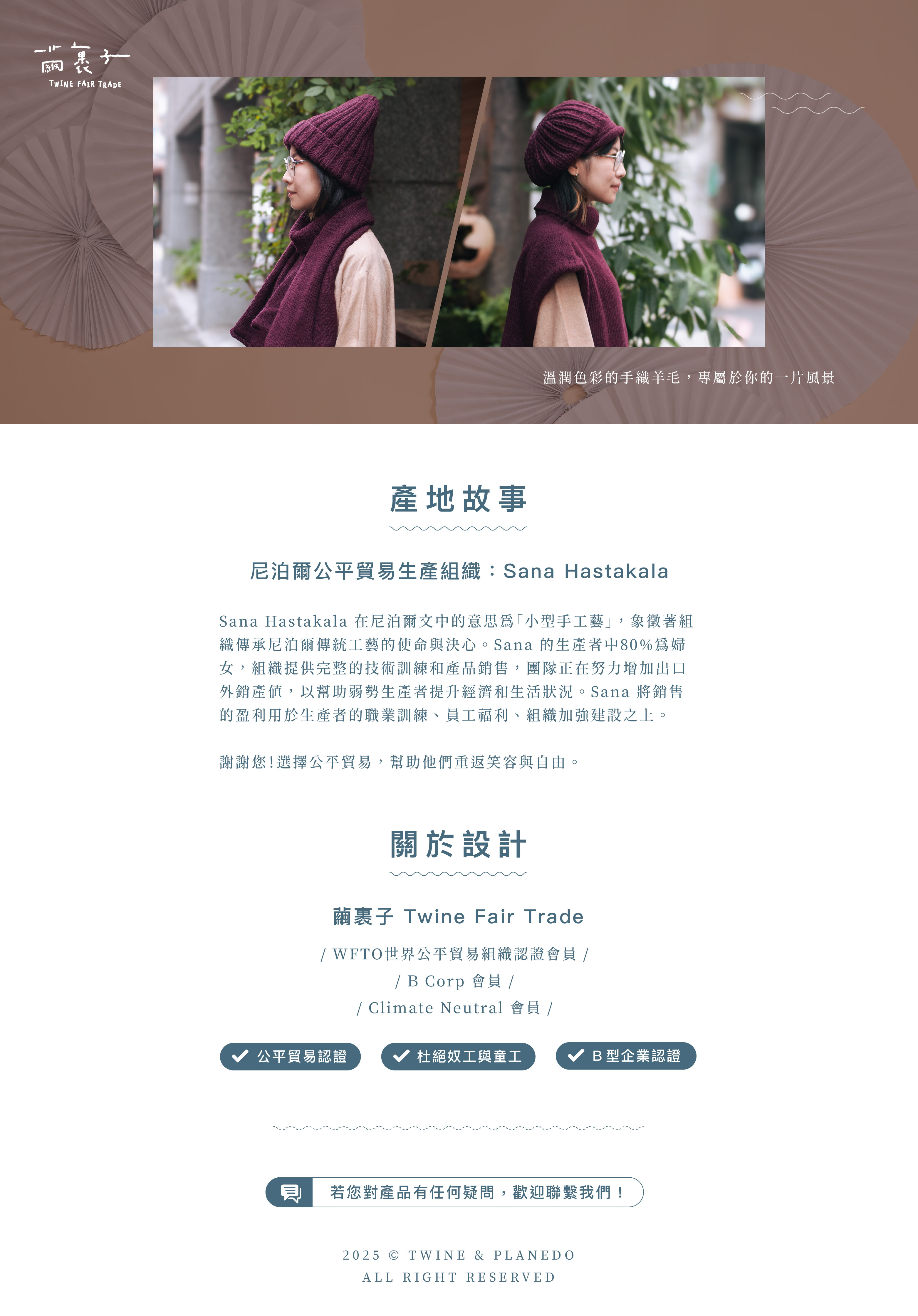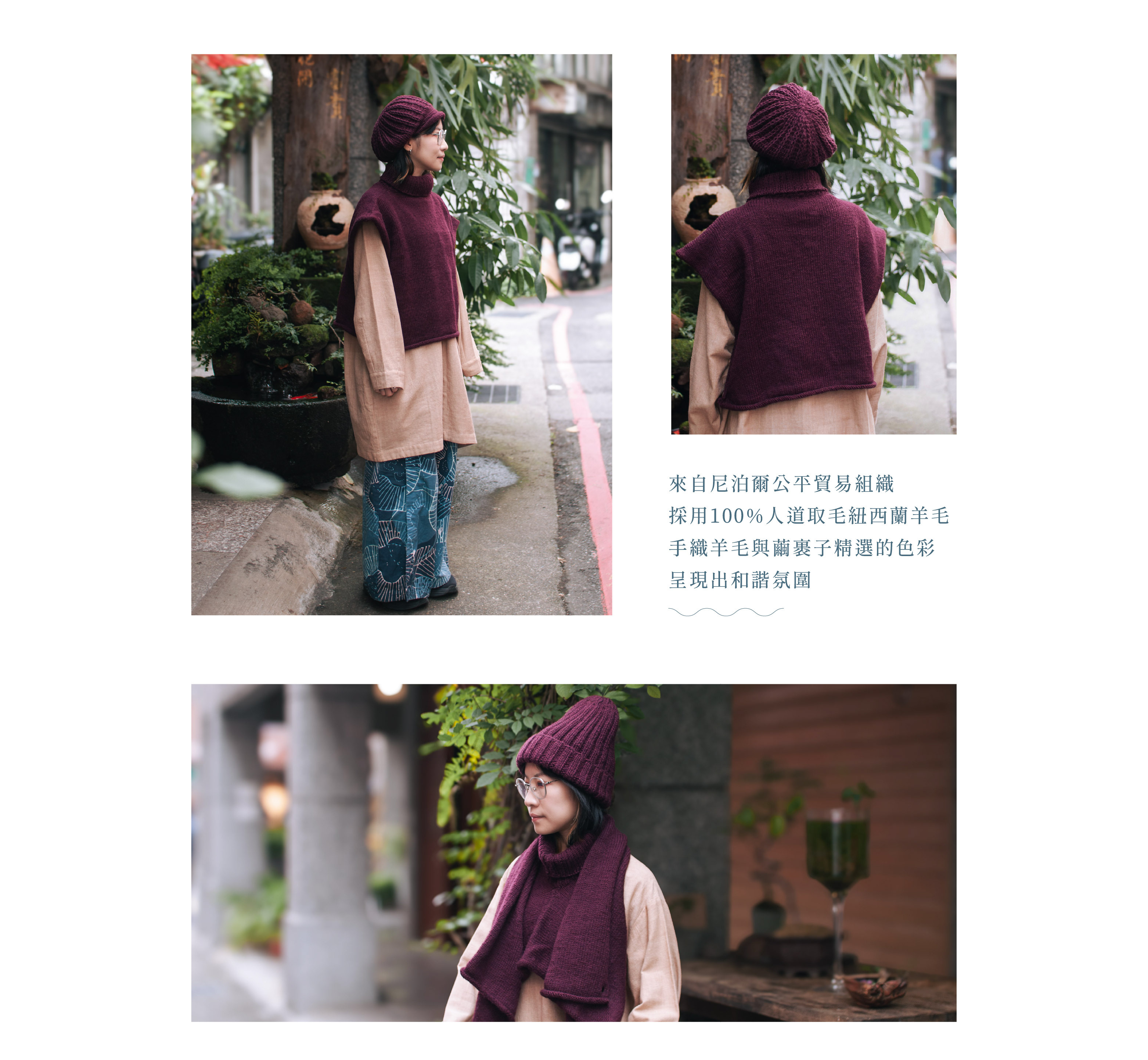 由尼泊爾公平貿易組織的婦女手工鉤織的羊毛針織背心罩衫,透過兩側開釦設計,可當背心、短版長袖罩衫、披肩罩衫、斜開㯲罩衫穿著,多種變化穿法,自由穿搭充滿樂趣。