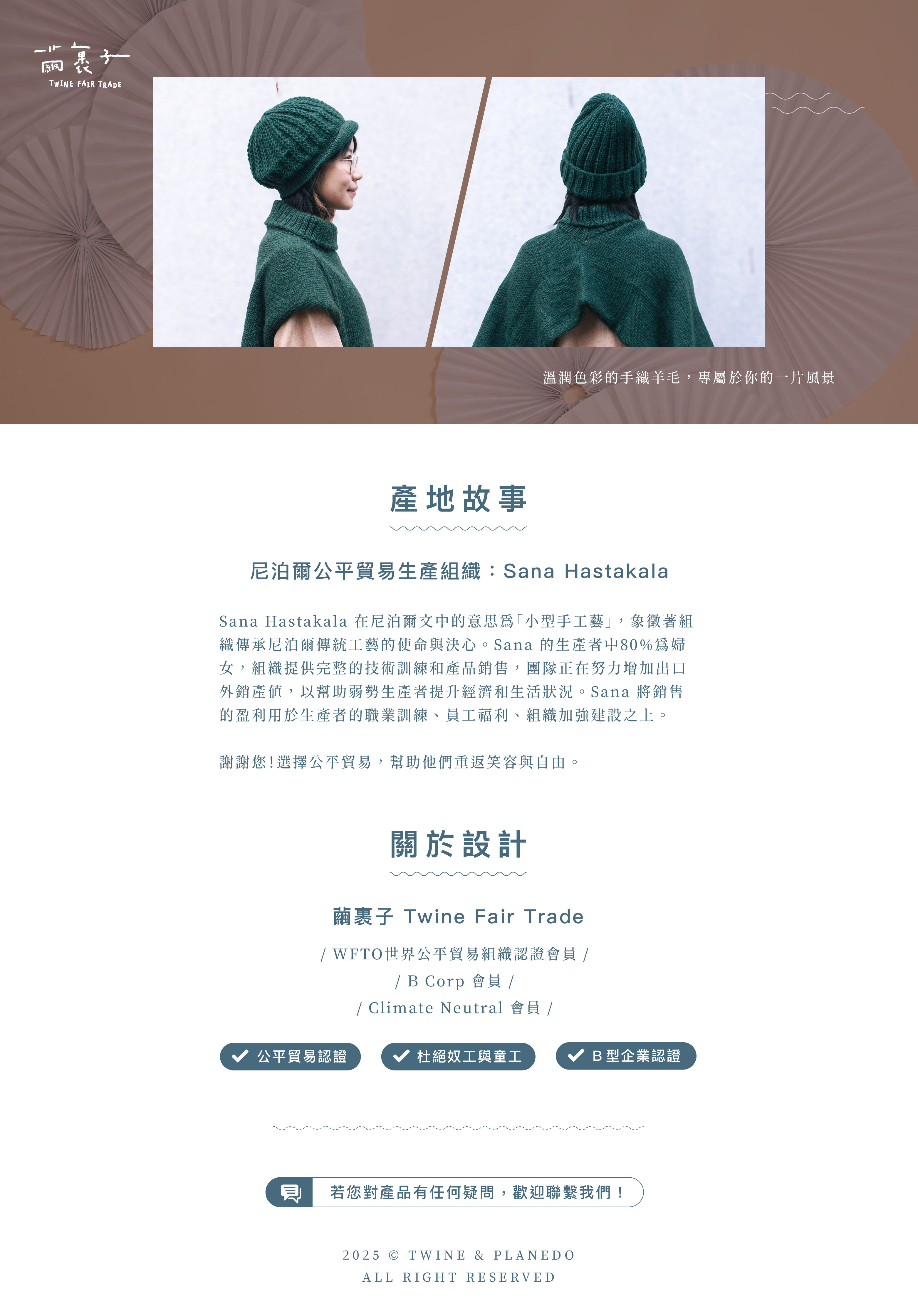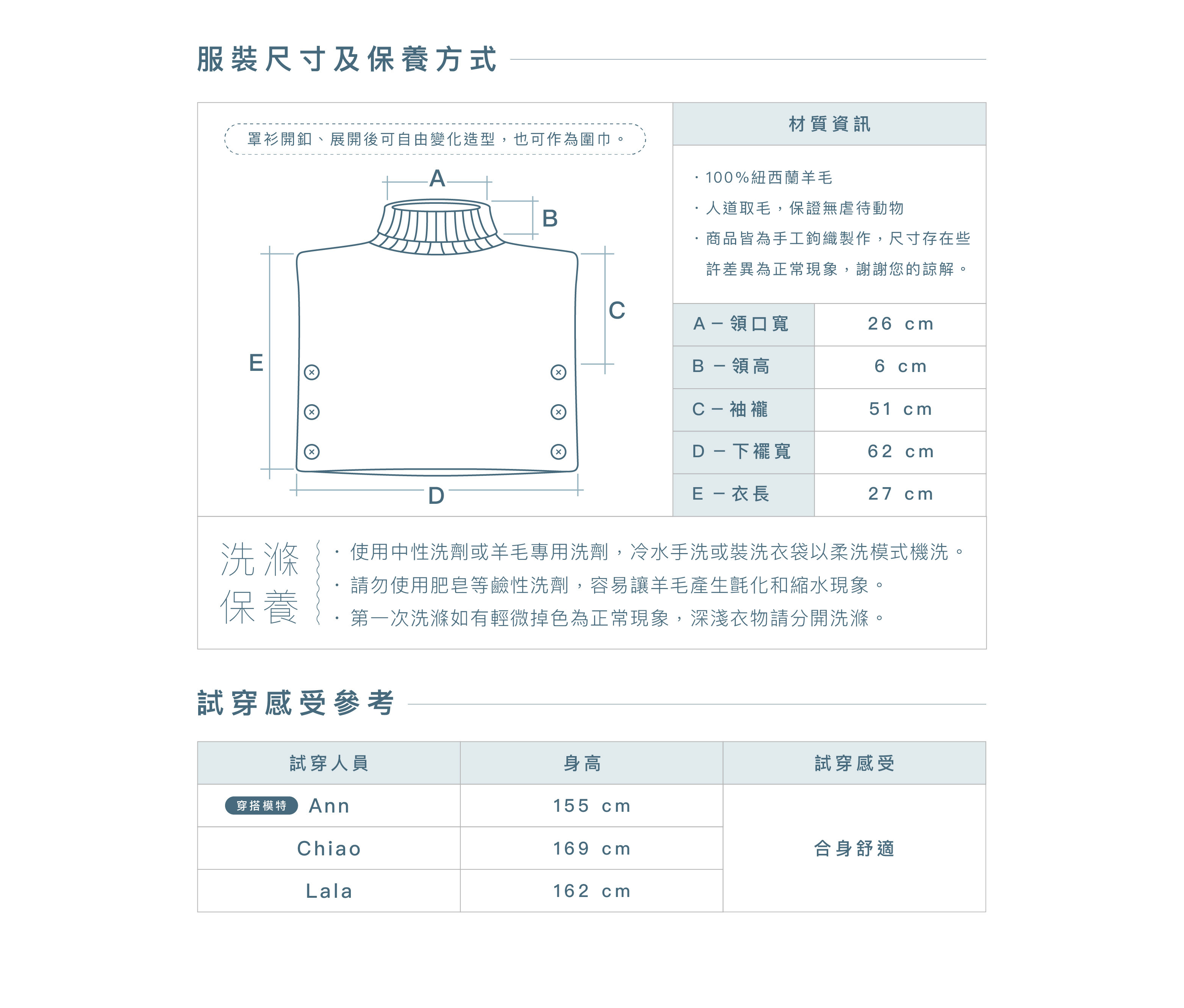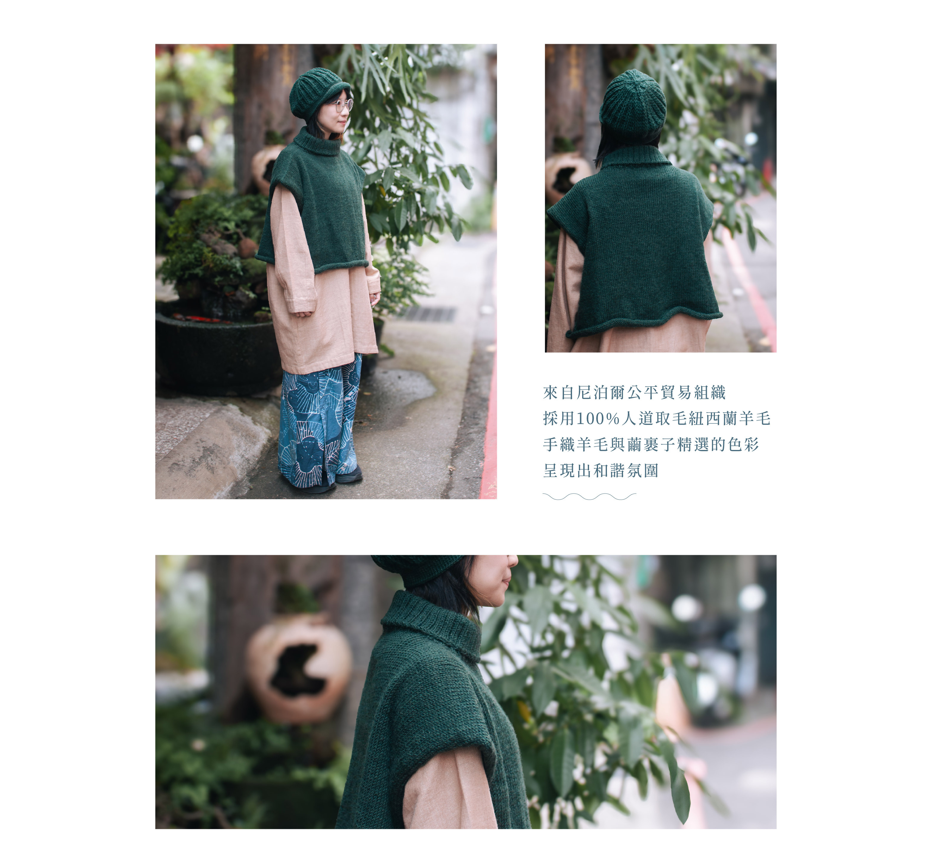 由尼泊爾公平貿易組織的婦女手工鉤織的羊毛針織背心罩衫,透過兩側開釦設計,可當背心、短版長袖罩衫、披肩罩衫、斜開㯲罩衫穿著,多種變化穿法,自由穿搭充滿樂趣。