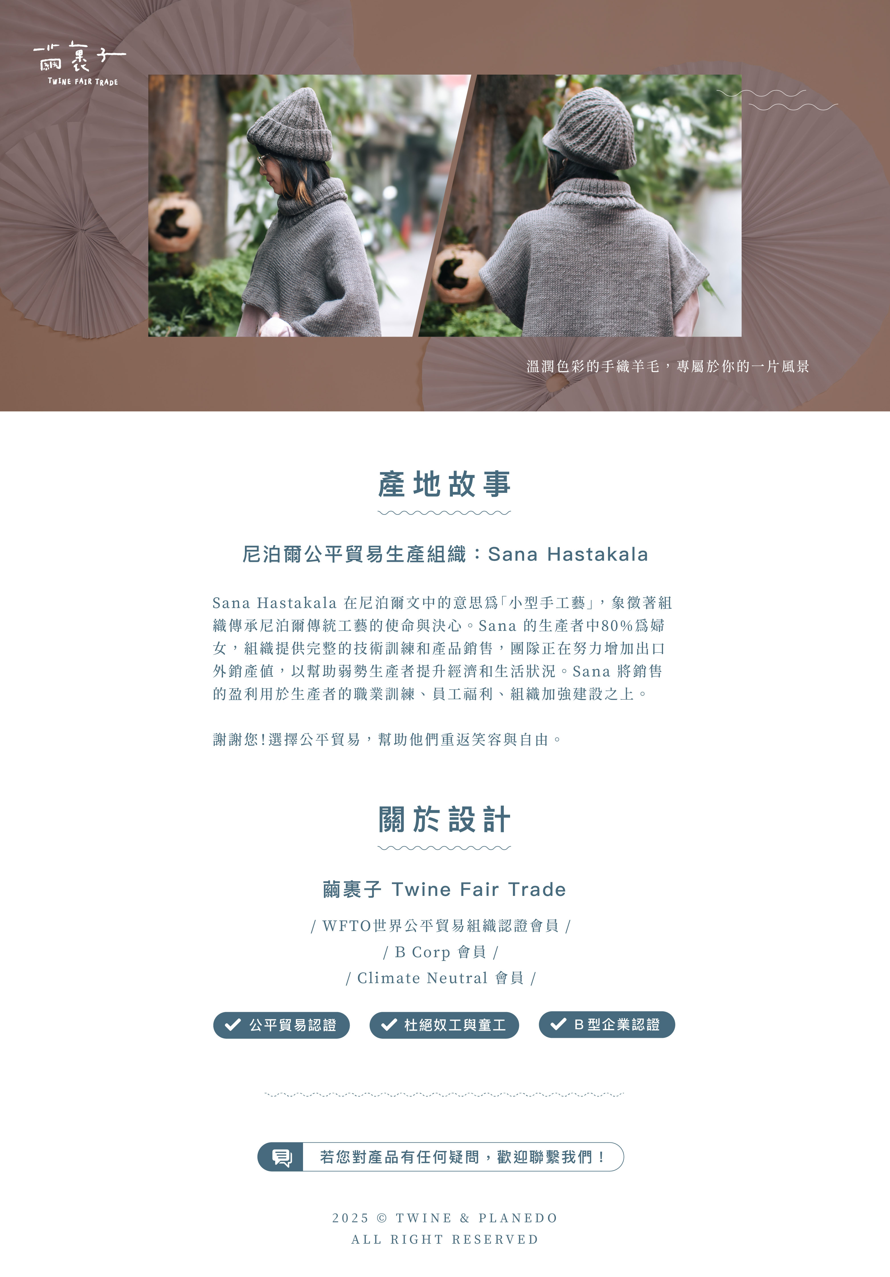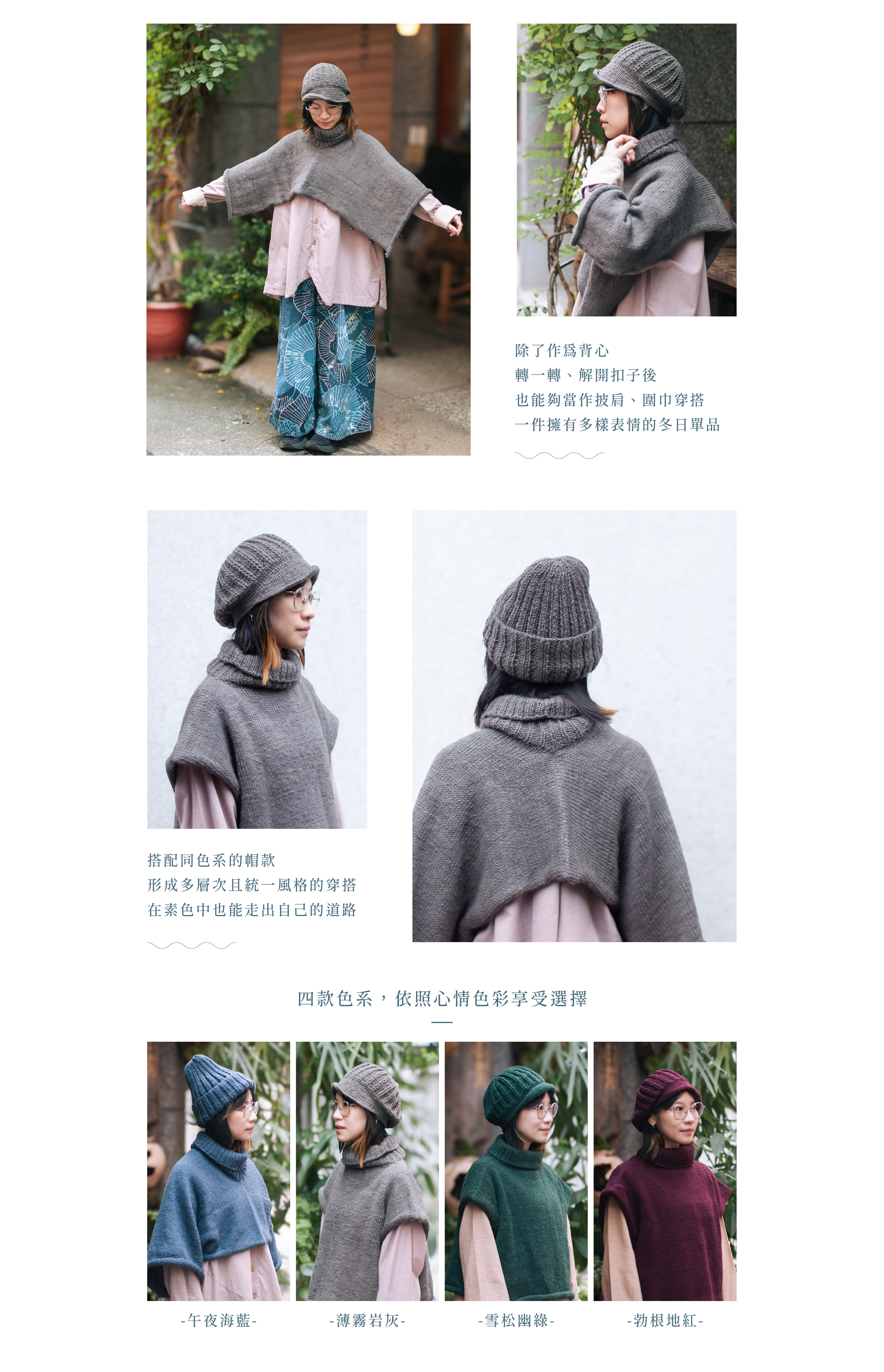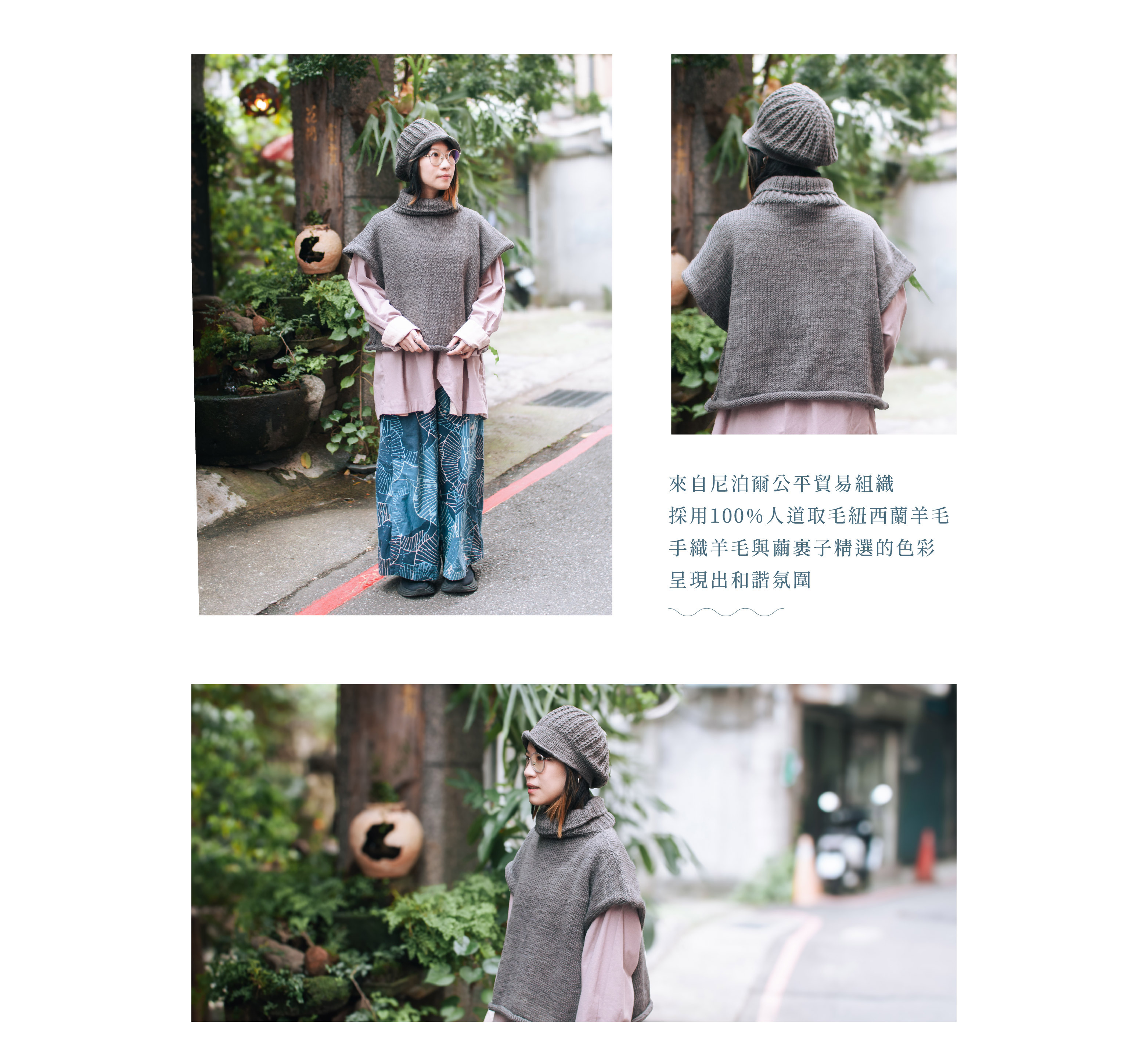 由尼泊爾公平貿易組織的婦女手工鉤織的羊毛針織背心罩衫,透過兩側開釦設計,可當背心、短版長袖罩衫、披肩罩衫、斜開㯲罩衫穿著,多種變化穿法,自由穿搭充滿樂趣。