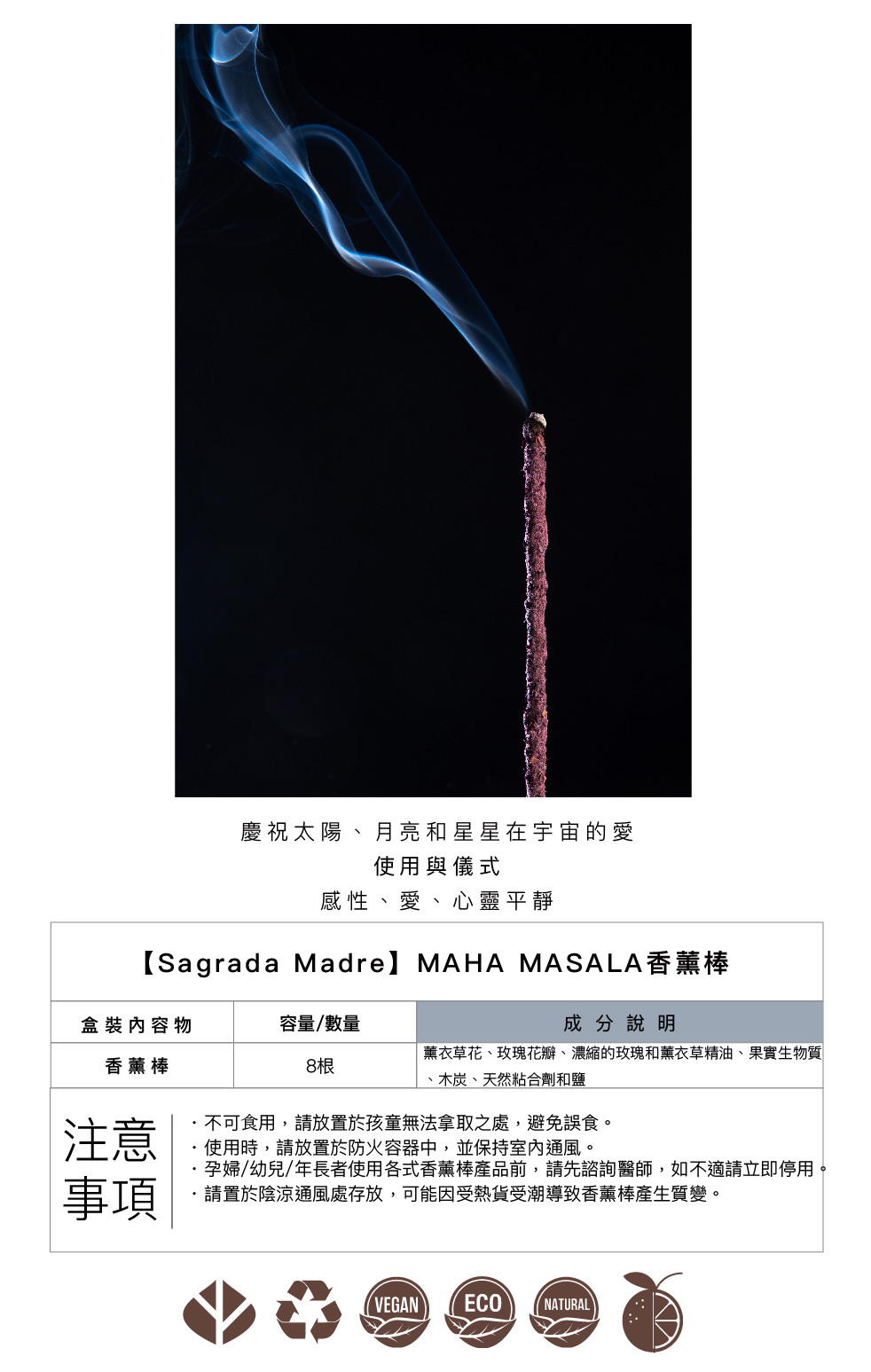 當MASALA混合物的成分香氣交織時,創造出一種強大的和諧,充滿了周遭的環境。MASALA香薰棒擁有太陽、月亮和星星的能量。