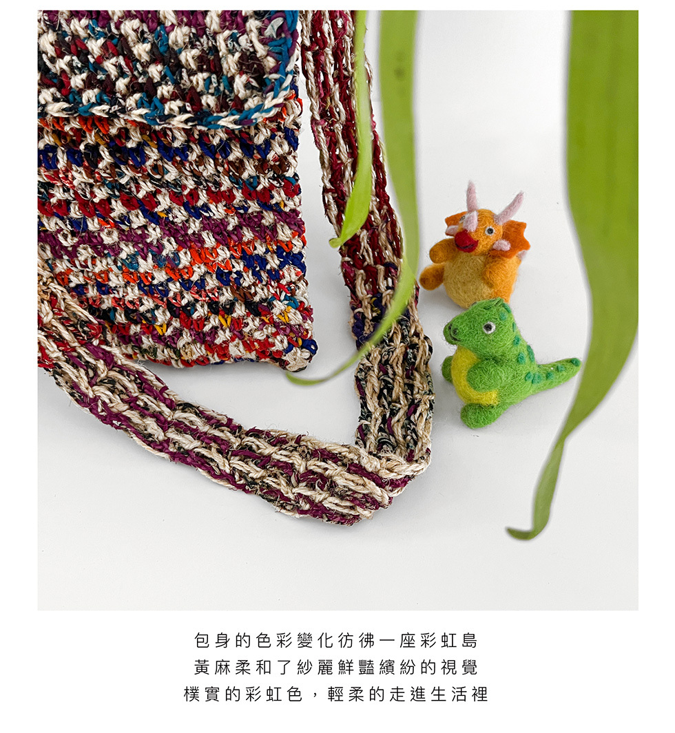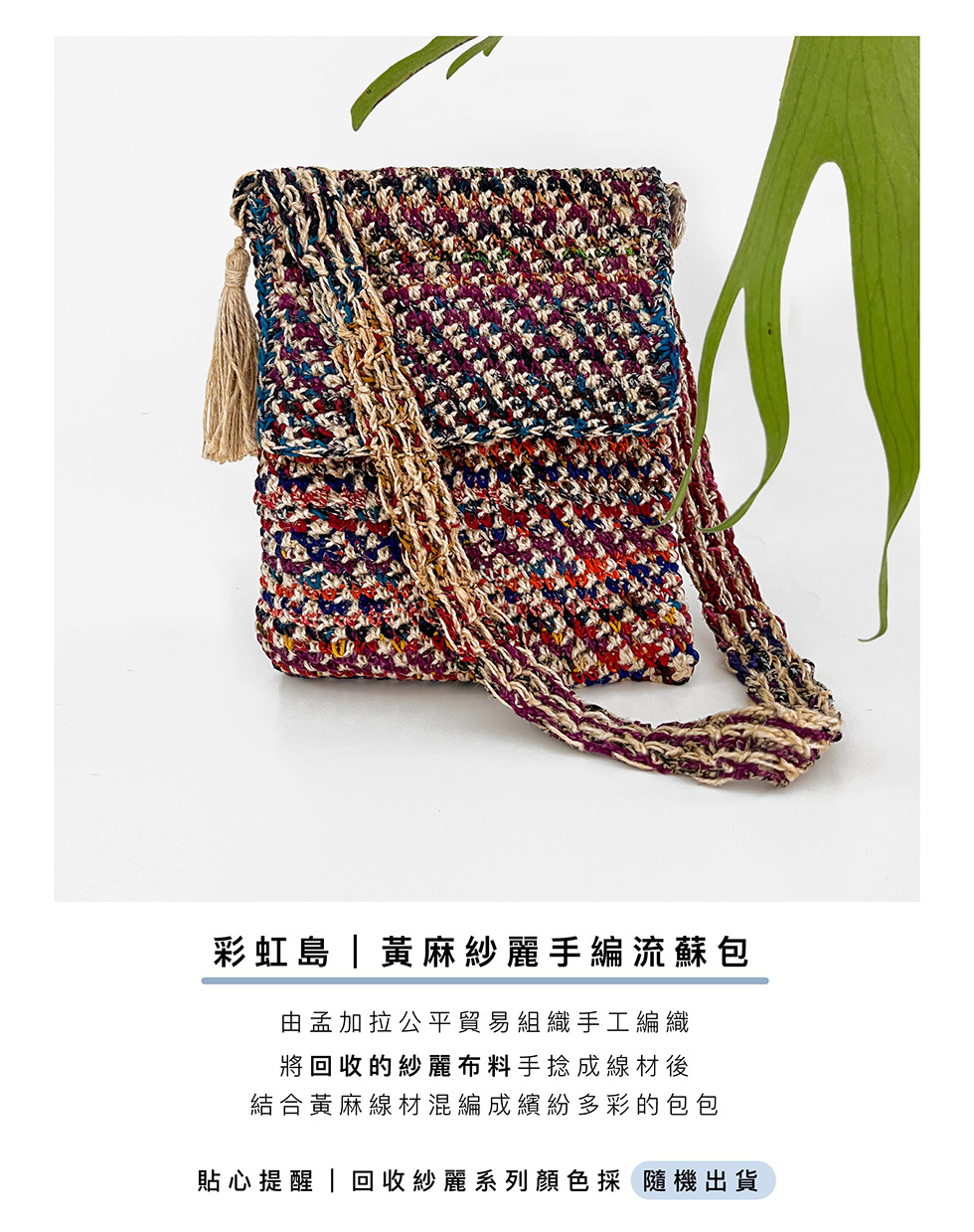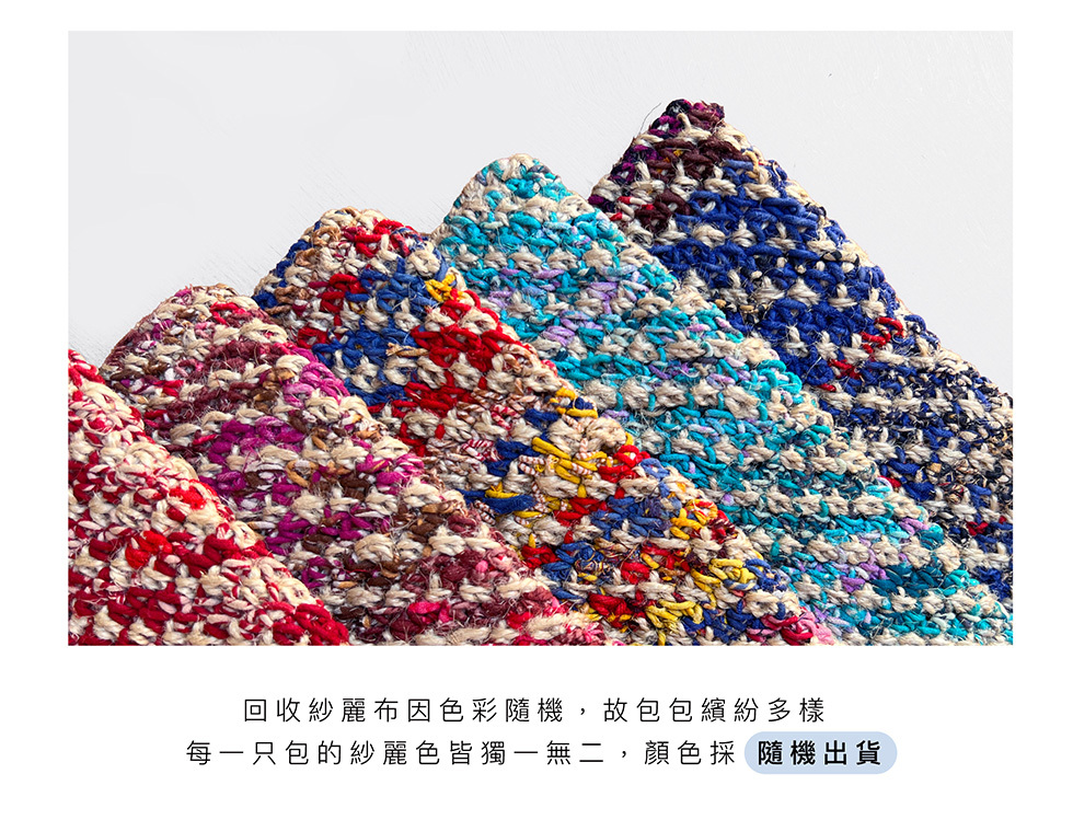 由孟加拉公平貿易組織手工編織,將回收的紗麗布料手捻成線材後,再將線材編織成繽紛多彩的隨身包,每一只包的顏色獨一無二,專屬於你的島嶼色彩。
