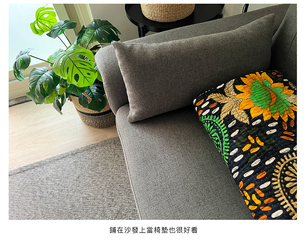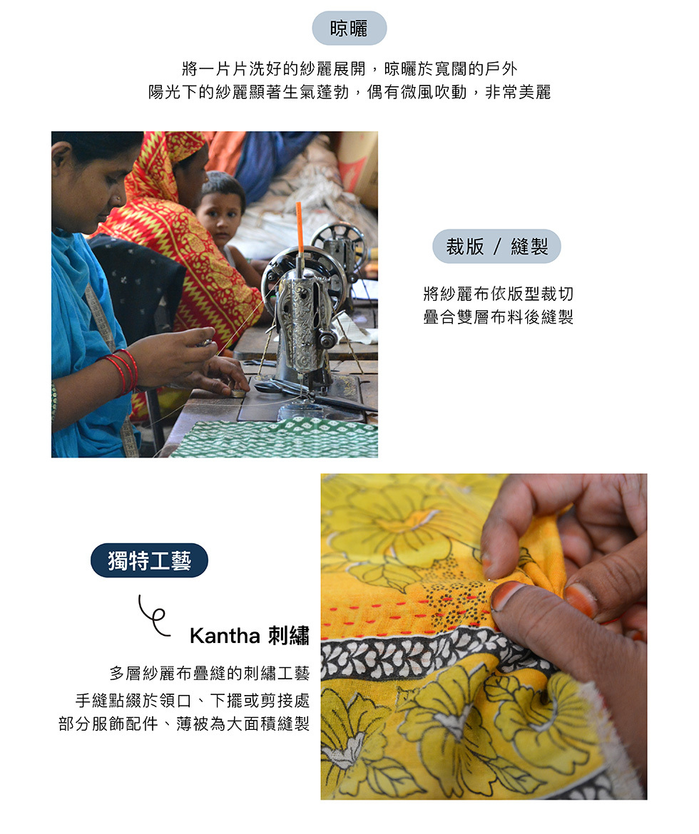 由孟加拉公平貿易組織製作,北孟加拉的婦女親手縫製的紗麗被,婦女們靠自己的雙手維持一家的生活,將回收印度極具特色的紗麗布料,製成適合日常生活使用的物件,天馬行空的印花設計,來自印度人的浪漫,內外不同印花疊合縫製,可雙面使用,不重複的特性也帶來獨特性,立刻擁有一件專屬於你的紗麗薄被吧!