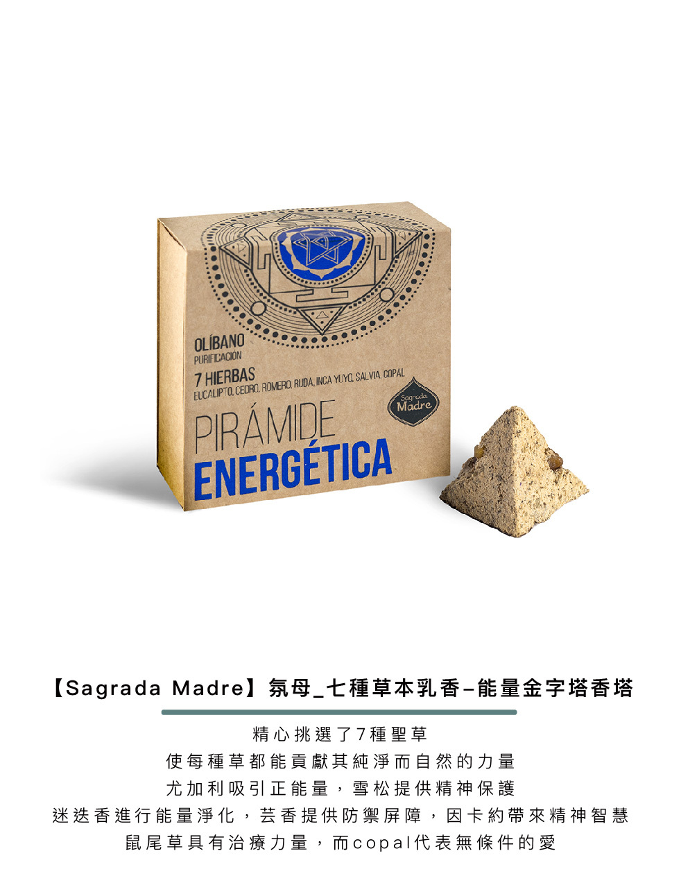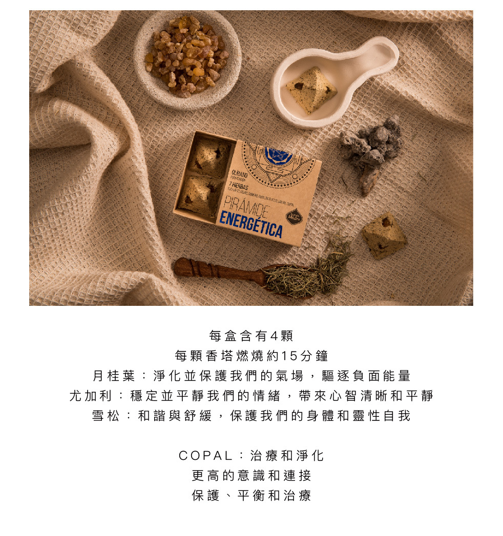 精心挑選七種聖草,使每種草都能貢獻其純淨而自然的力量。尤加利吸引正能量,雪松提供精神保護,迷迭香進行能量淨化,芸香提供防禦屏障,因卡約帶來精神智慧,鼠尾草具有治療力量,而copal代表無條件的愛。
