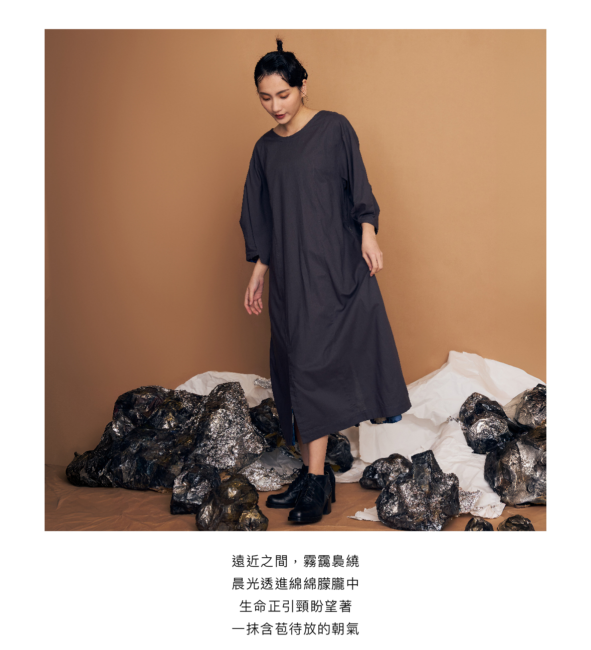 隨附的綁帶可輕繫腰間拉出腰間輪廓,一件自在隨性的美麗長洋裝。面料為100%有機棉,體感舒適輕鬆。