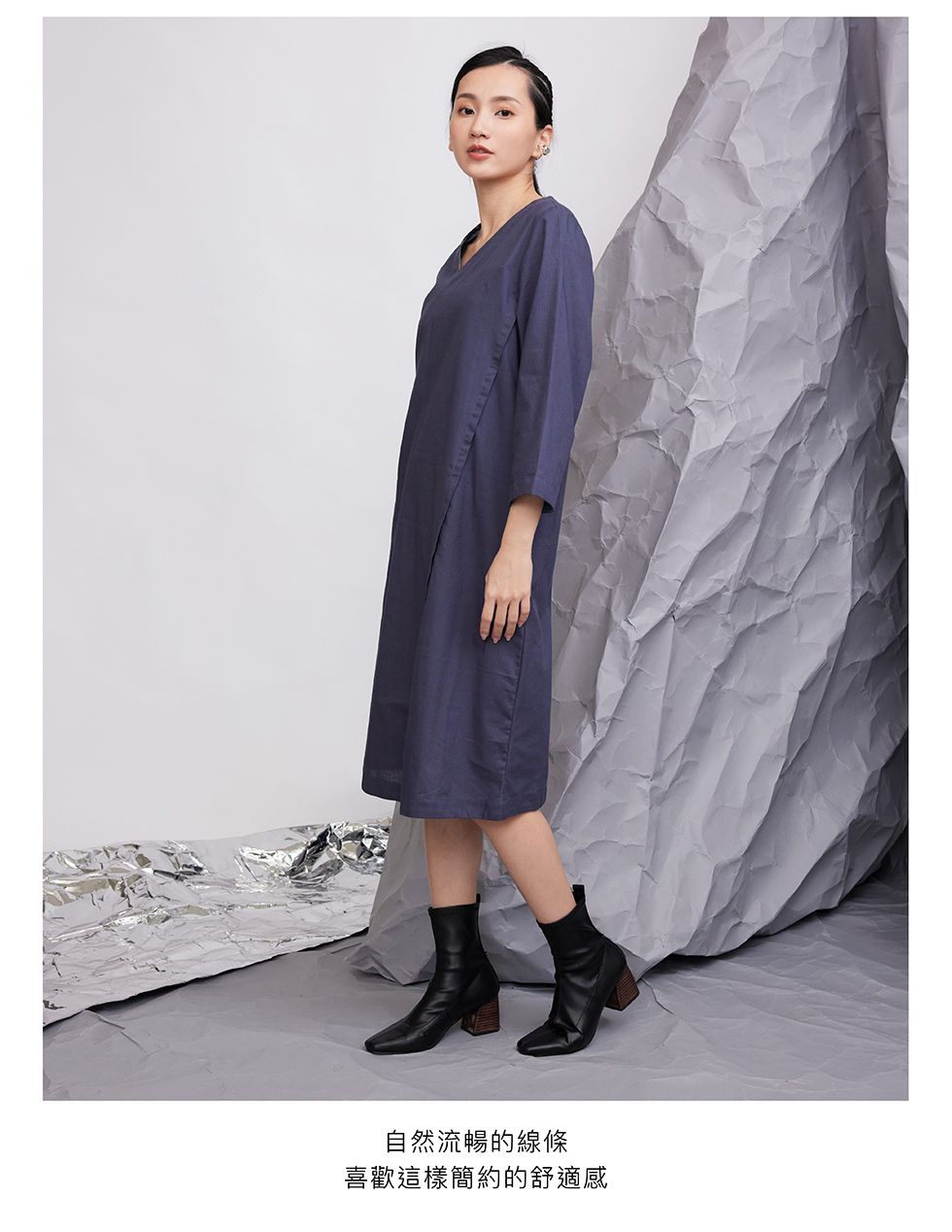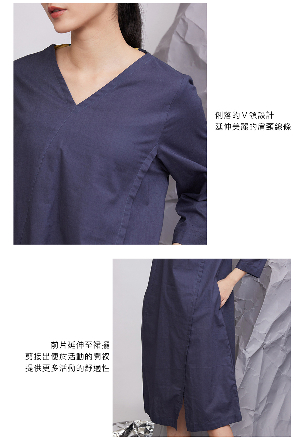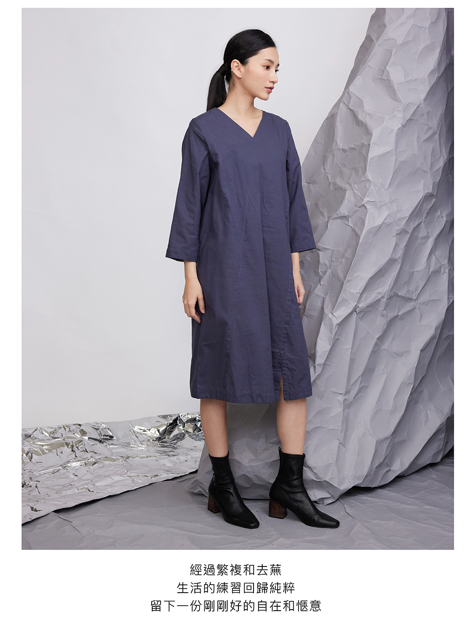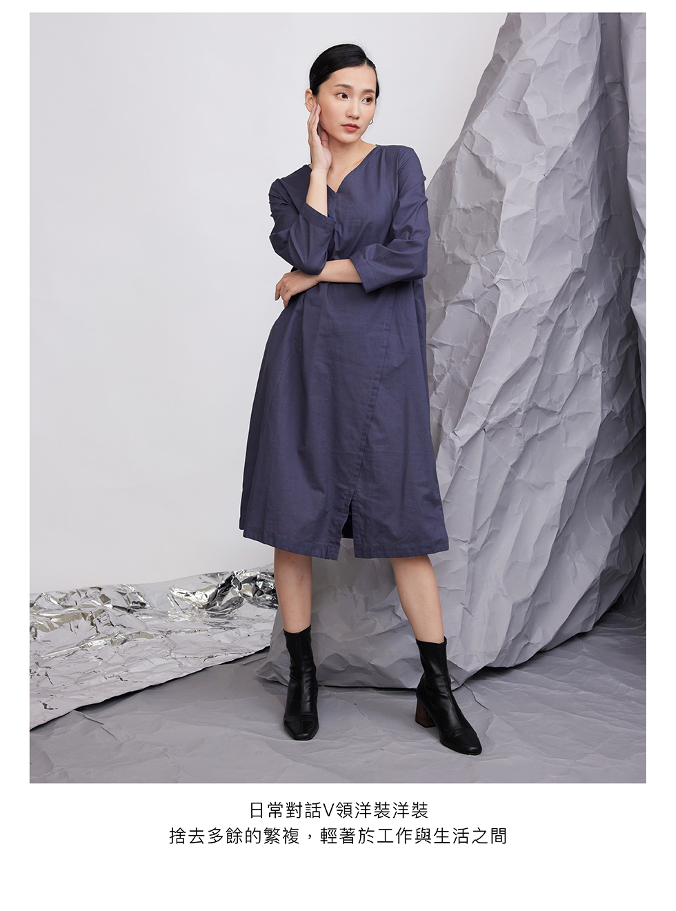 日常對話V領斜褶長袖洋裝_寧靜深海